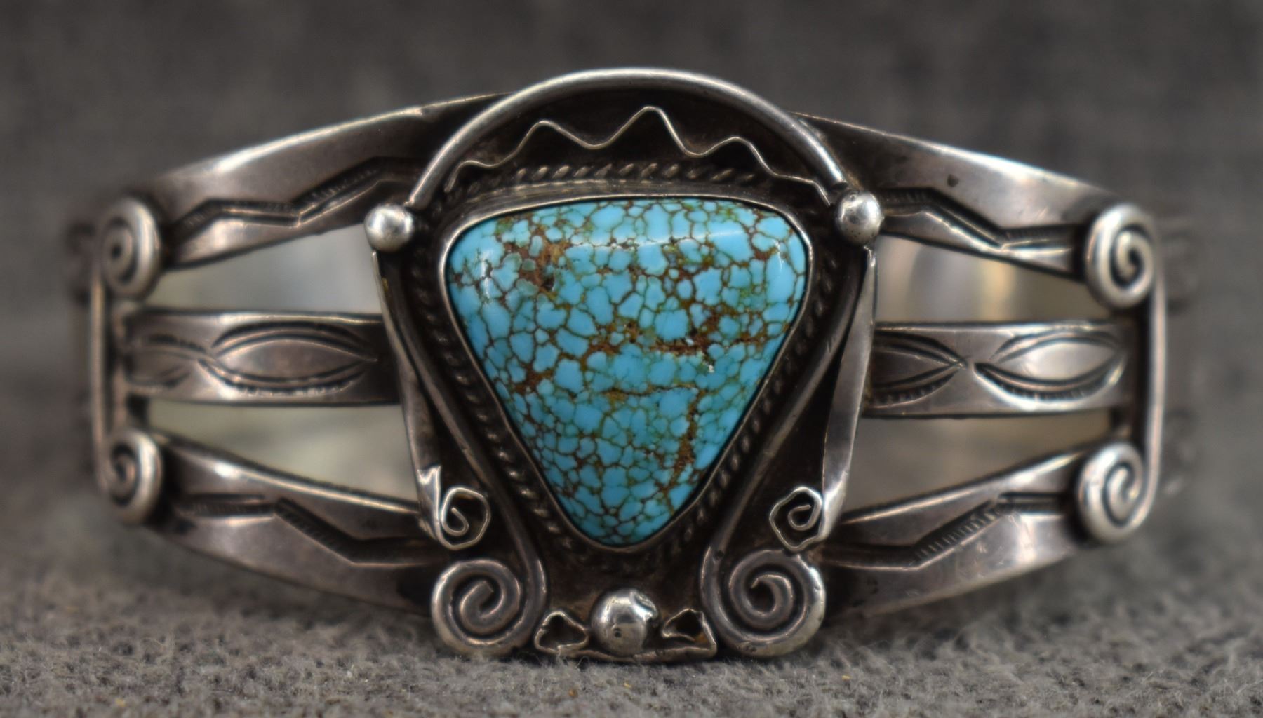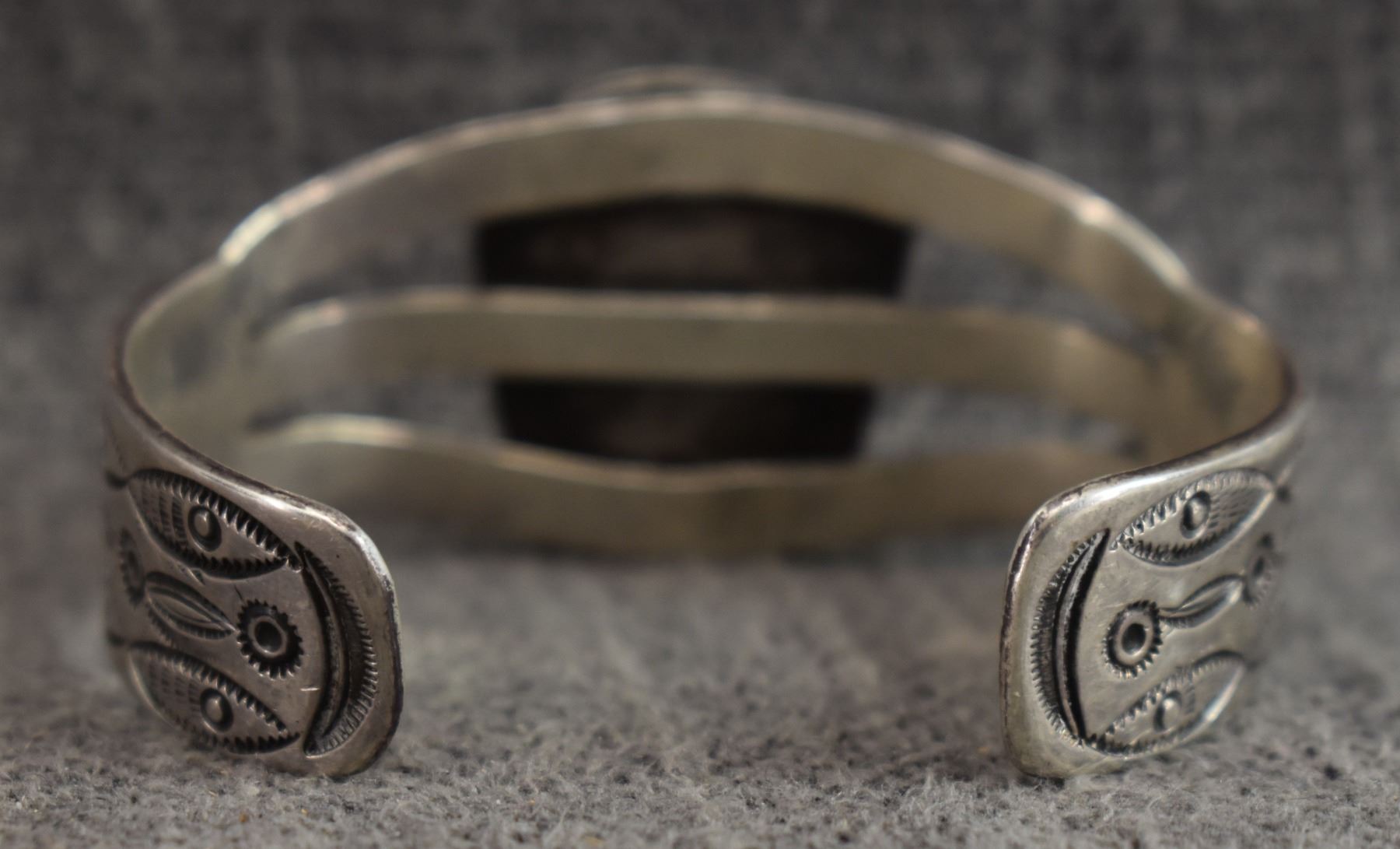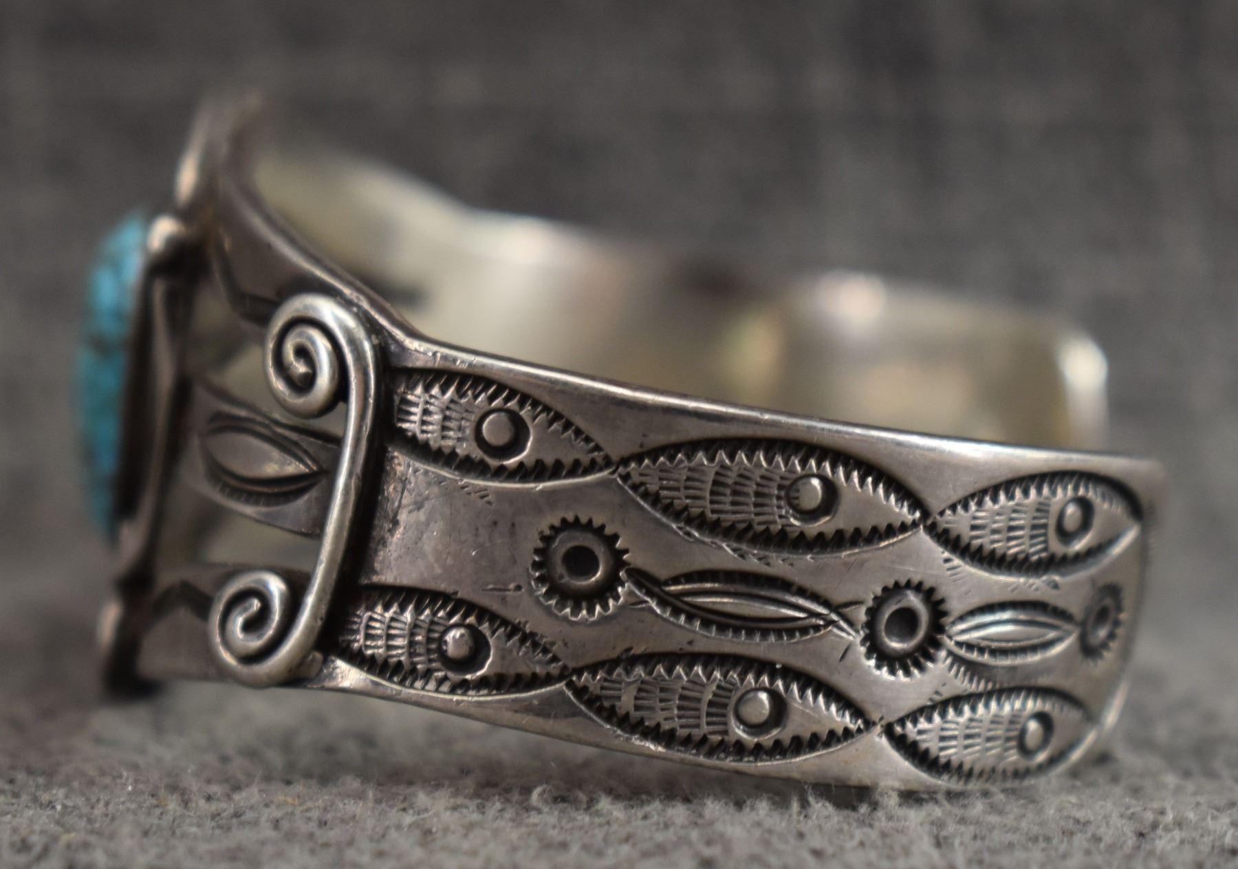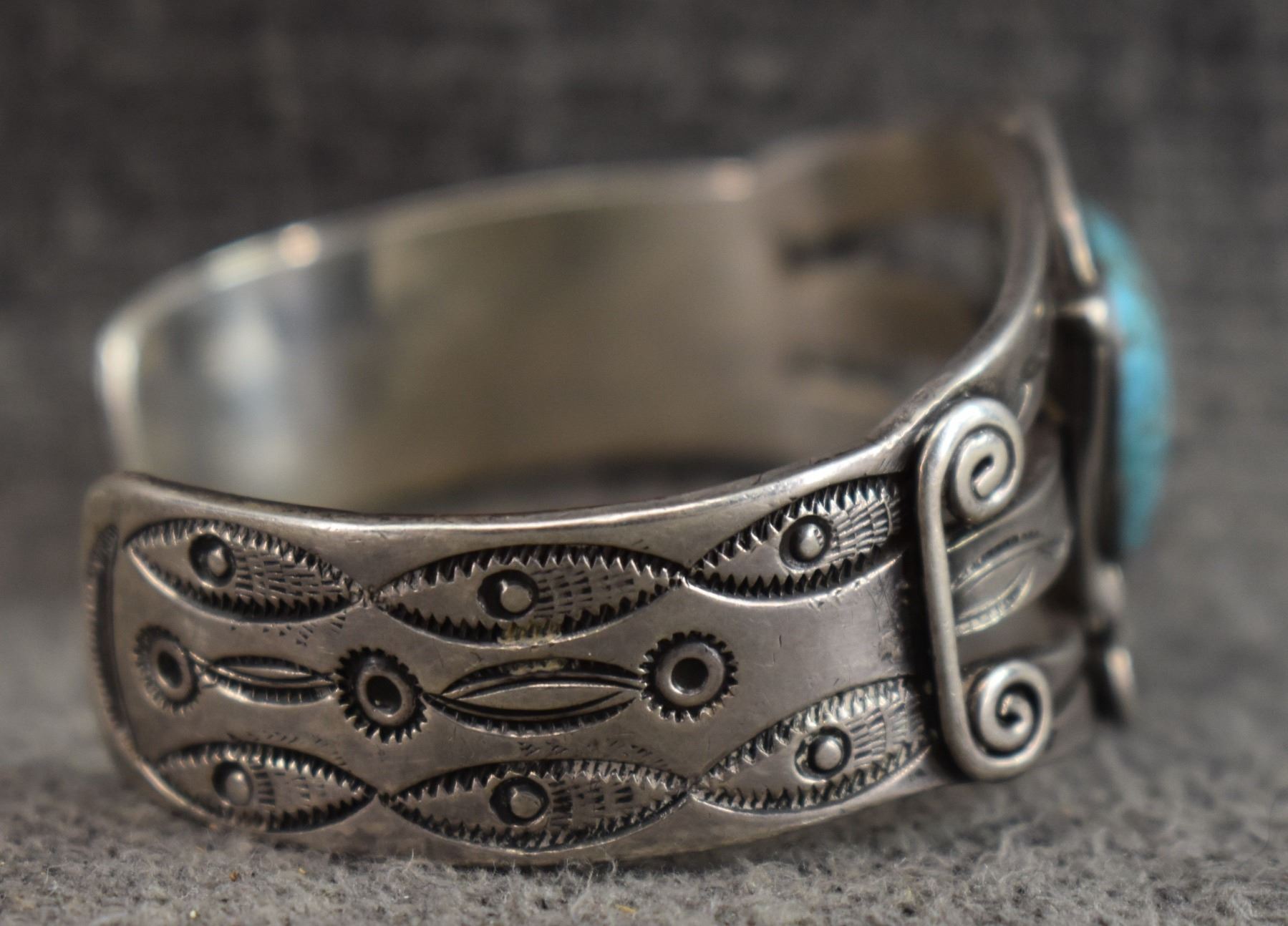 1940-50's Navajo, Sterling silver stamped design with turquoise stone 1" x 5.25" x 1.25" total weight 42 grams