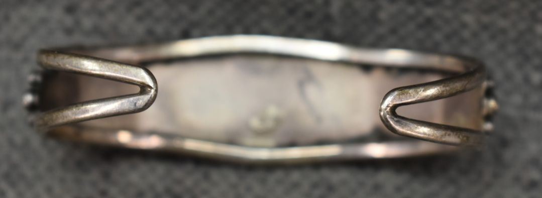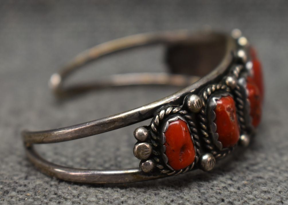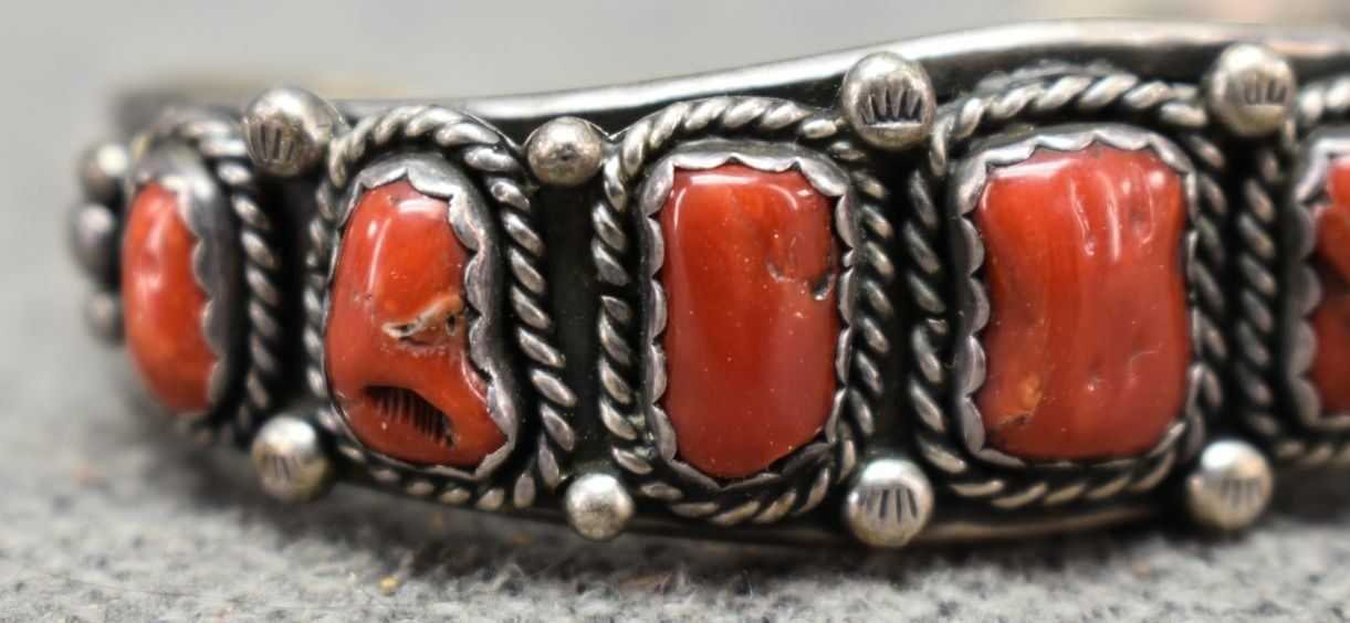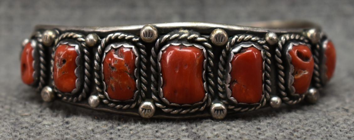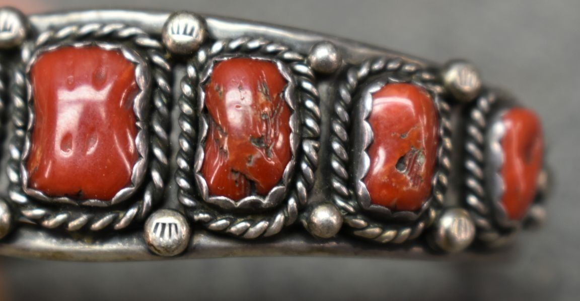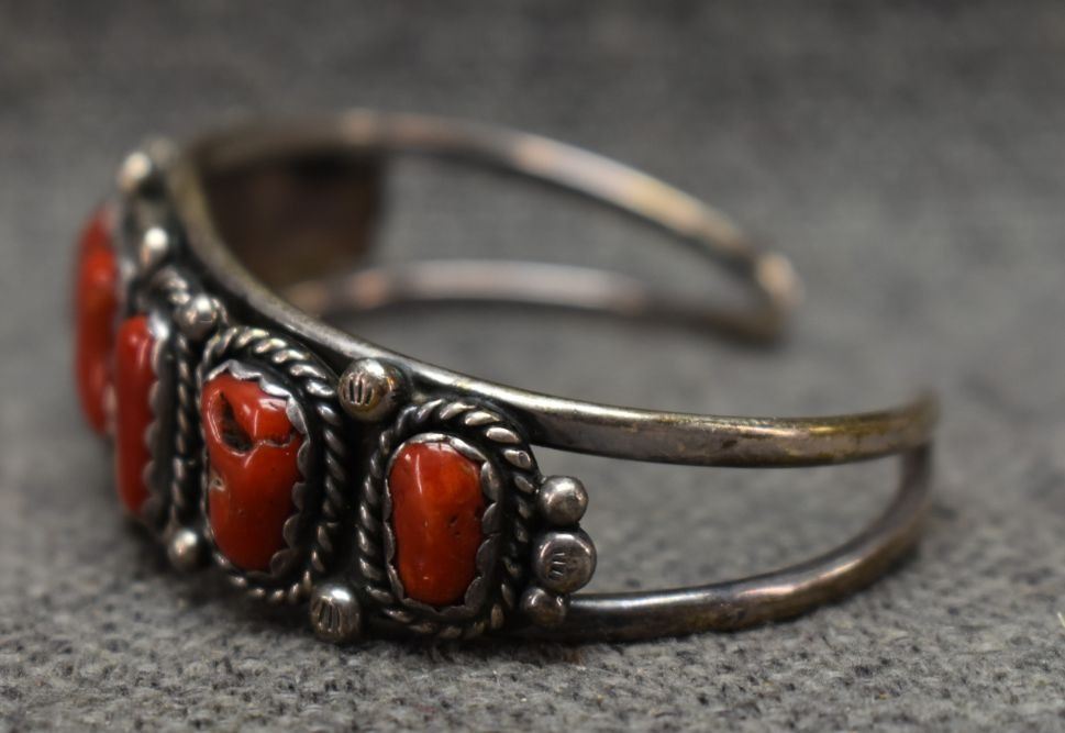 1970's Navajo, sterling silver bracelet with stamped design and coral. Unsigned. .75"x 5.5" x 1.25" 31 grams