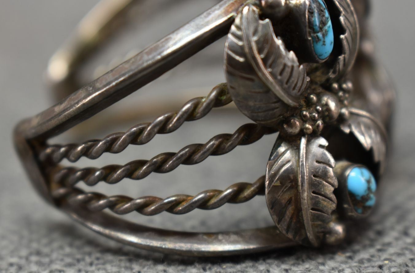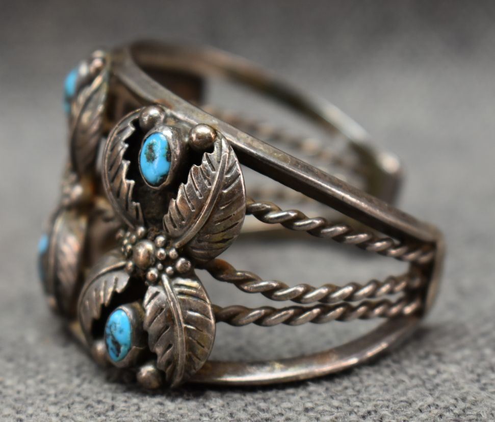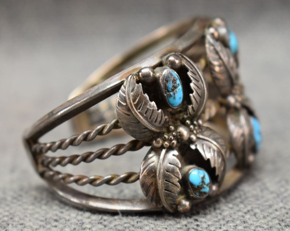 1970's Navajo, Stearling silver and turquoise with leaf applique. 1.5" x 5.25" x 1.25" 65 grams has cracked stone