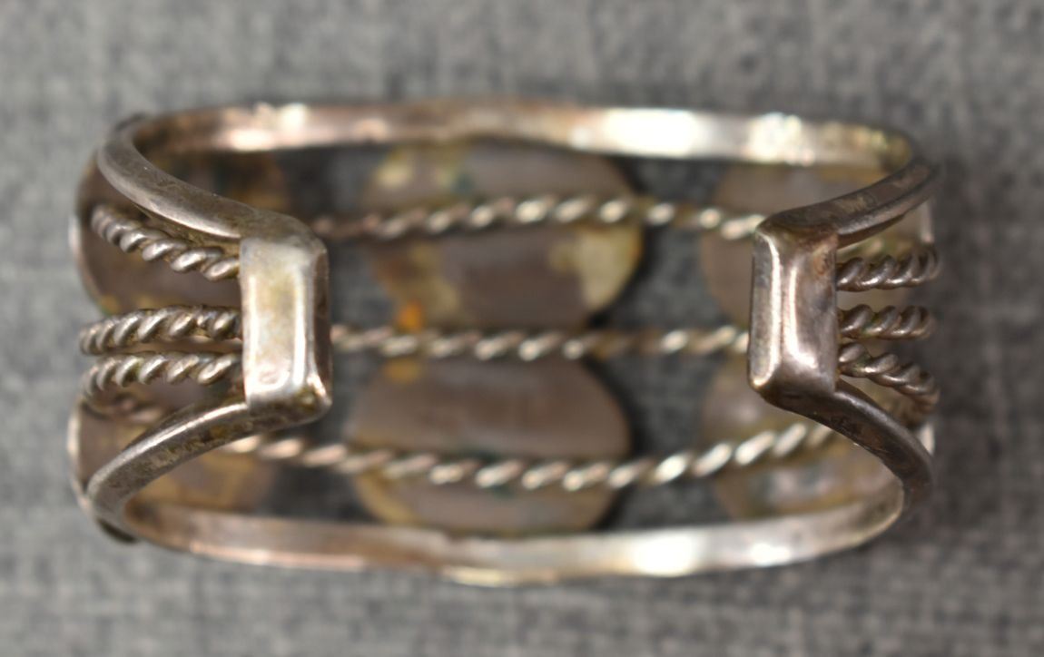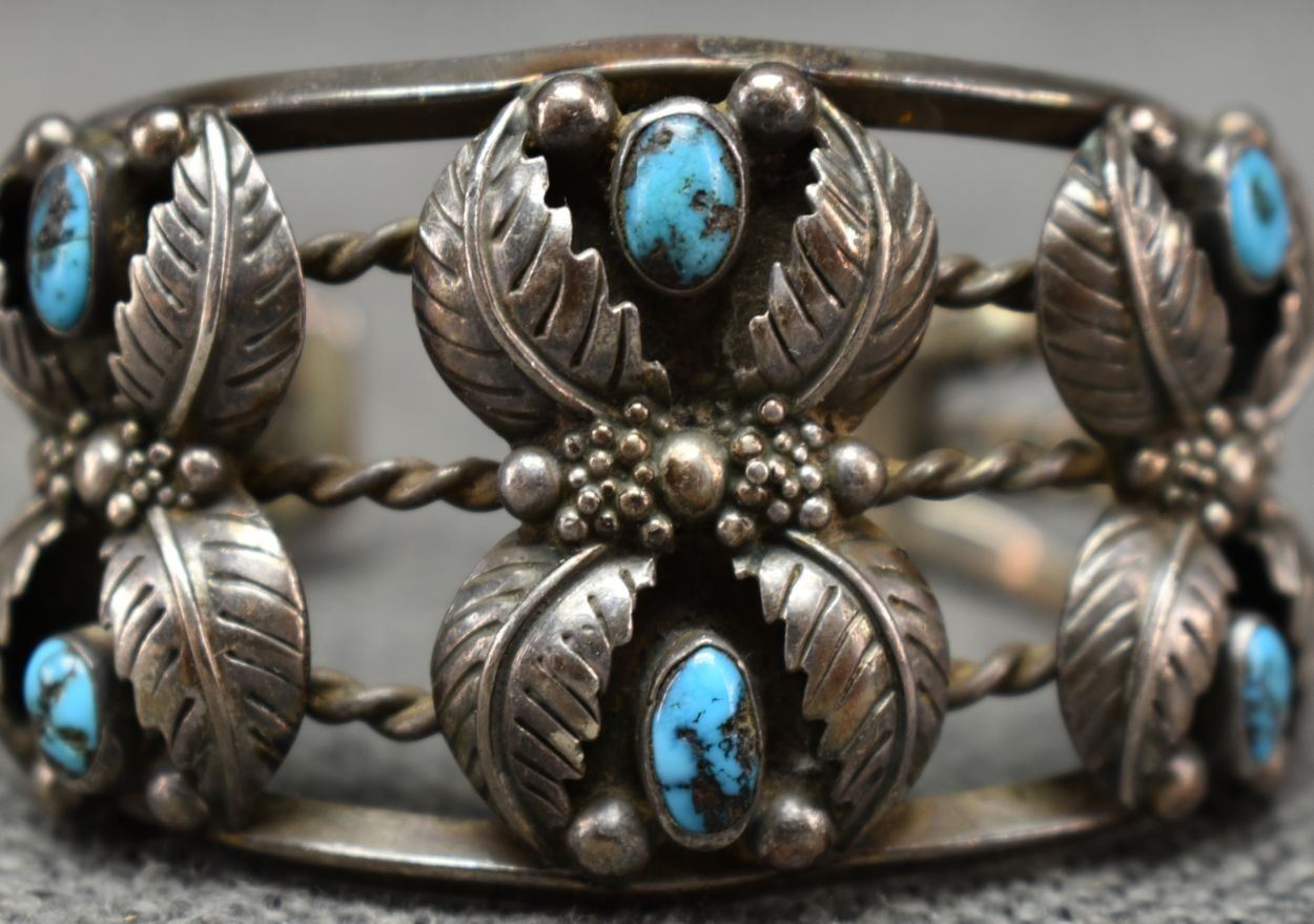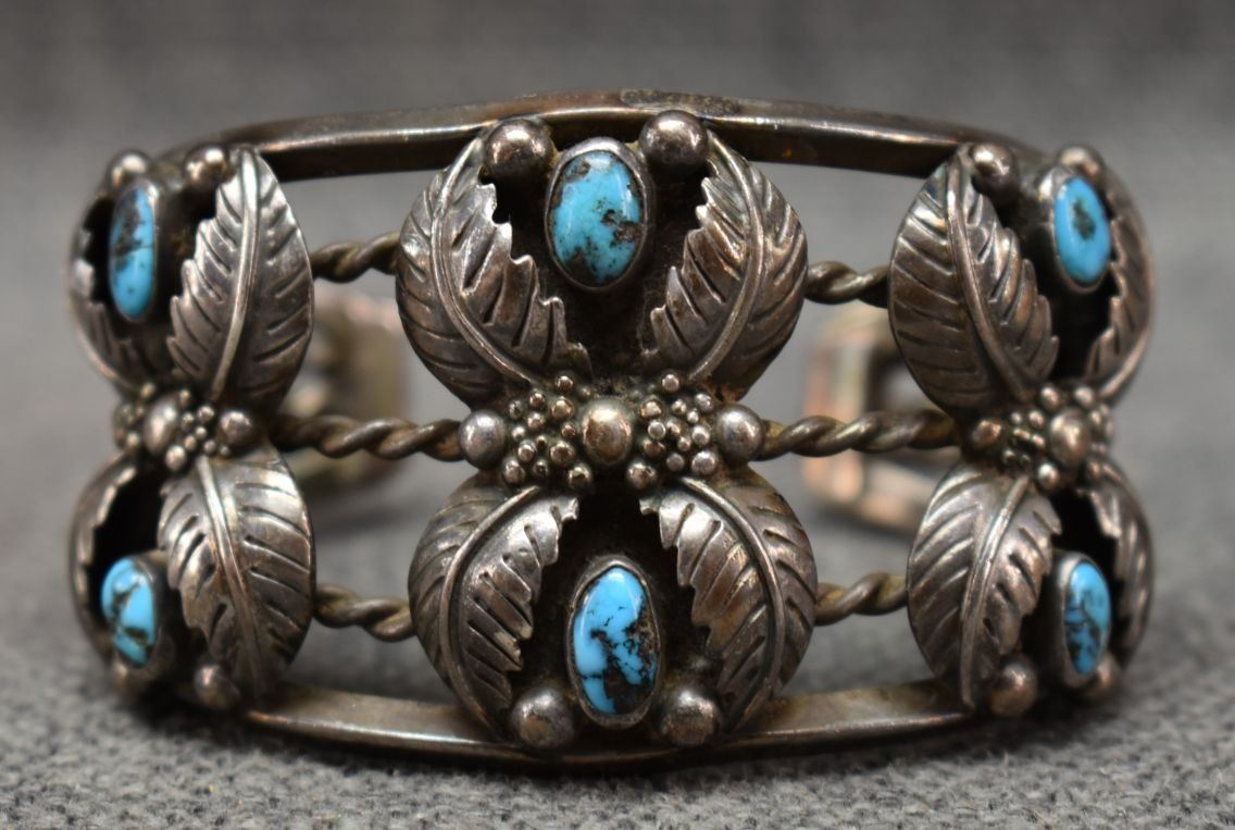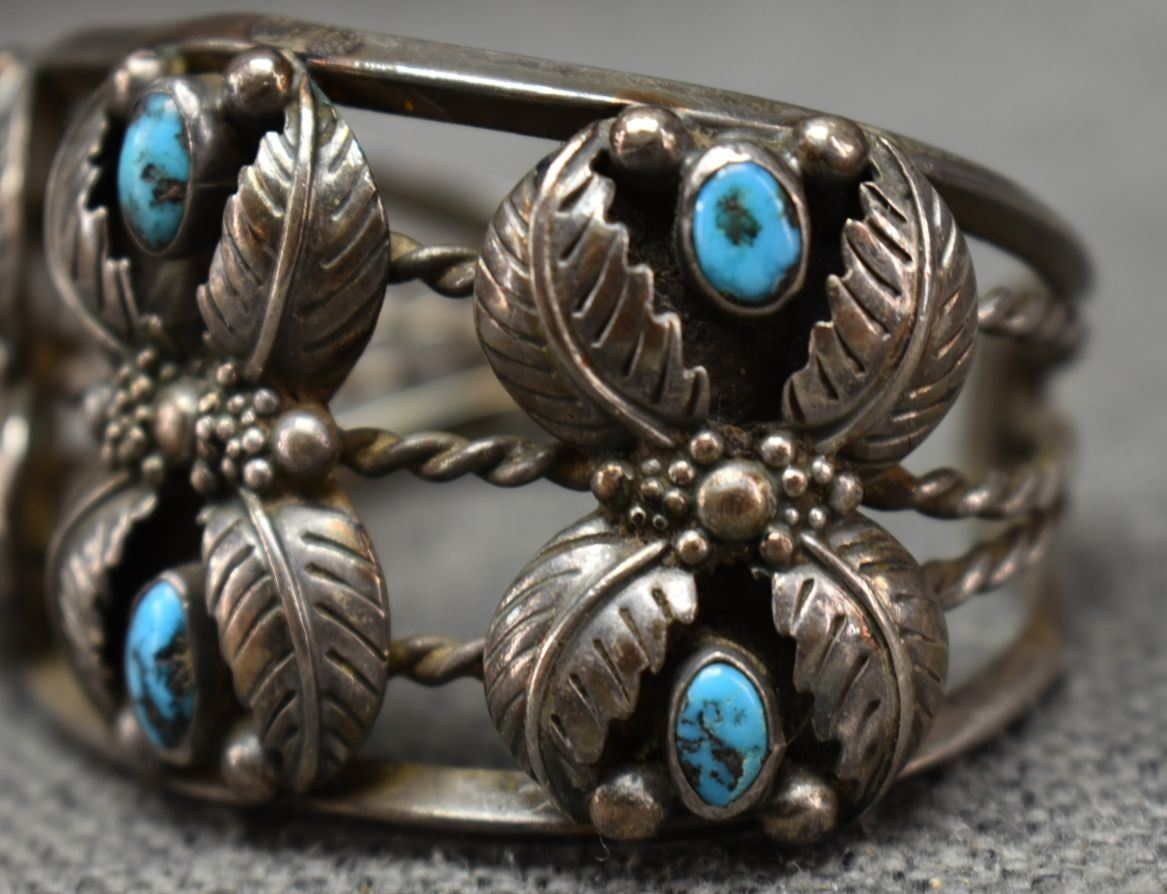 1970's Navajo, Stearling silver and turquoise with leaf applique. 1.5" x 5.25" x 1.25" 65 grams has cracked stone
