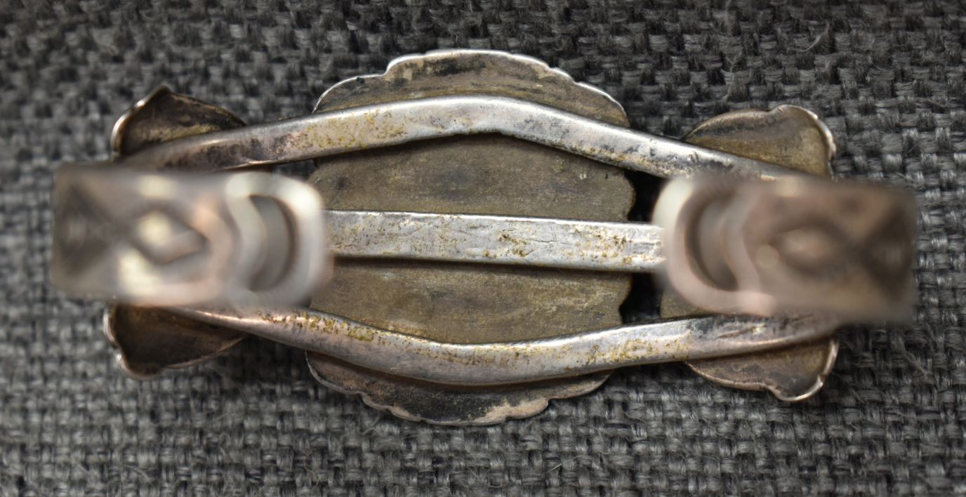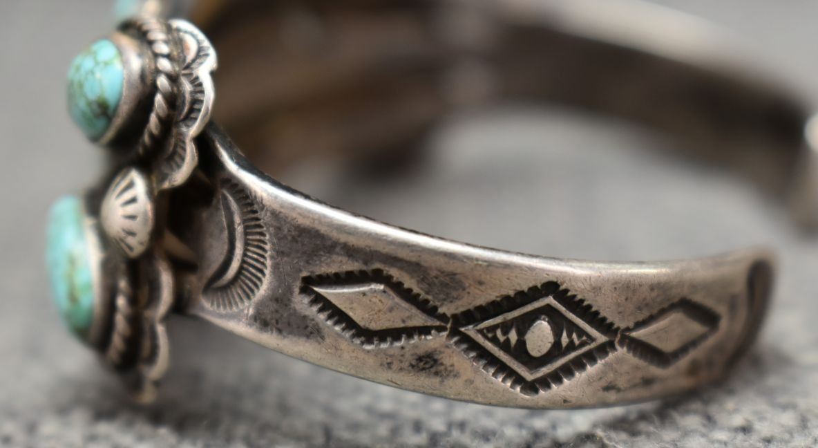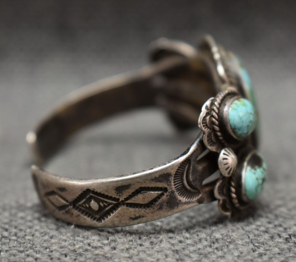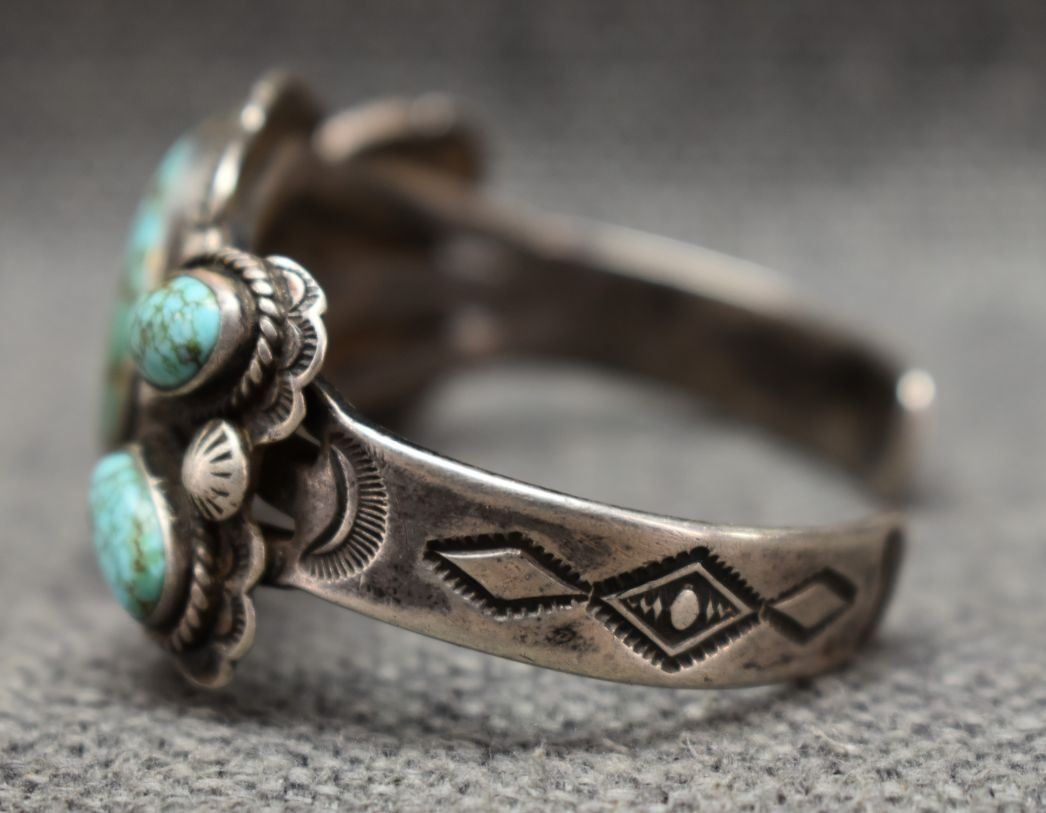 1950's Navajo, sterling silver stamped design with turquoise stones 1.25" x 5.25" x .75" total weight 43