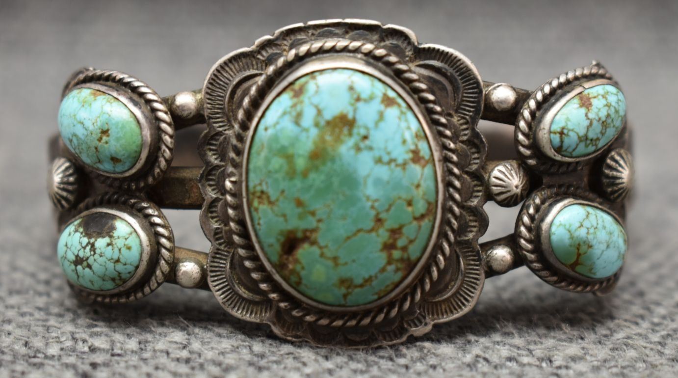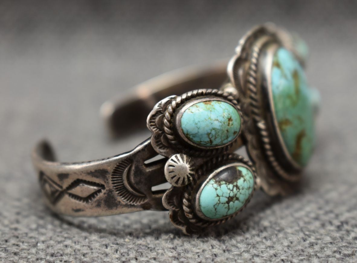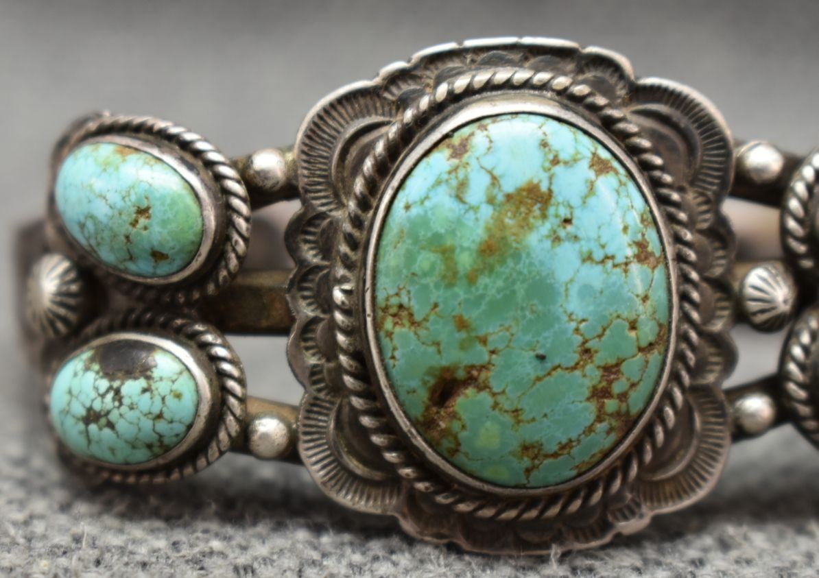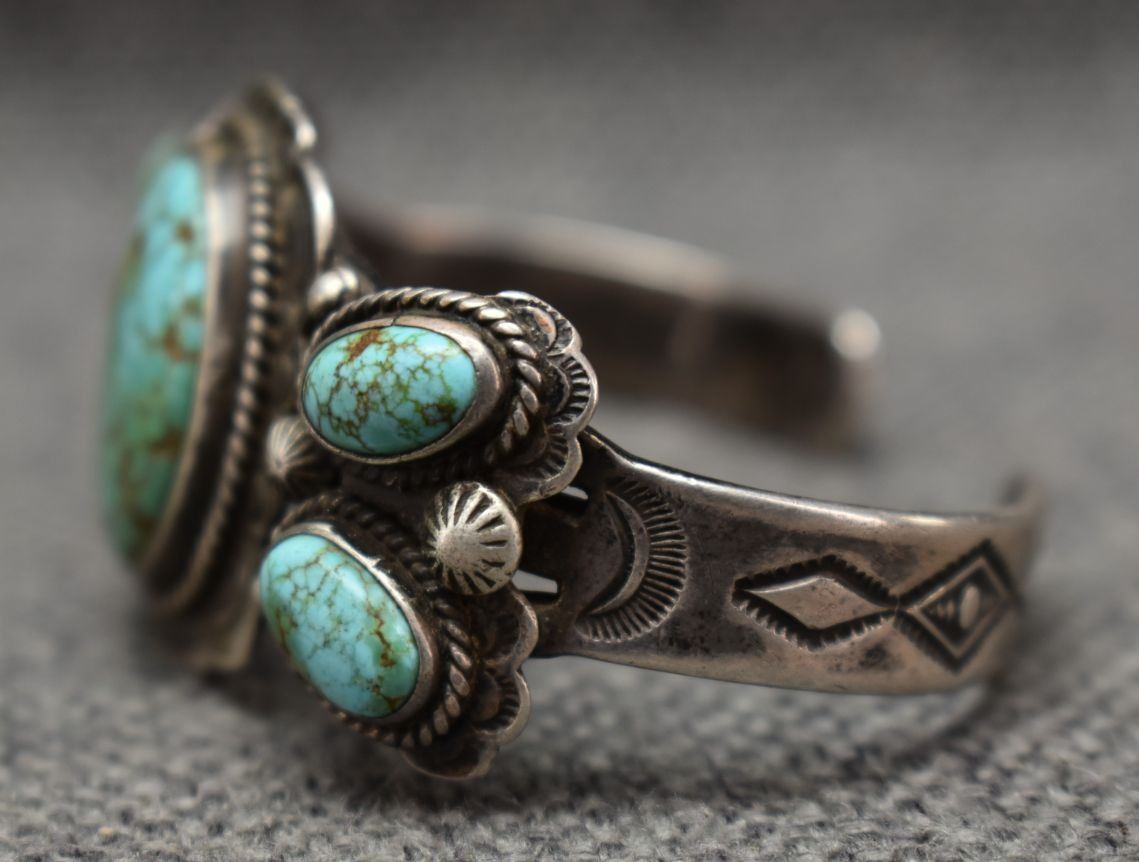 1950's Navajo, sterling silver stamped design with turquoise stones 1.25" x 5.25" x .75" total weight 43