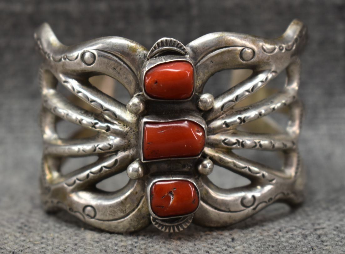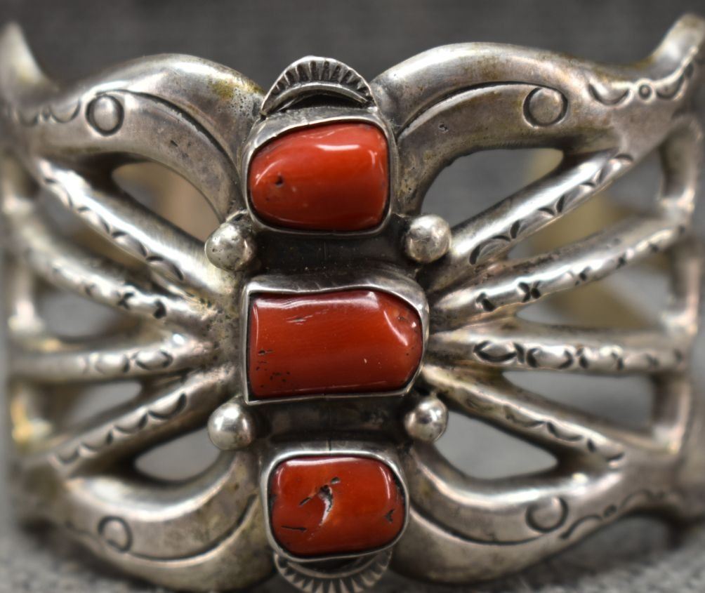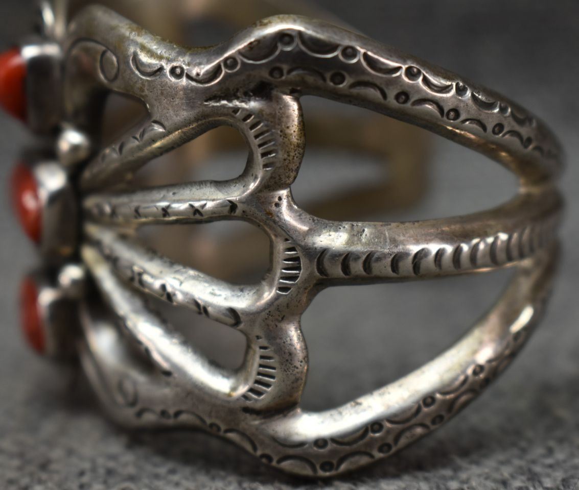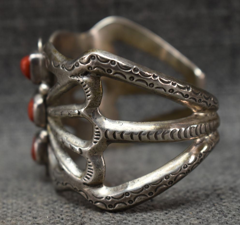 1970's Navajo sterling silver and coral bracelet. 1.75'' x 5.5'' x 1.25''. Total weight 103 grams