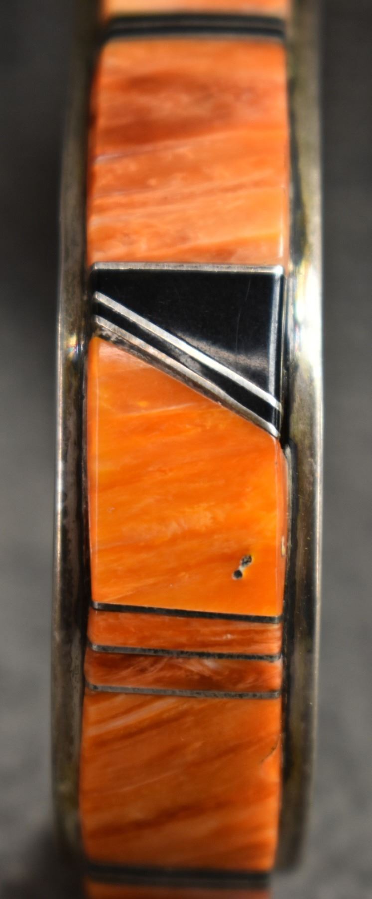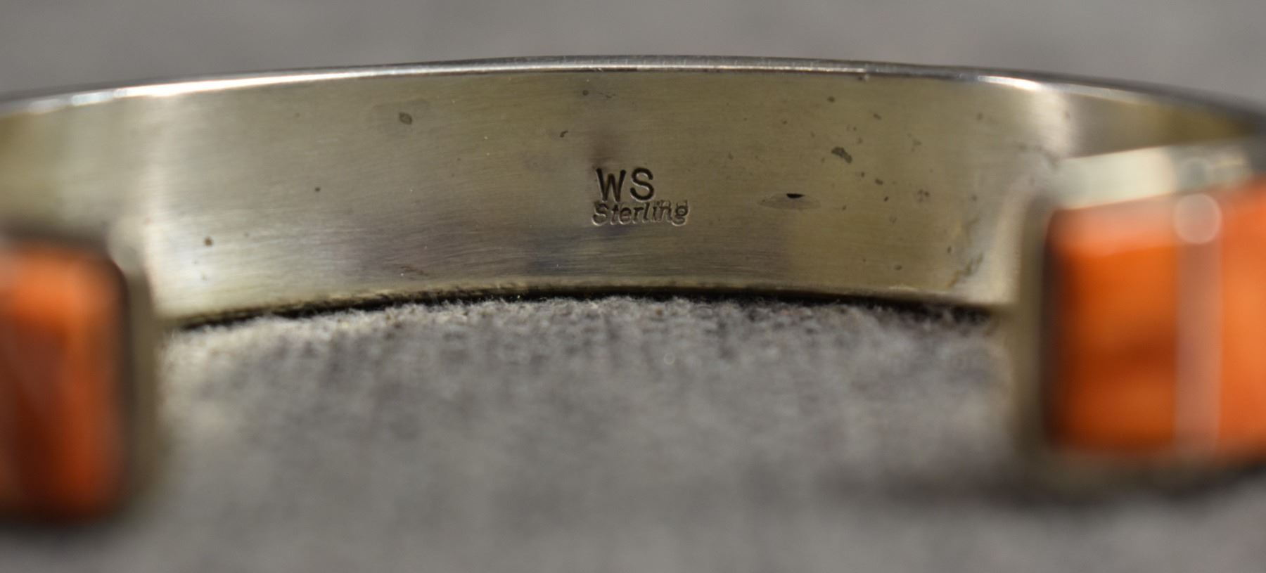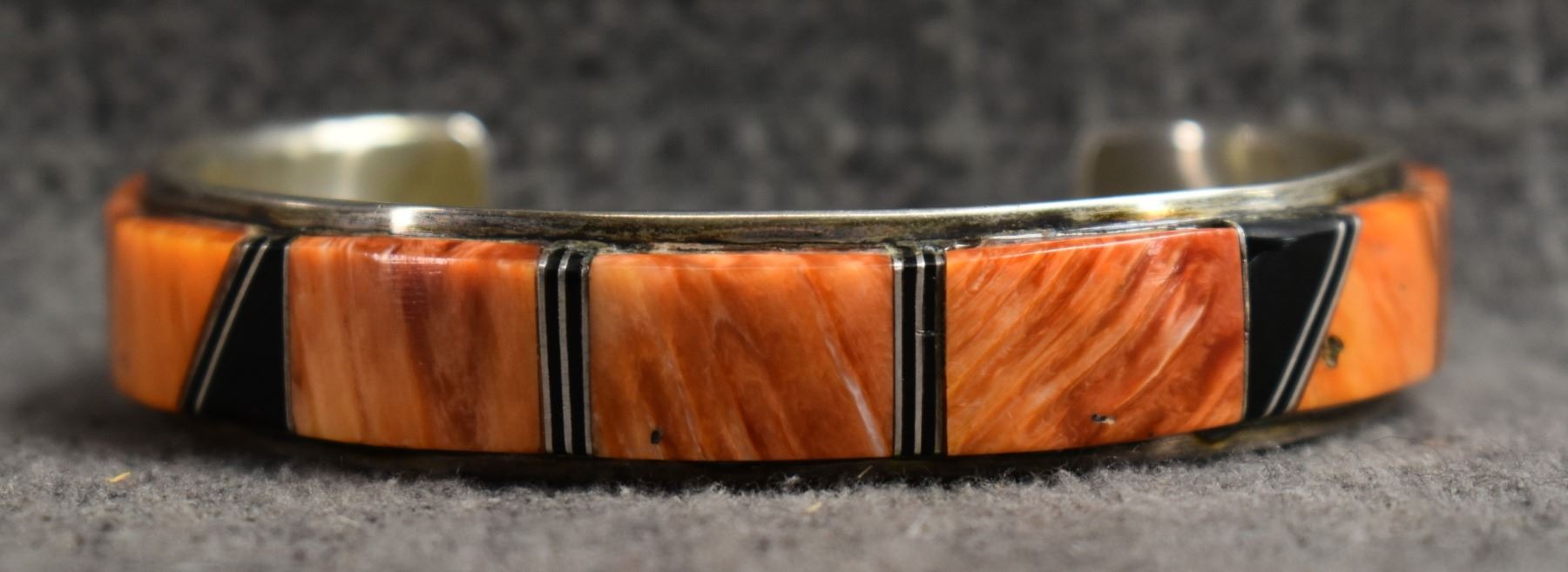 1990's Navajo. Sterling silver jet and spiny oyster bracelet. Signed W.S .5'' x 5.25'' x 1.25'' total weight 31 grams
