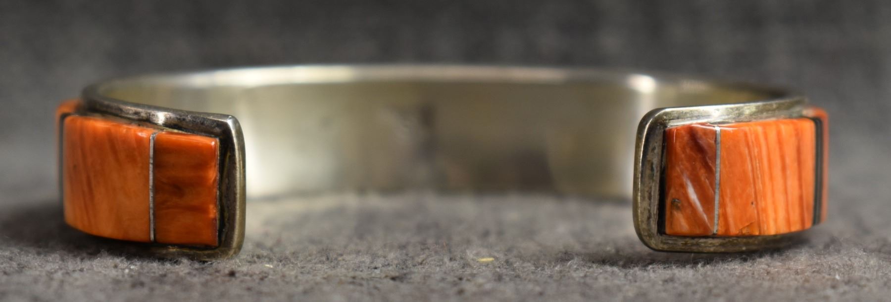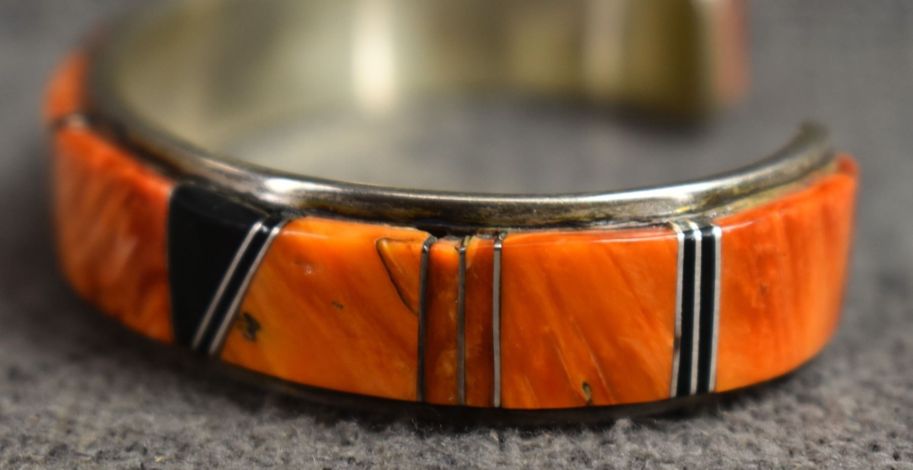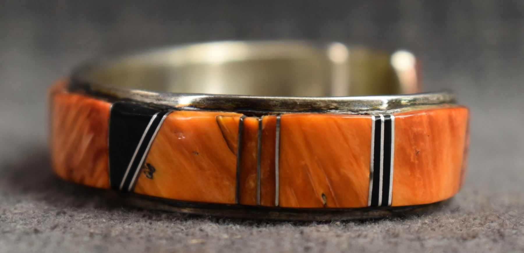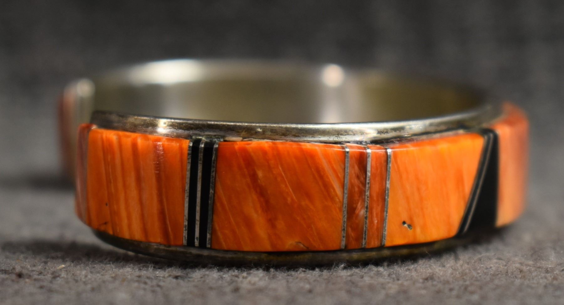 1990's Navajo. Sterling silver jet and spiny oyster bracelet. Signed W.S .5'' x 5.25'' x 1.25'' total weight 31 grams