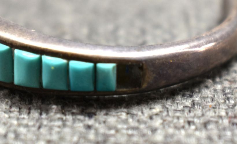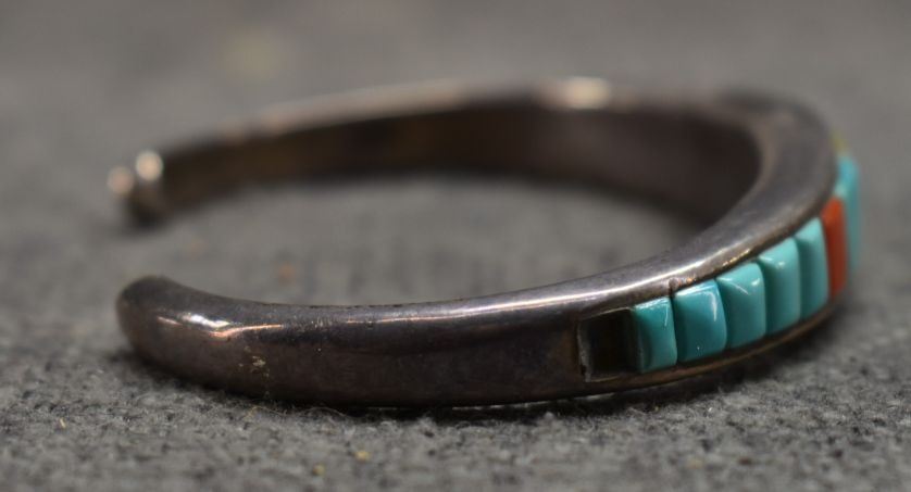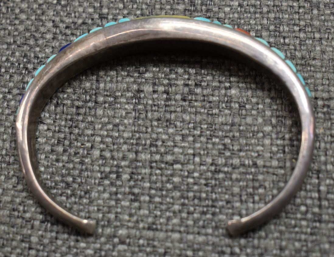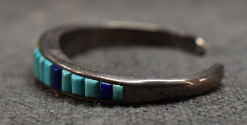 1980's Navajo. Sterling silver turquoise lapis and shell bracelet. .5'' x 5.5'' x 1.25''. Total weight 30 grams