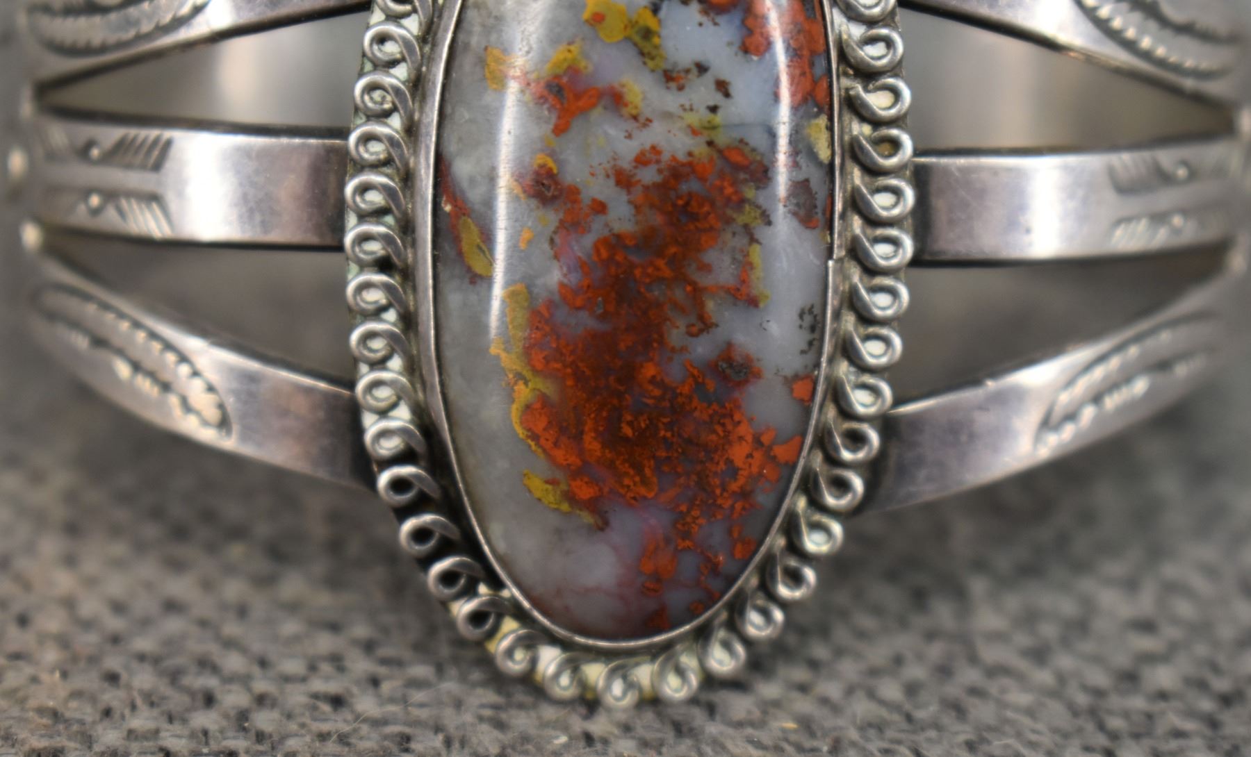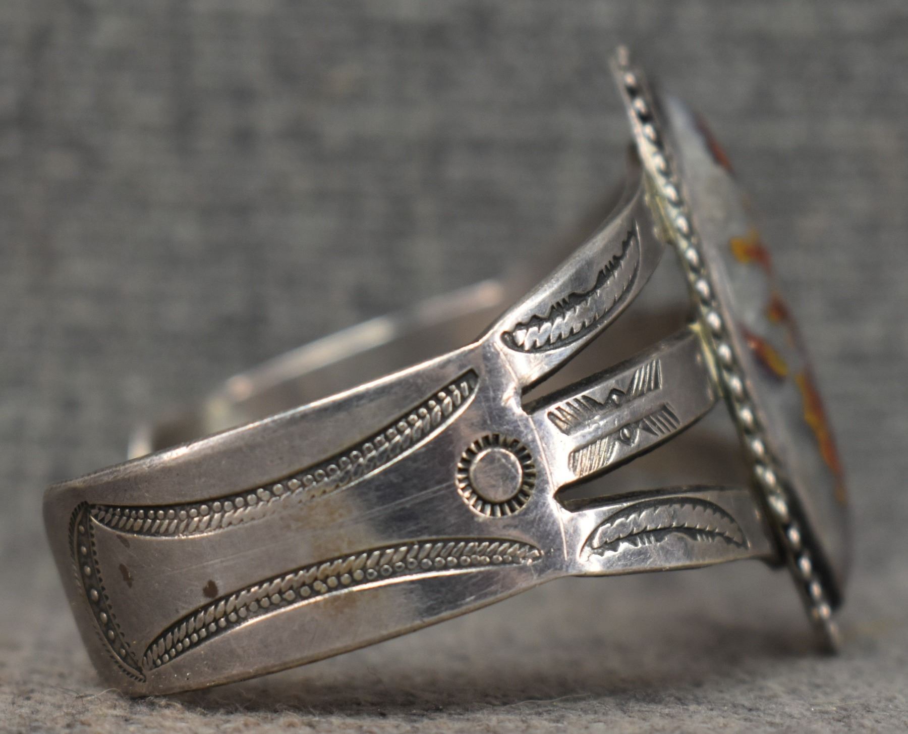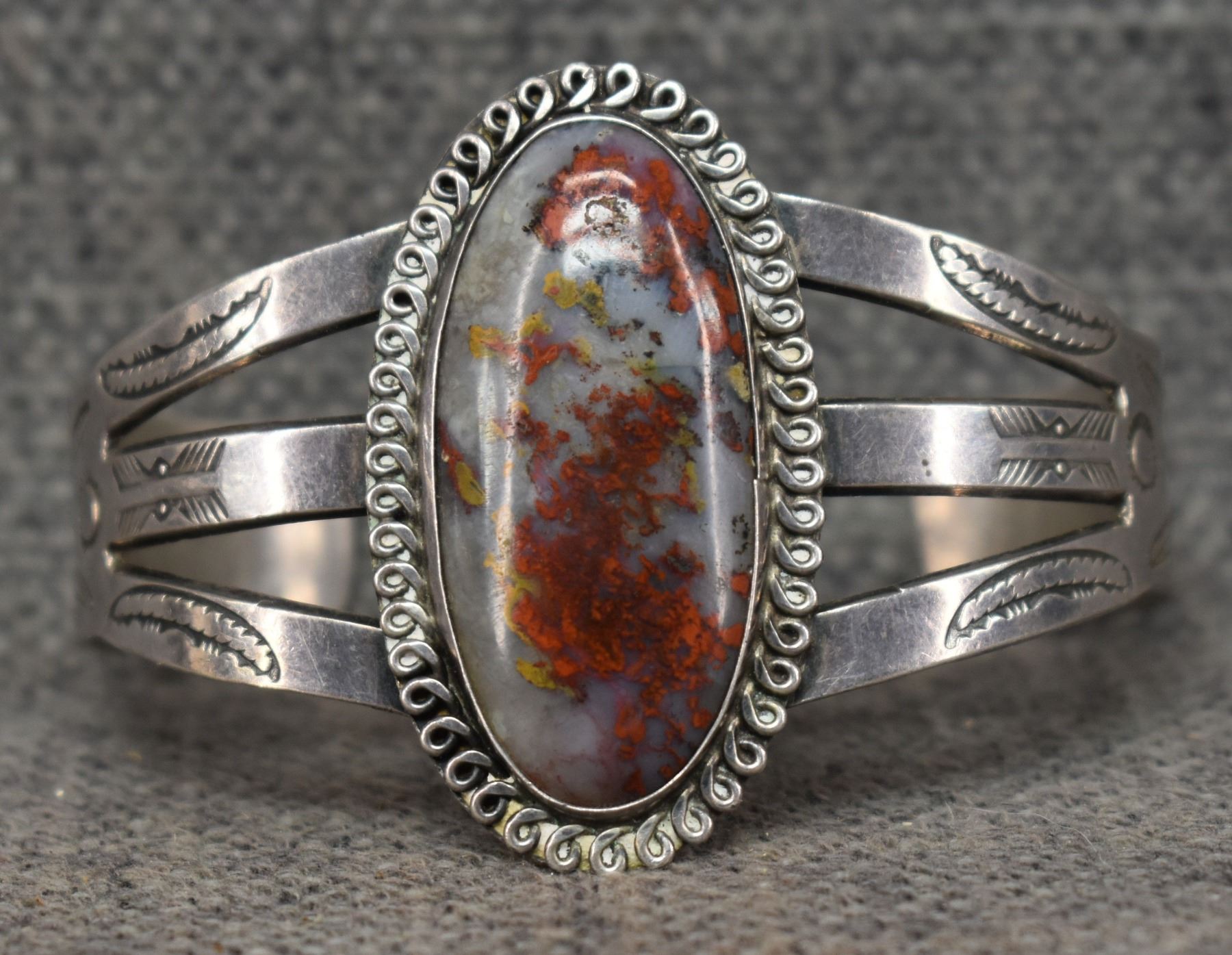 1940's Navajo. Sterling silver and agate bracelet. 1.75'' x 5.5'' x 1.5''. Total weight 41 grams