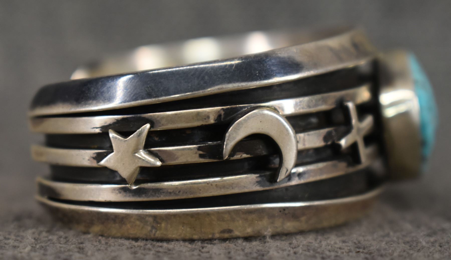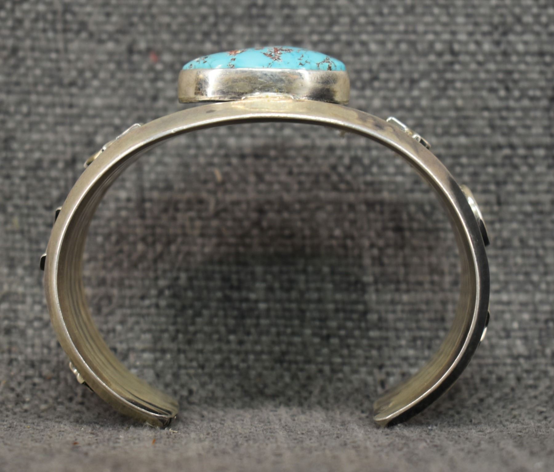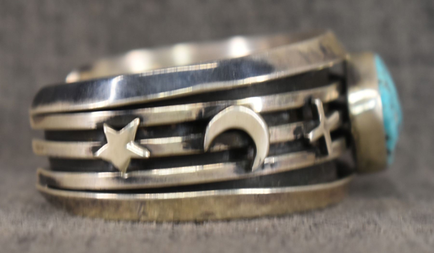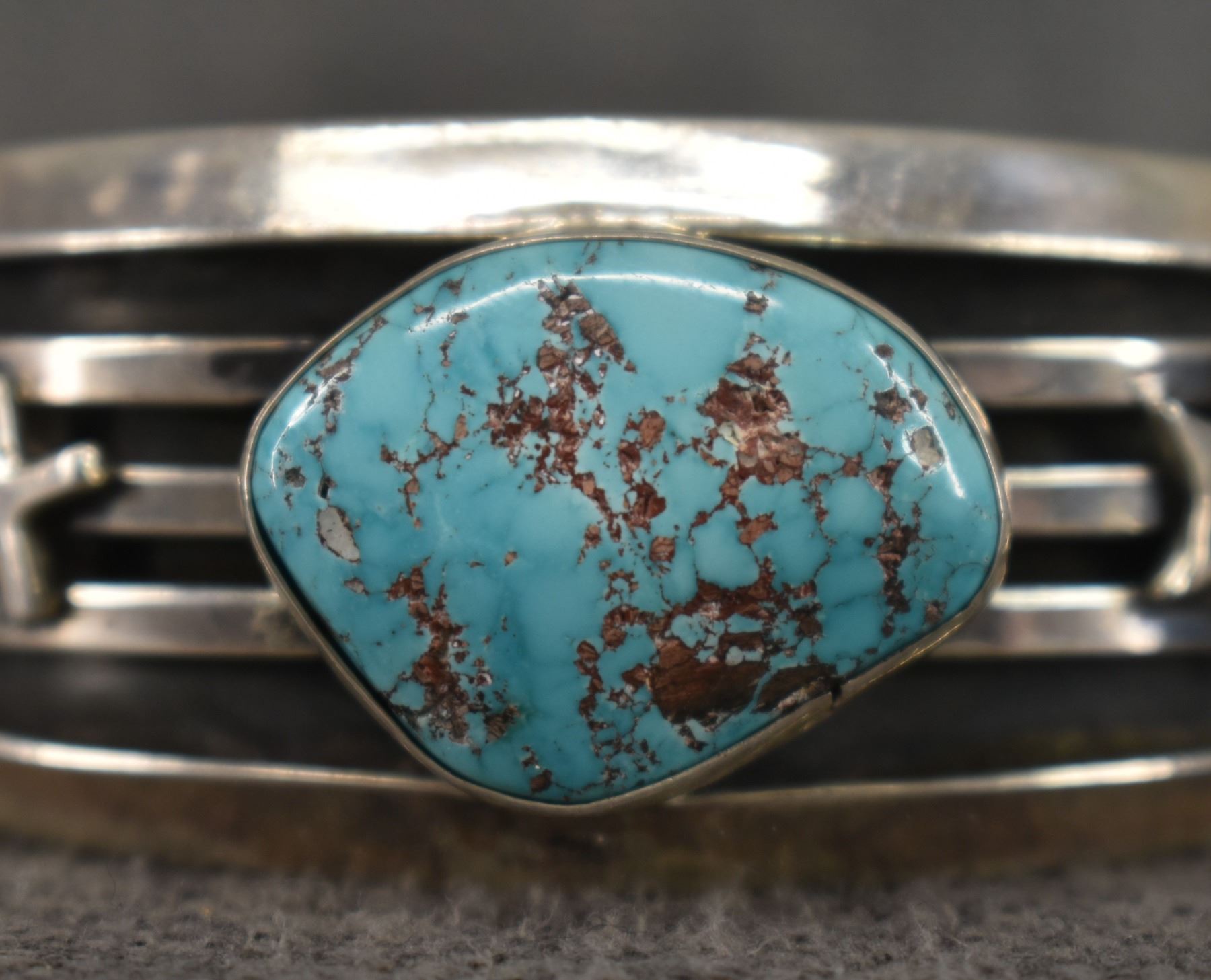 1990's Navajo. Sterling silver and turquoise bracelet 1.25'' x5.75'' x 1.25'' signed G.J. total weight 78 grams