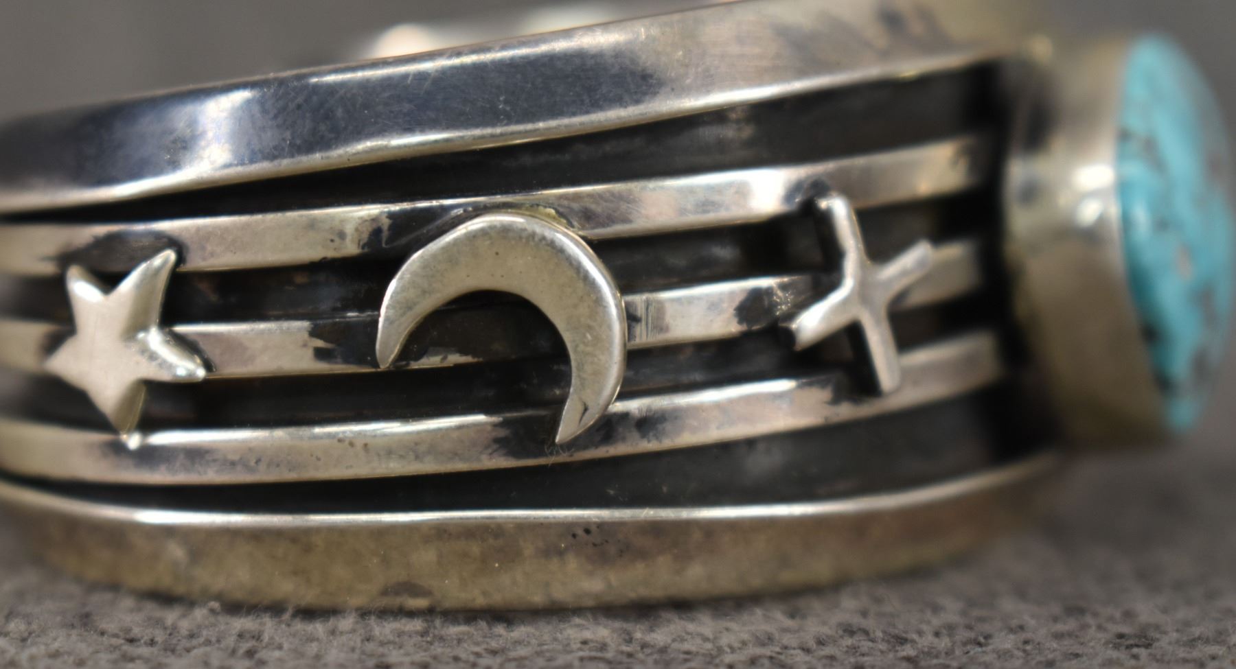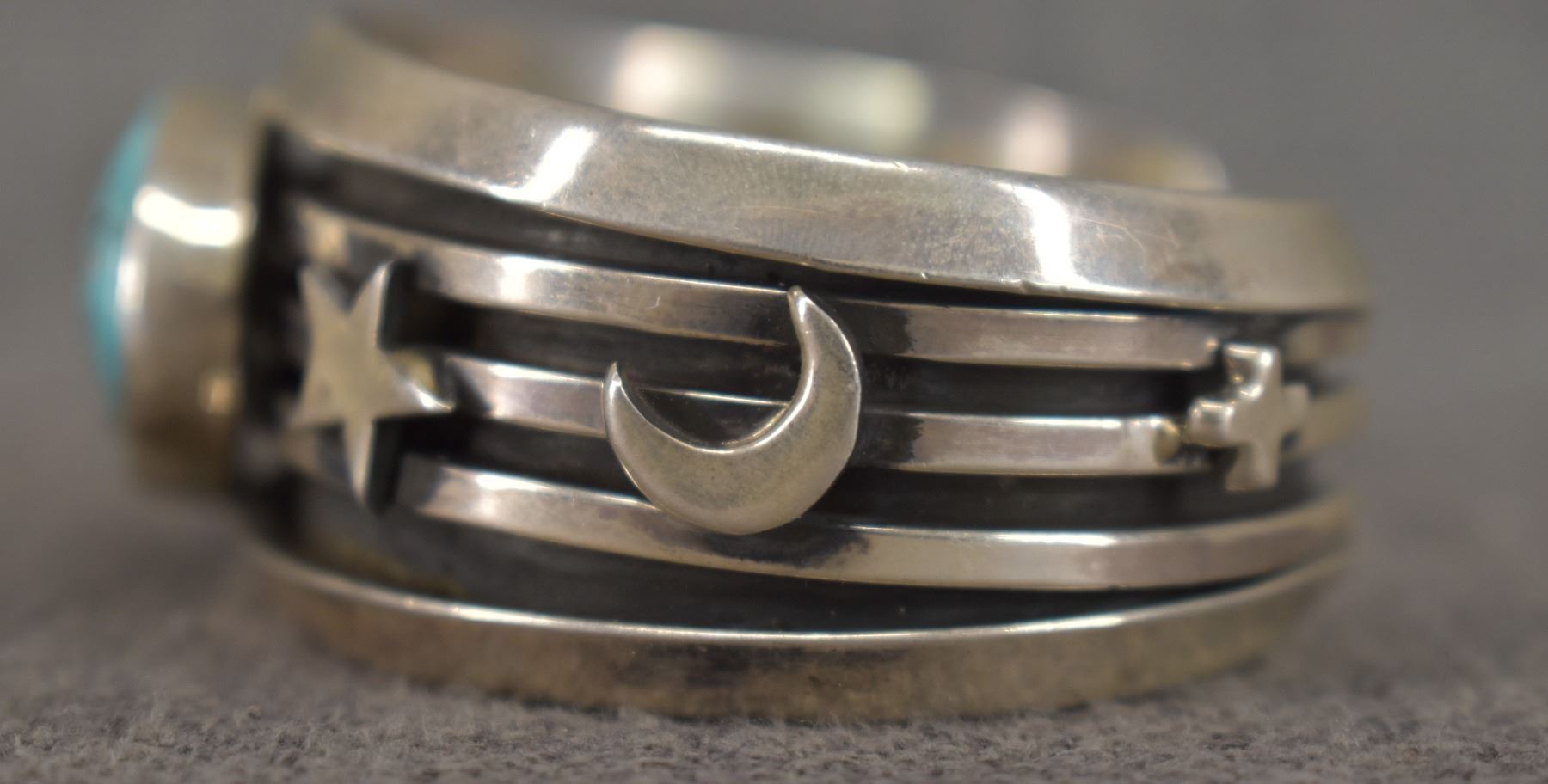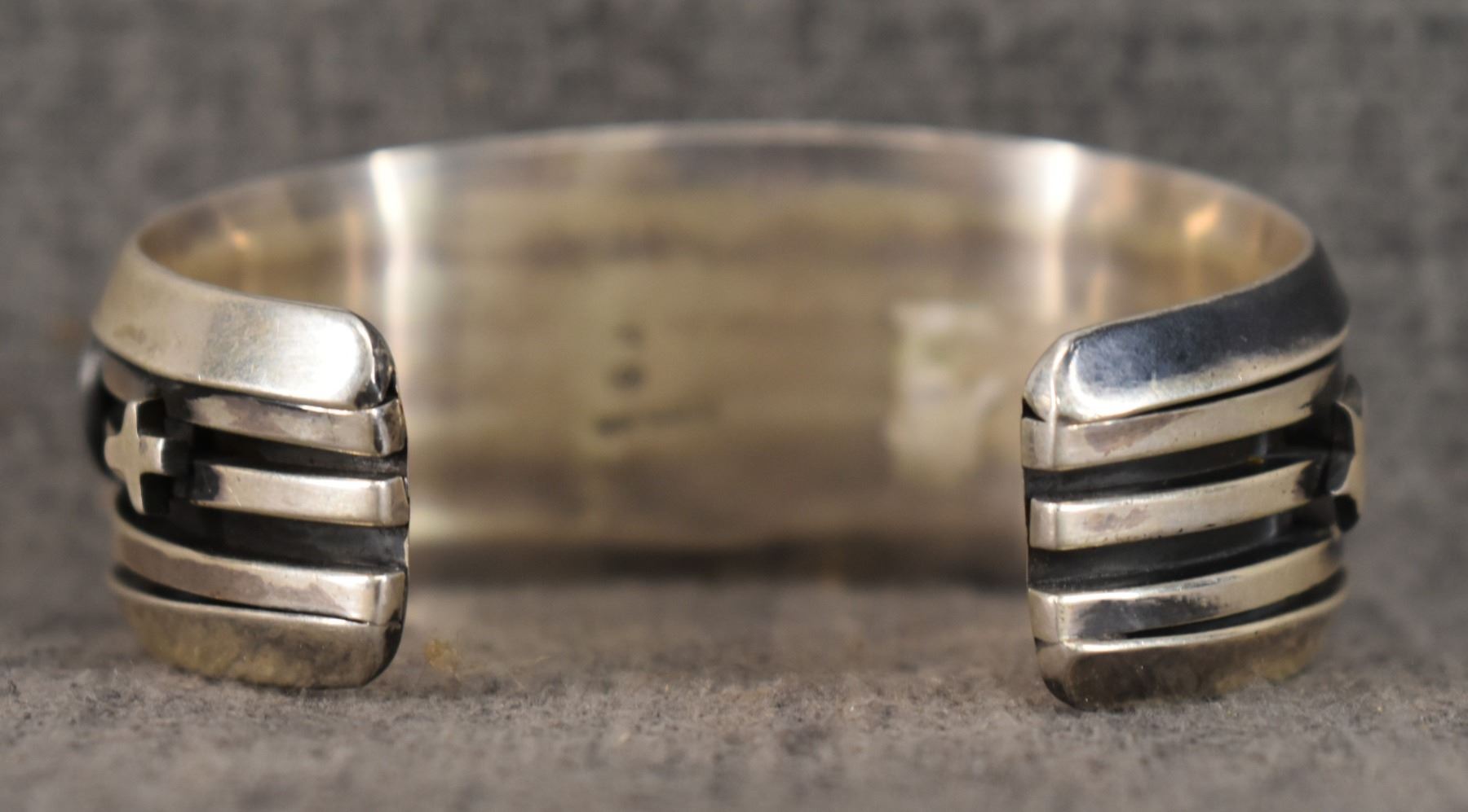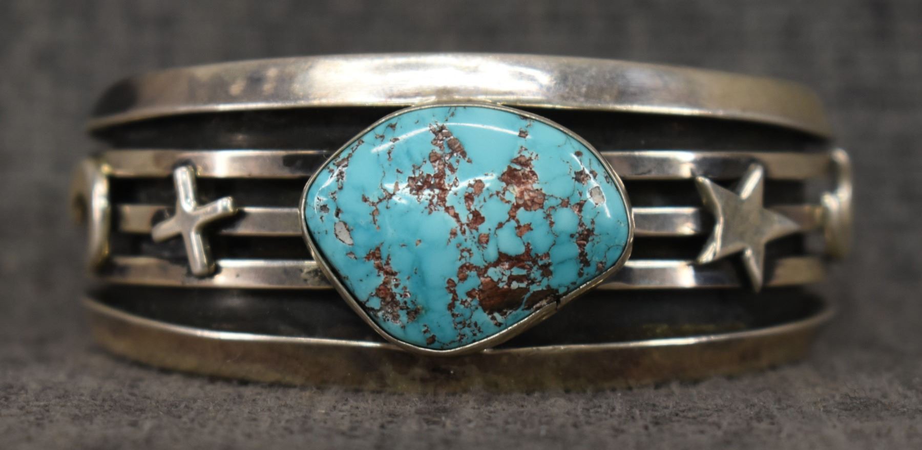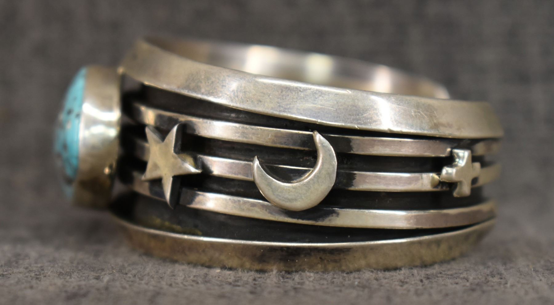 1990's Navajo. Sterling silver and turquoise bracelet 1.25'' x5.75'' x 1.25'' signed G.J. total weight 78 grams