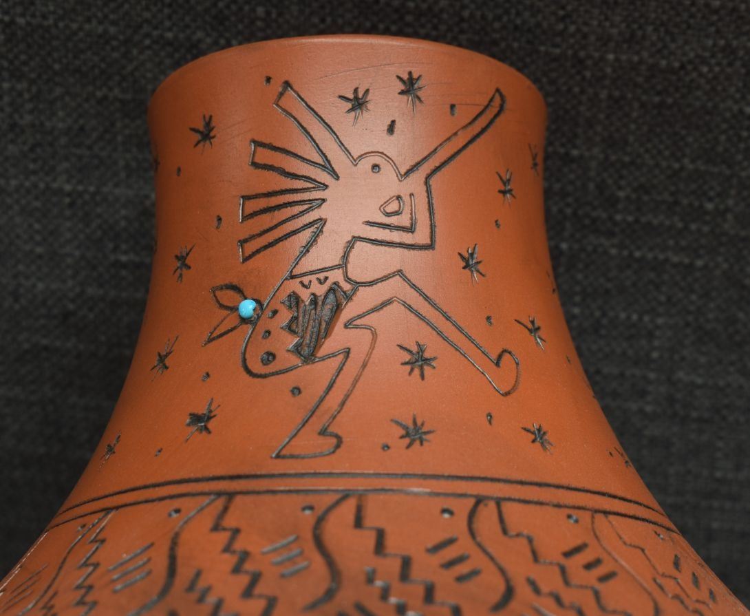 2013 Navajo, ceramic vase with carved geometric and Kokopelli design with turquoise stones signed T Tom/ L Lujan 13.5" x 11.5"