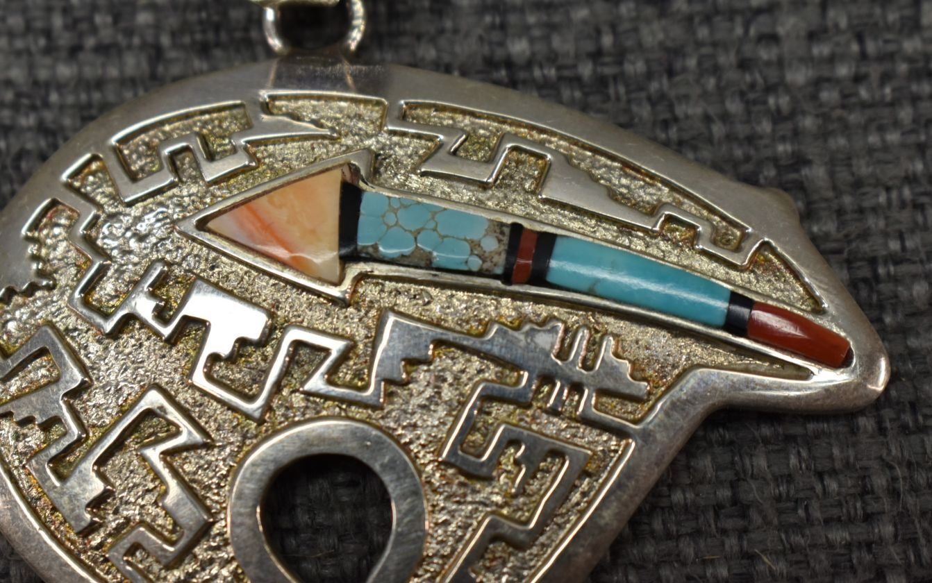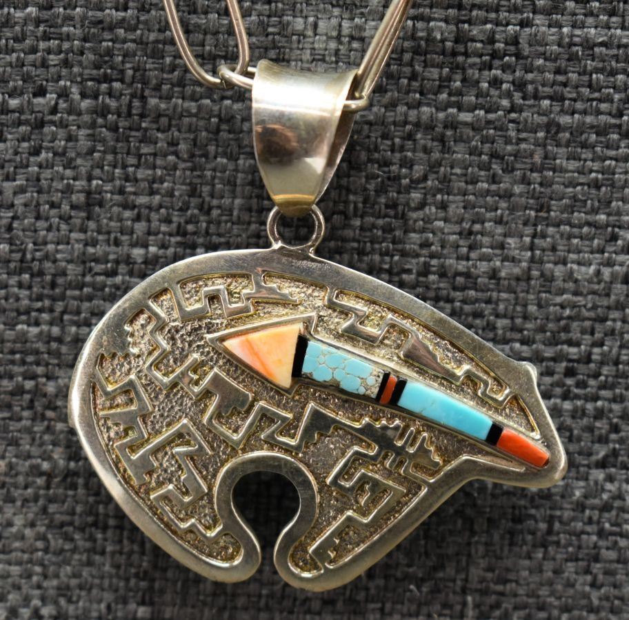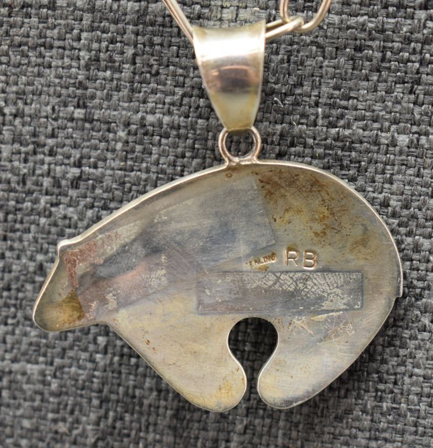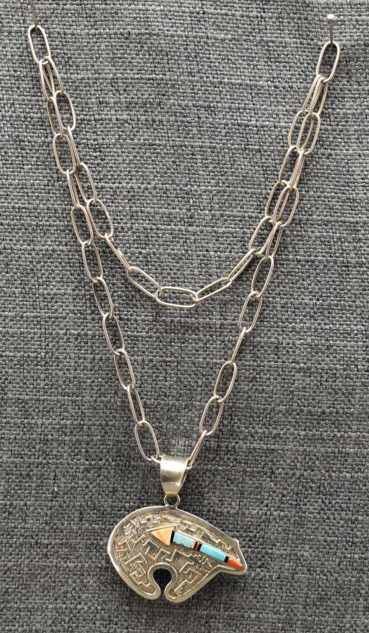 1980's Navajo, sterling silver hand made chain 22" long with sterling silver sand cast and inlaid heartline bear signed RB. 2.25" x 2.25" total weight 49 grams