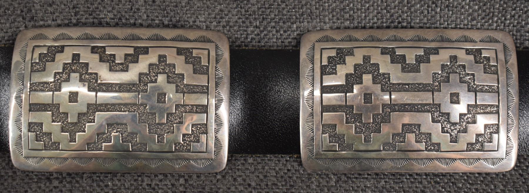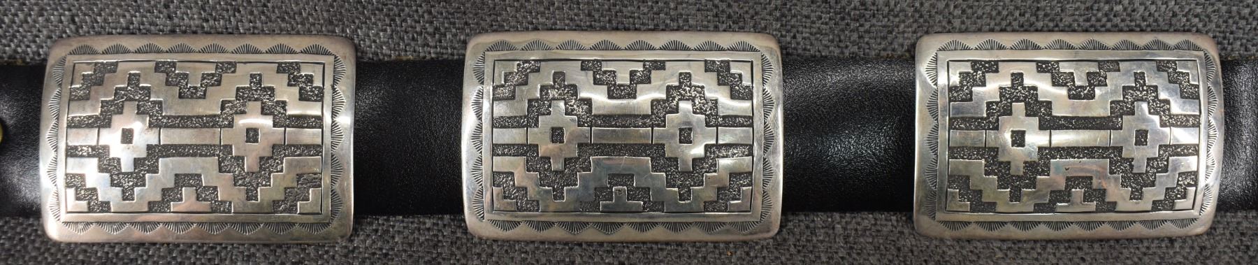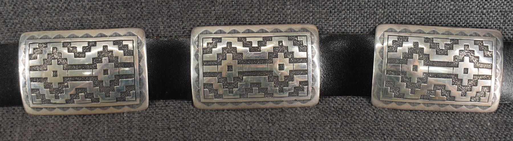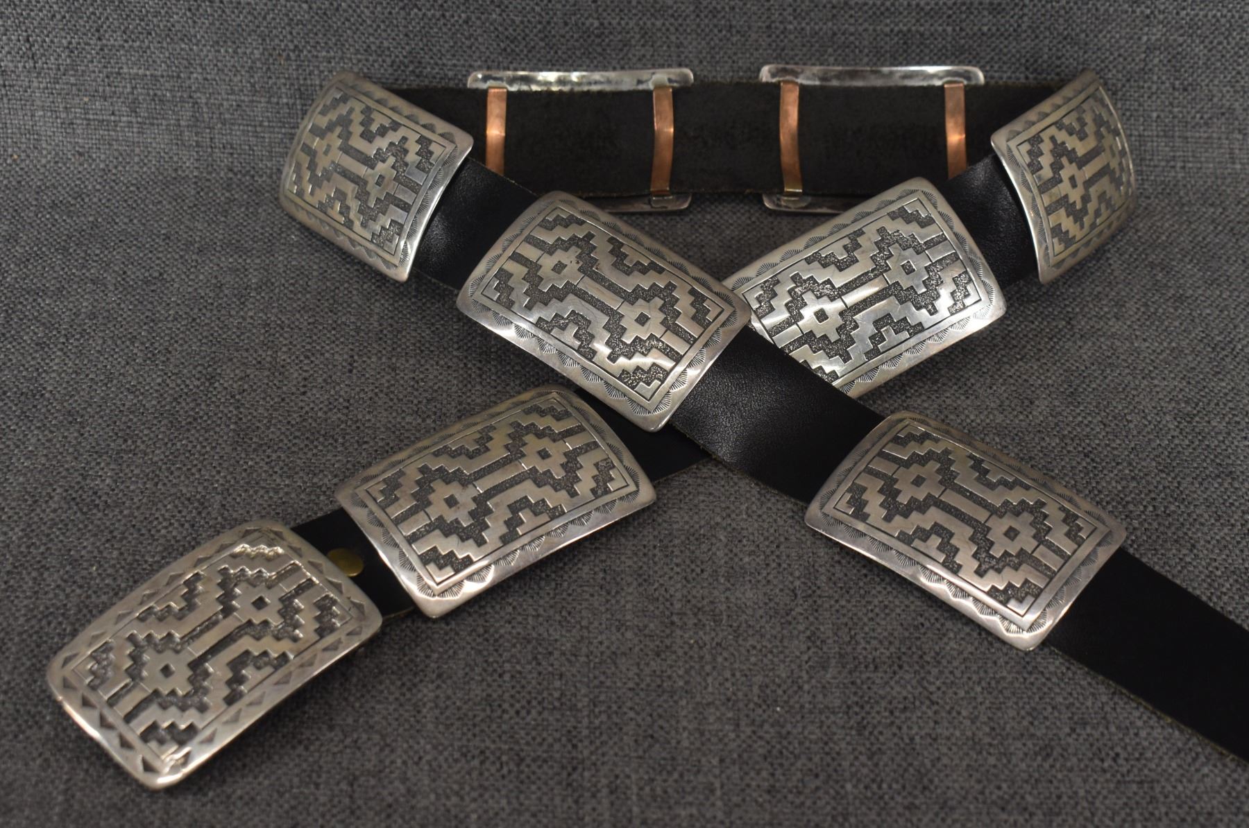 1980-90's Navajo, Sterling silver stamped design concho signed R Begaye. Buckle 2" x 3" fits 1.5" belt, eight conchos 2" x 3" fits 1.5" belt, total weight 401 grams excluding belt total length 50" long