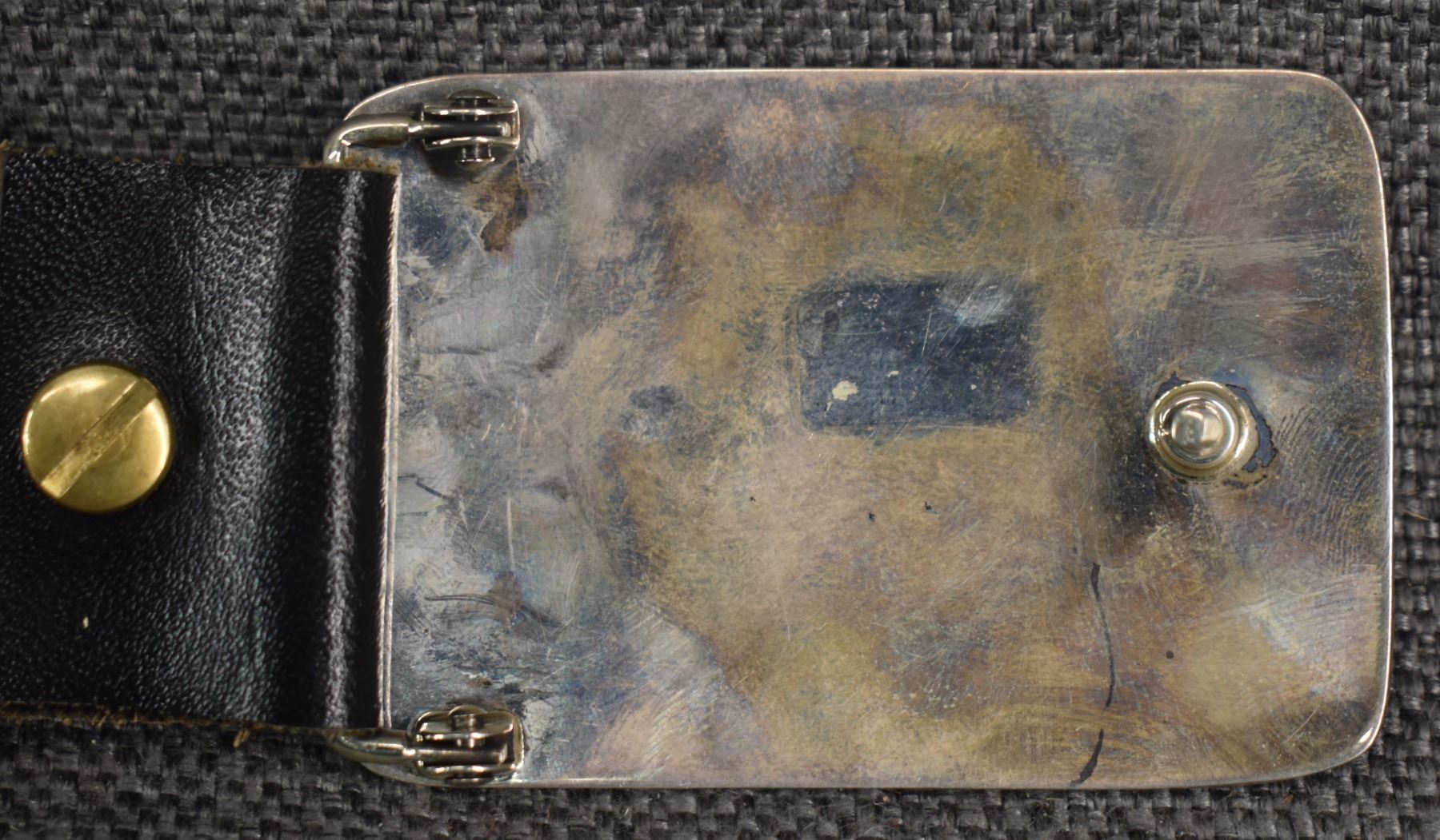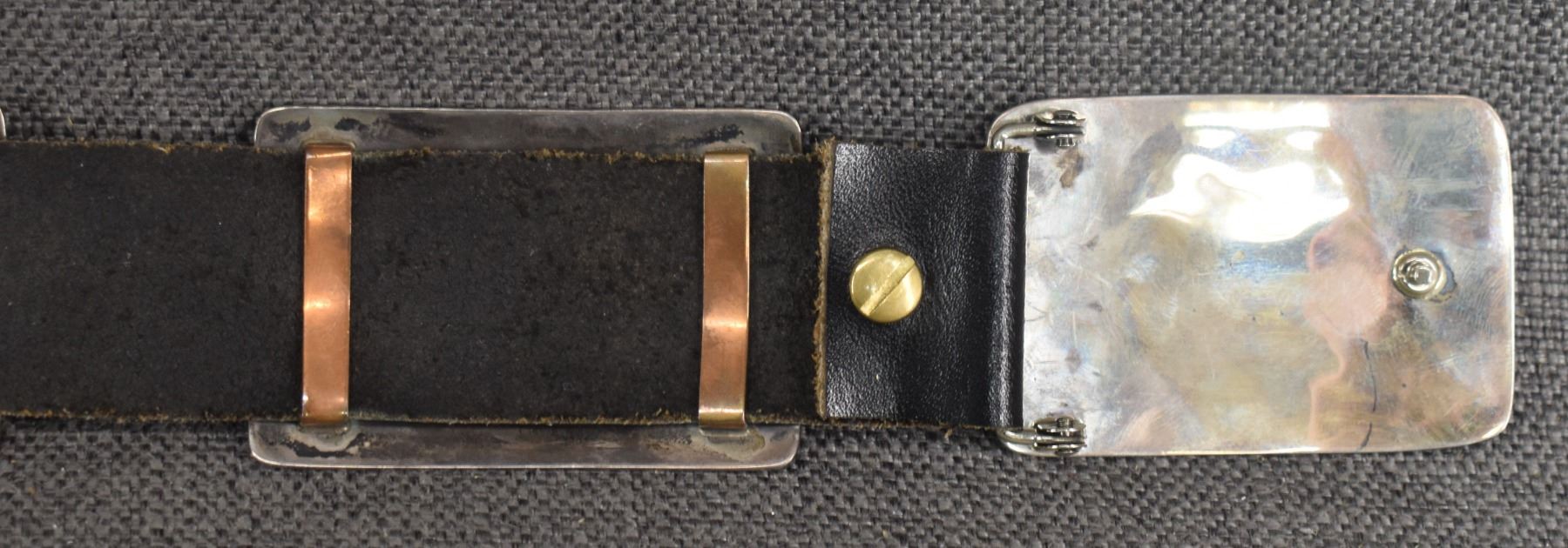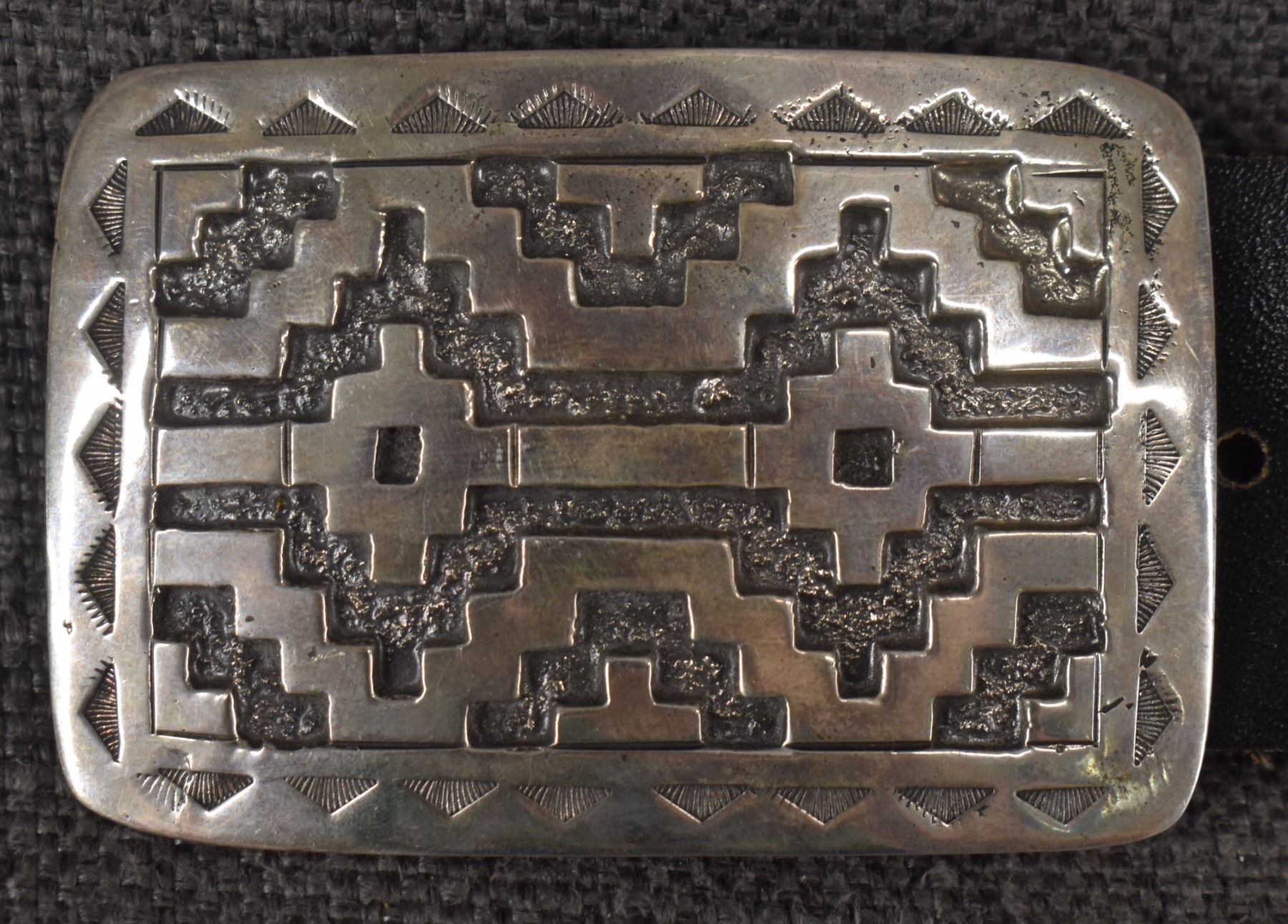 1980-90's Navajo, Sterling silver stamped design concho signed R Begaye. Buckle 2" x 3" fits 1.5" belt, eight conchos 2" x 3" fits 1.5" belt, total weight 401 grams excluding belt total length 50" long