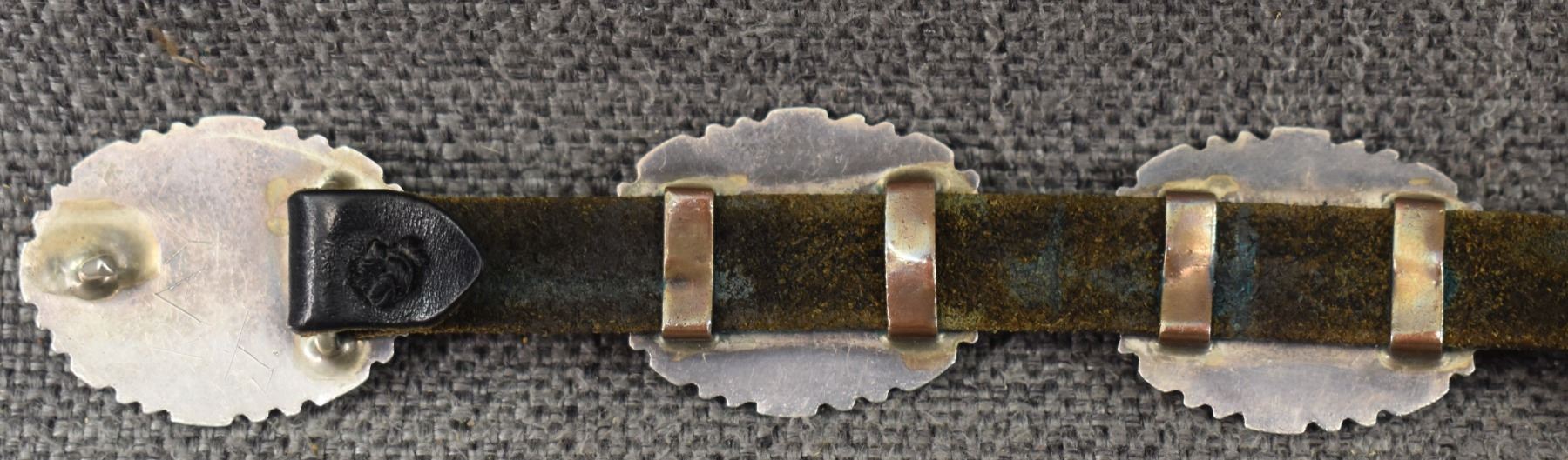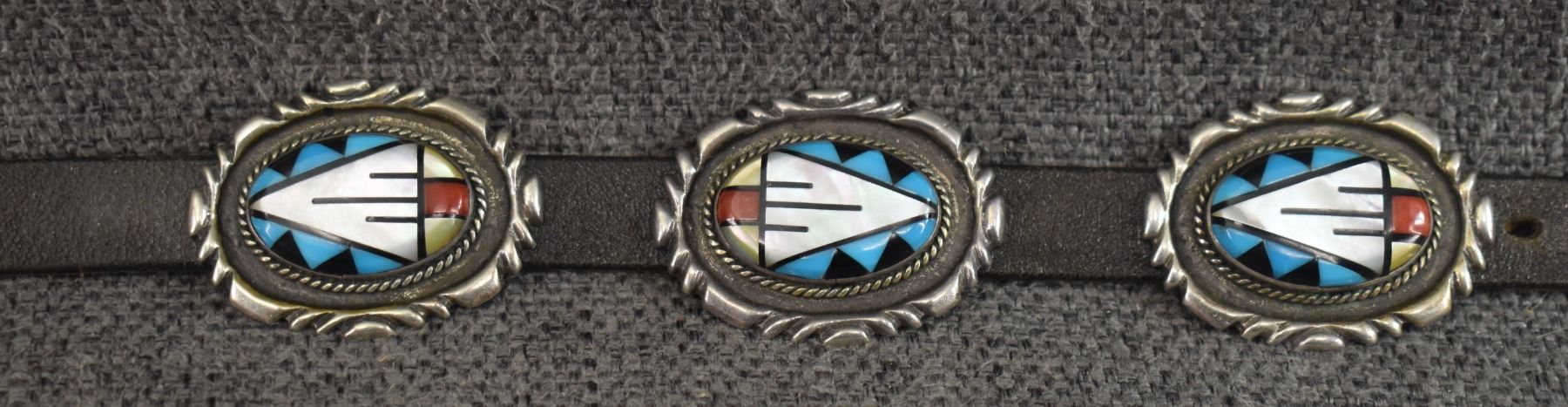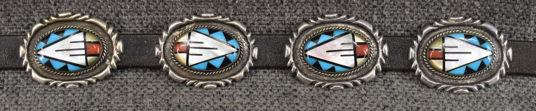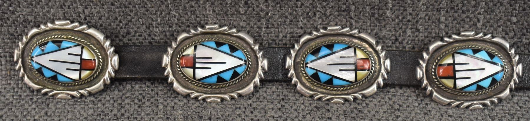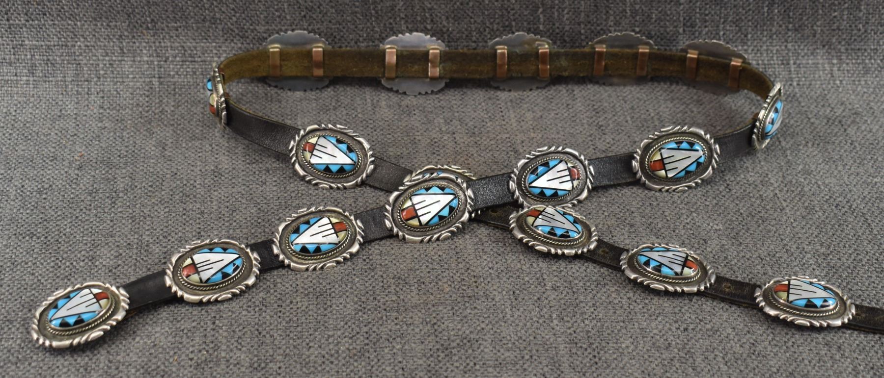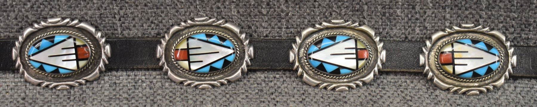 1980's Navajo. Sterling silver turquoise and shell buckle signed Ray J. and 17 matching 1'' x 1.5''. Total weight 198 grams excluding .5'' x 40'' leather belt