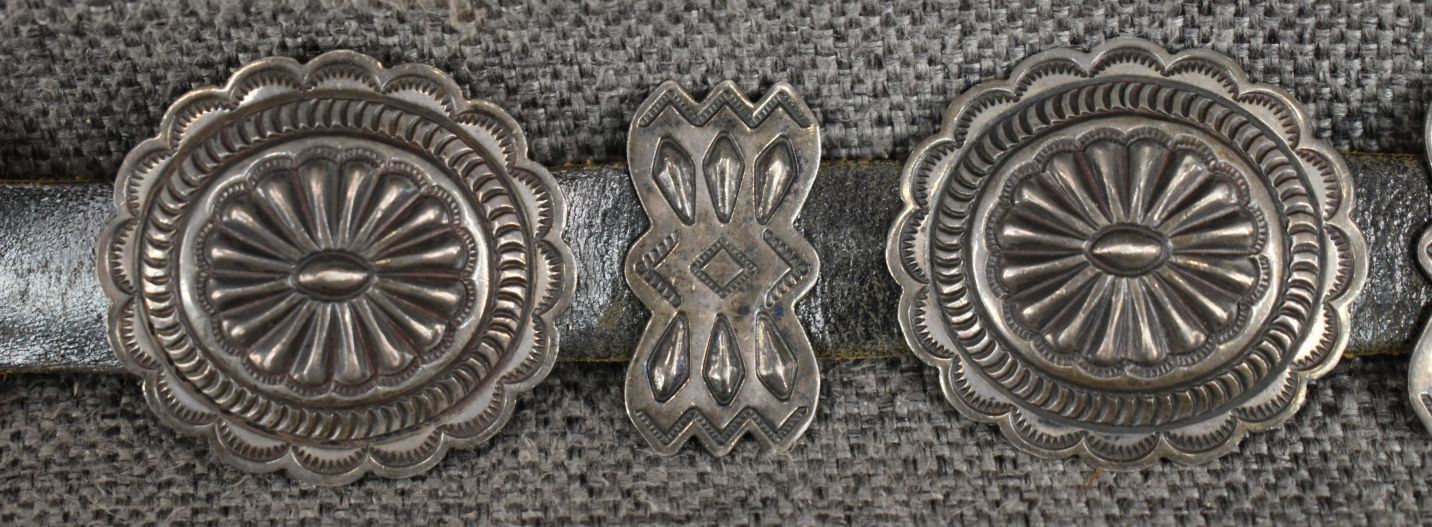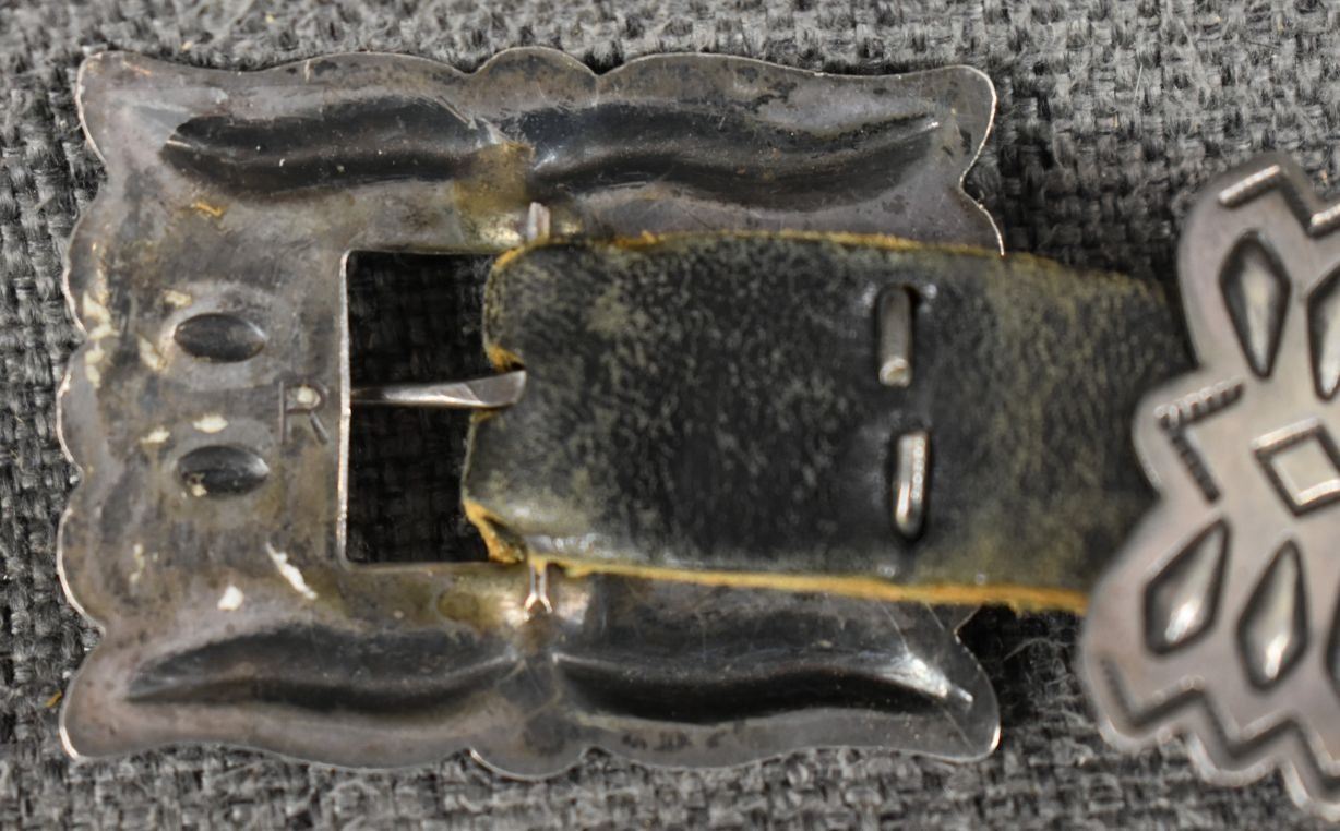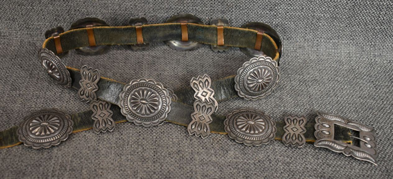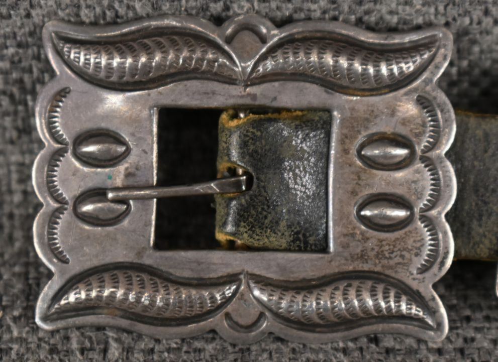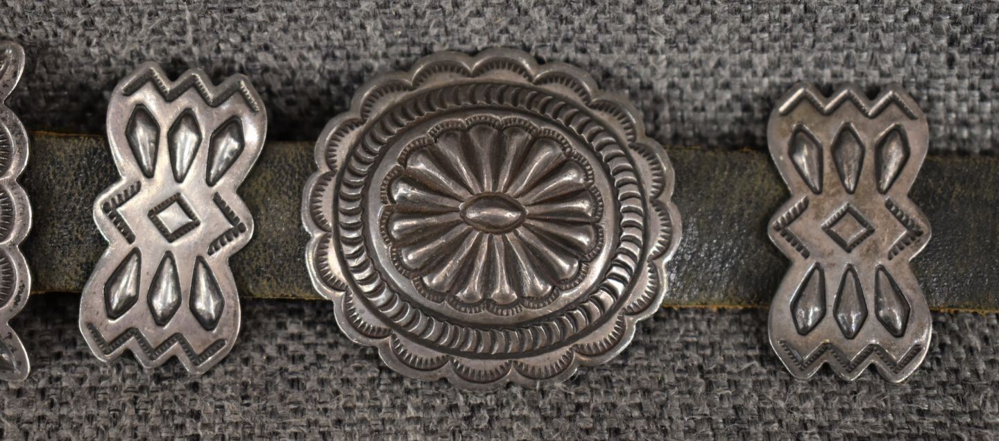 1970's Navajo, sterling silver stamped design signed R S for Roger skeet Jr. buckle 1.5" x 2", nine conchos 1.5" x 1.75", nine butterfly's .75" x 1.25" total weigh excluding the .75" x 34" leather belt 165 grams