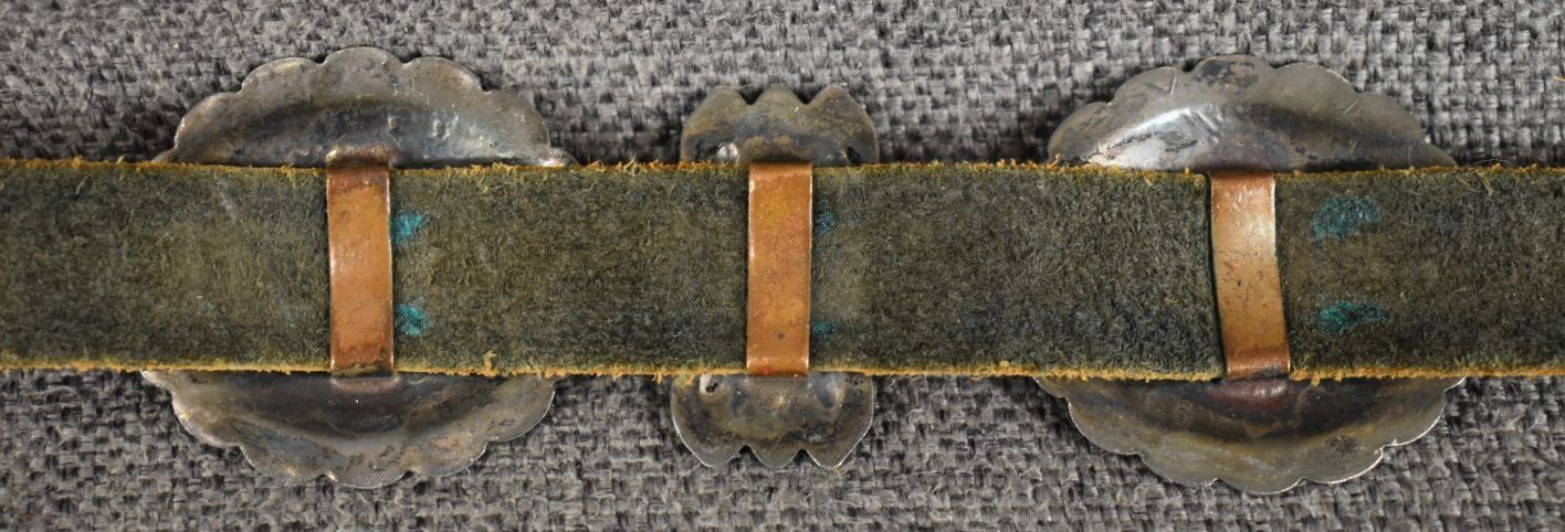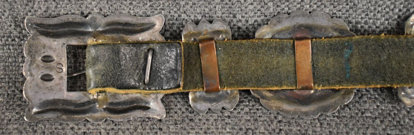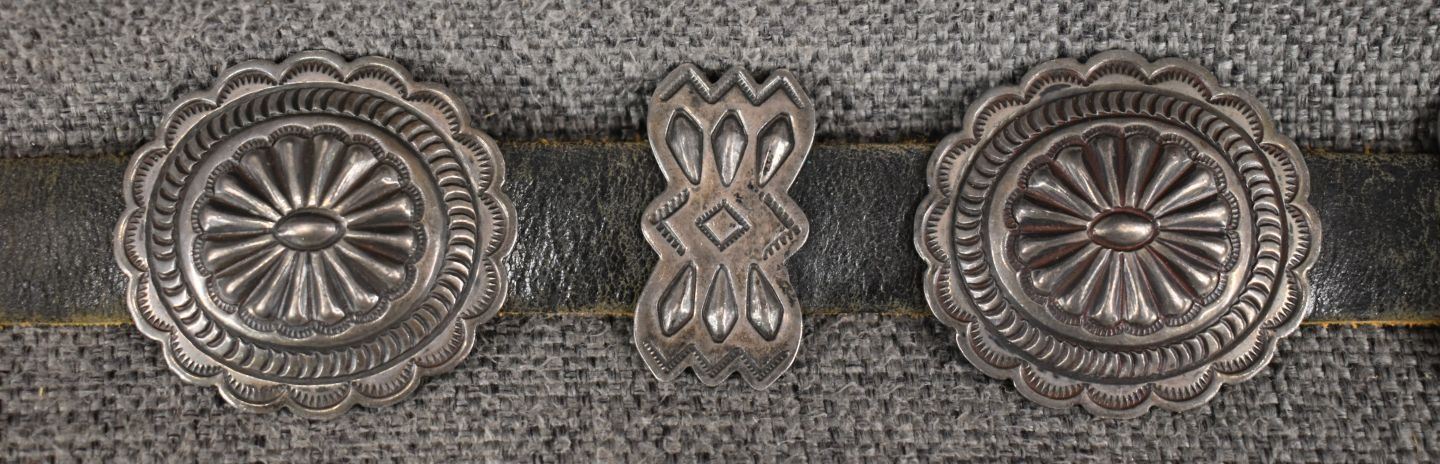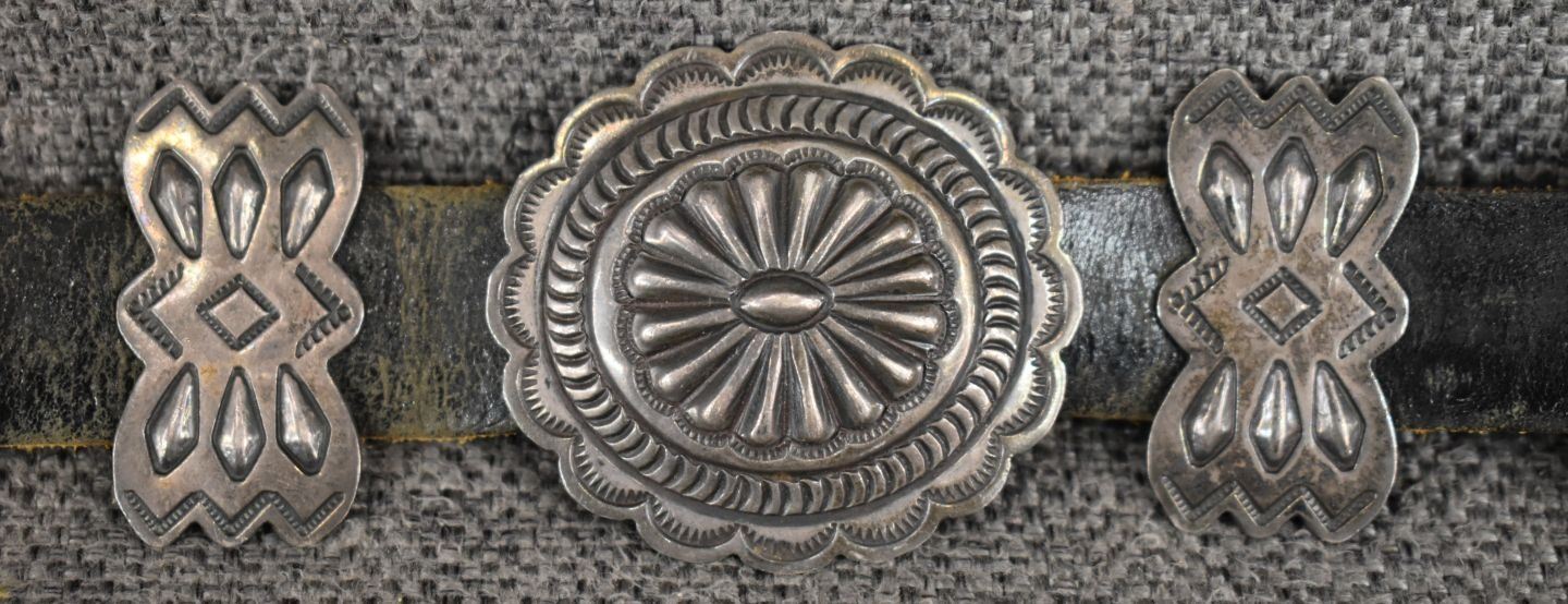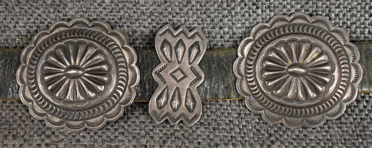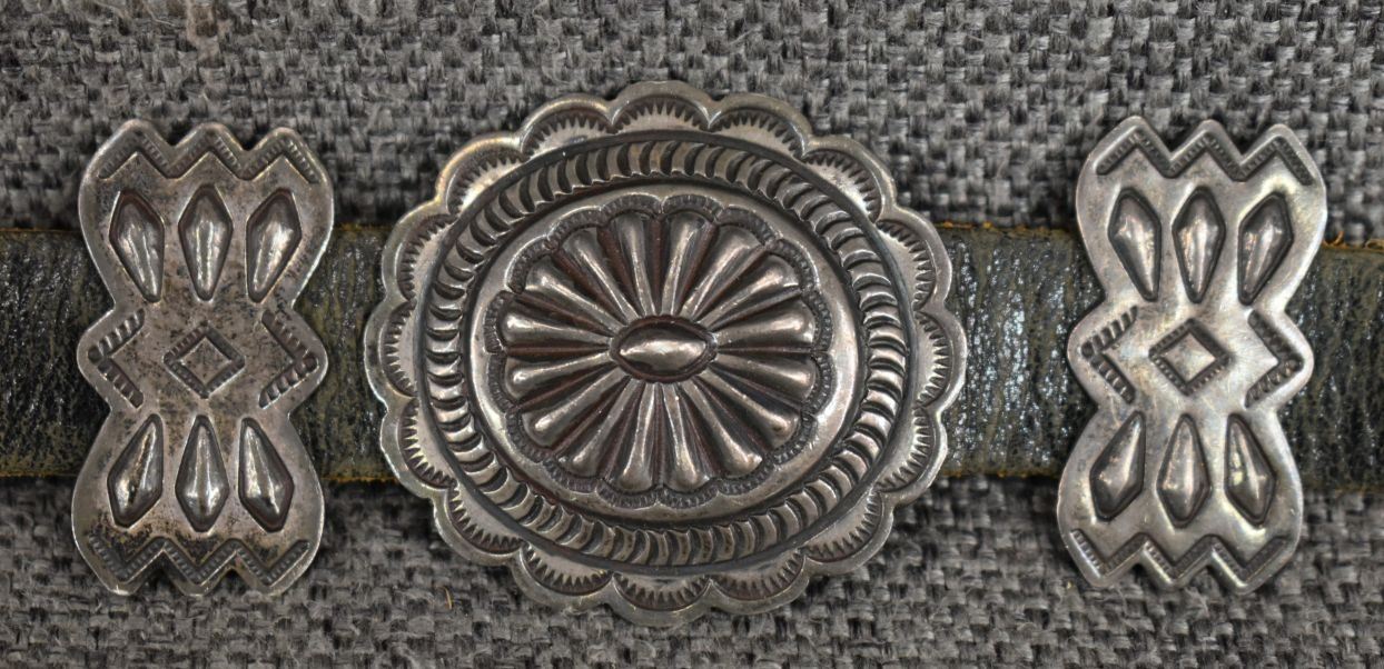 1970's Navajo, sterling silver stamped design signed R S for Roger skeet Jr. buckle 1.5" x 2", nine conchos 1.5" x 1.75", nine butterfly's .75" x 1.25" total weigh excluding the .75" x 34" leather belt 165 grams