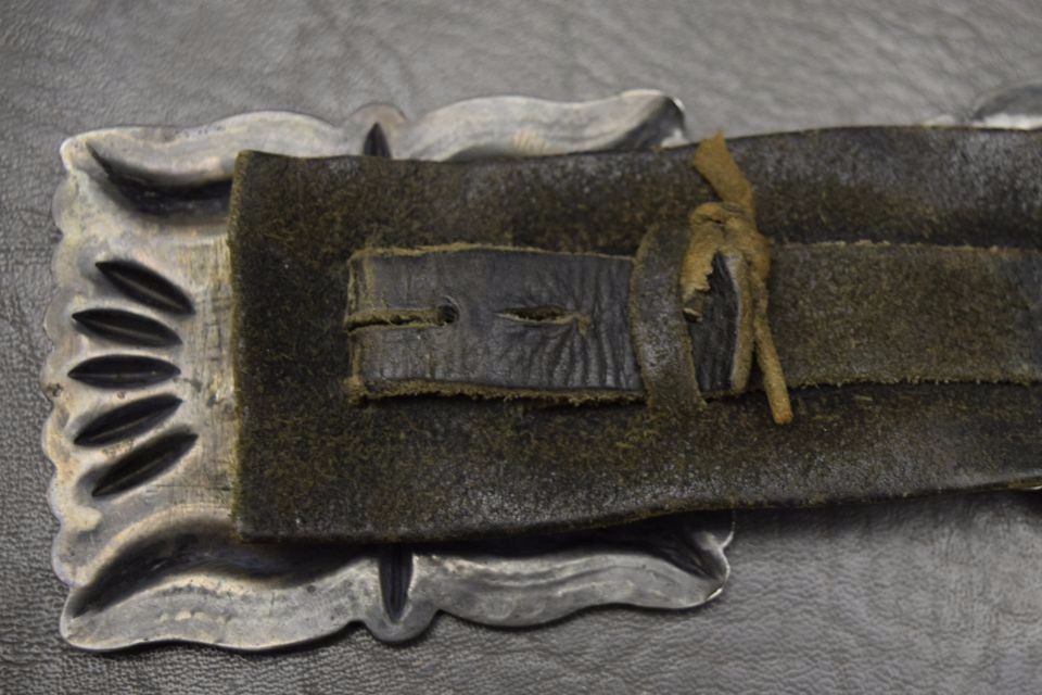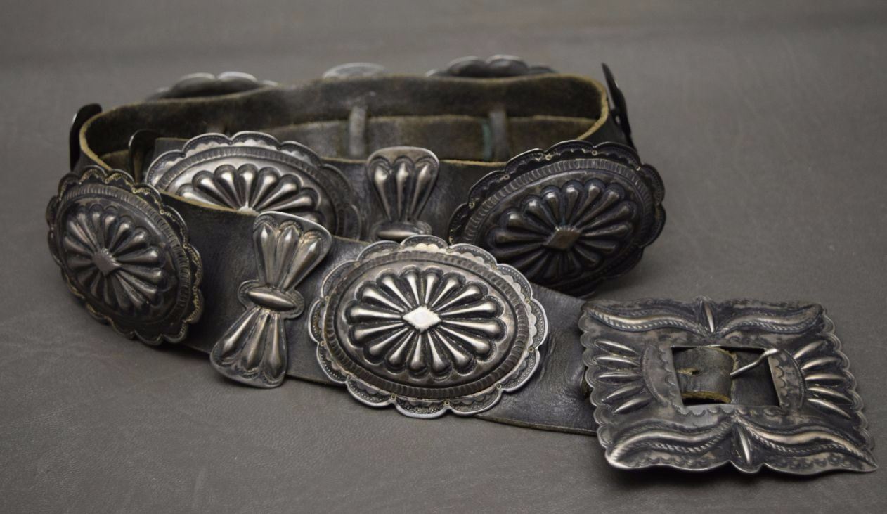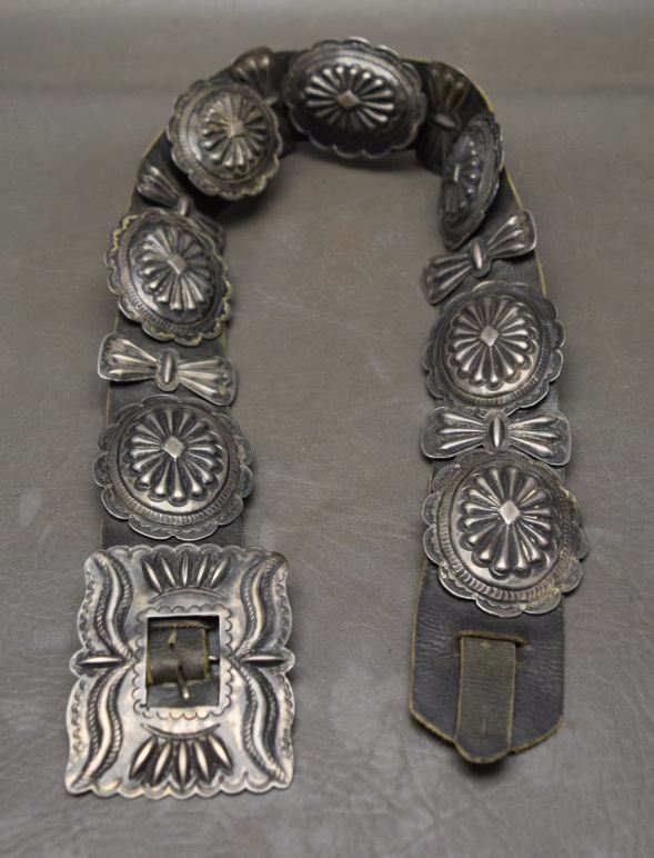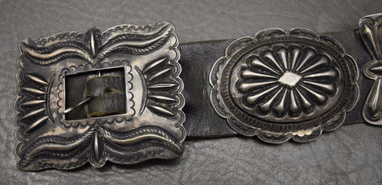 1960's sterling silver buckle 2.25'' x 3'' seven matching Conchos 2'' x 2.75'' and six butterfly's 2'' x 1'' leather is 1.75'' x 29'' total weight of silver 260 grams