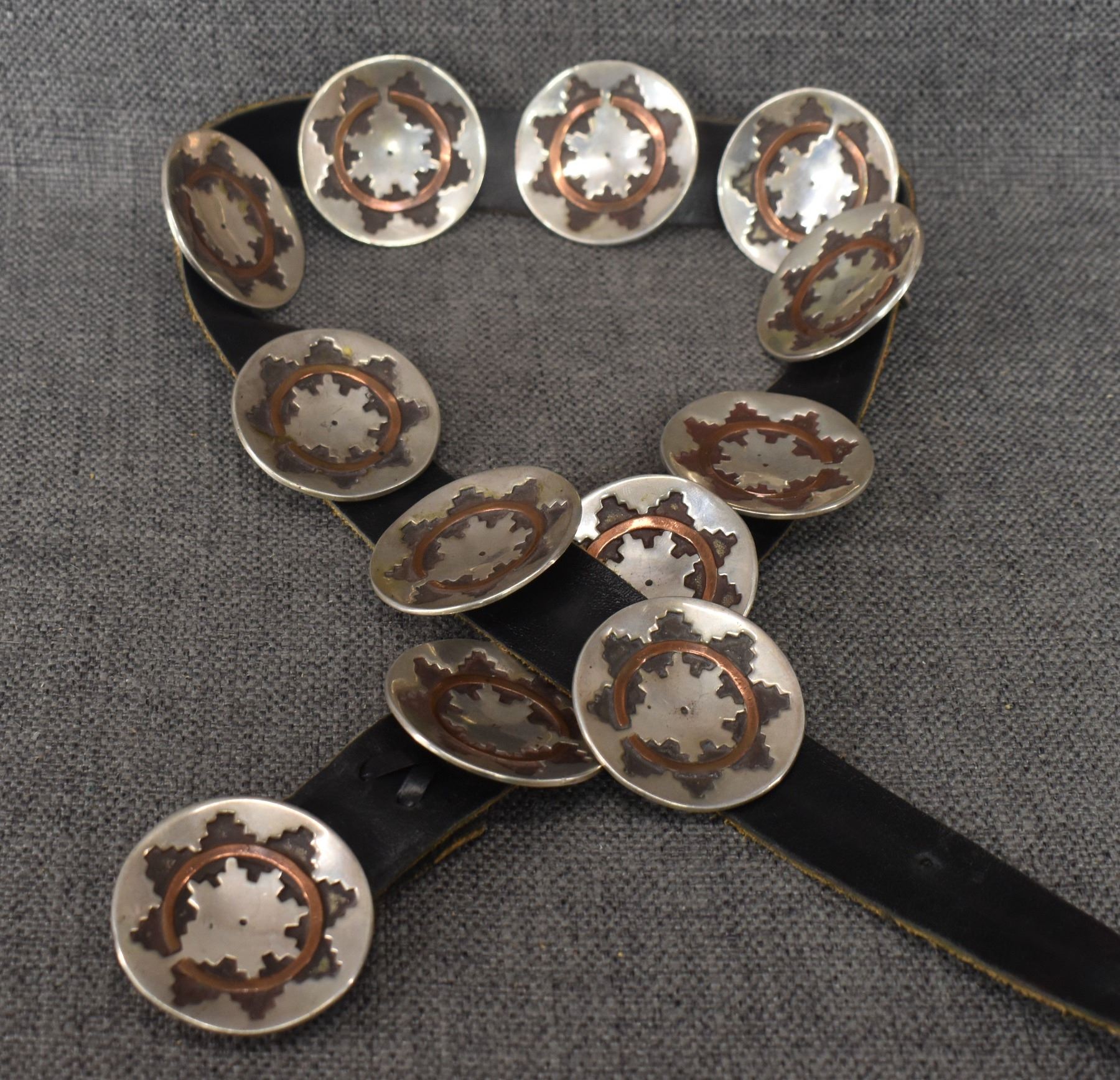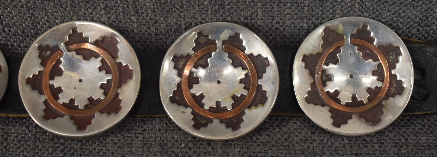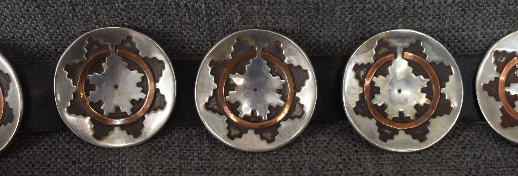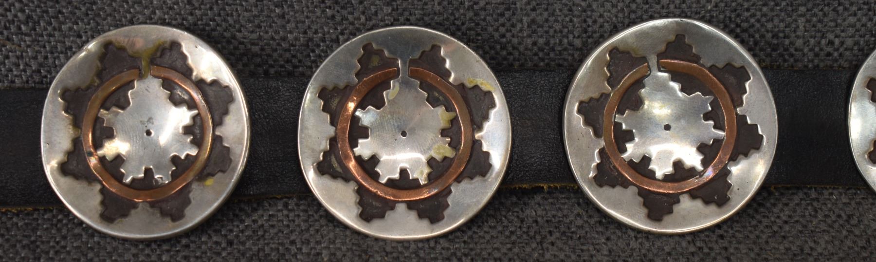 1970's Navajo. Sterling silver buckle with wedding basket design and matching conchos 2'' dia. Total weight 440 grams. Excluding 1.25'' x 40'' leather belt