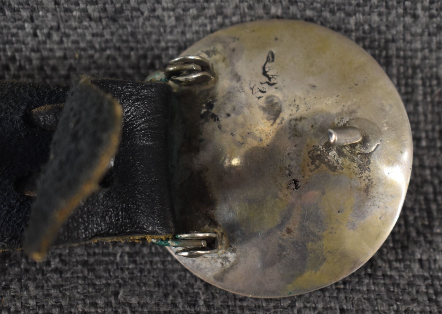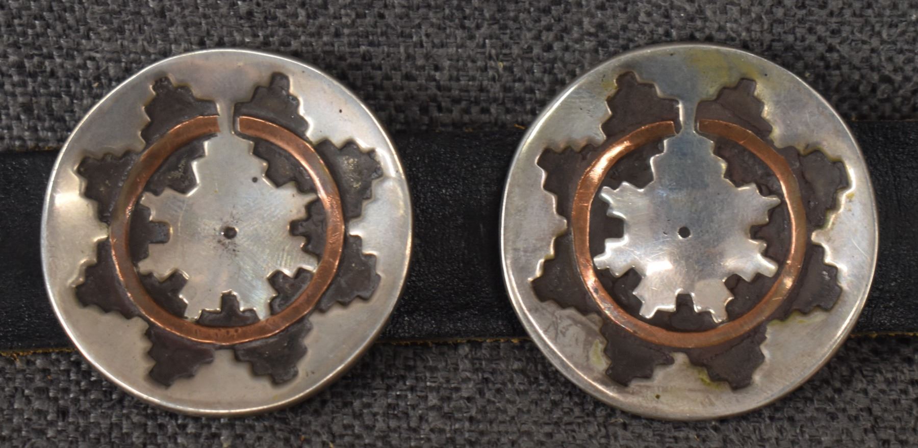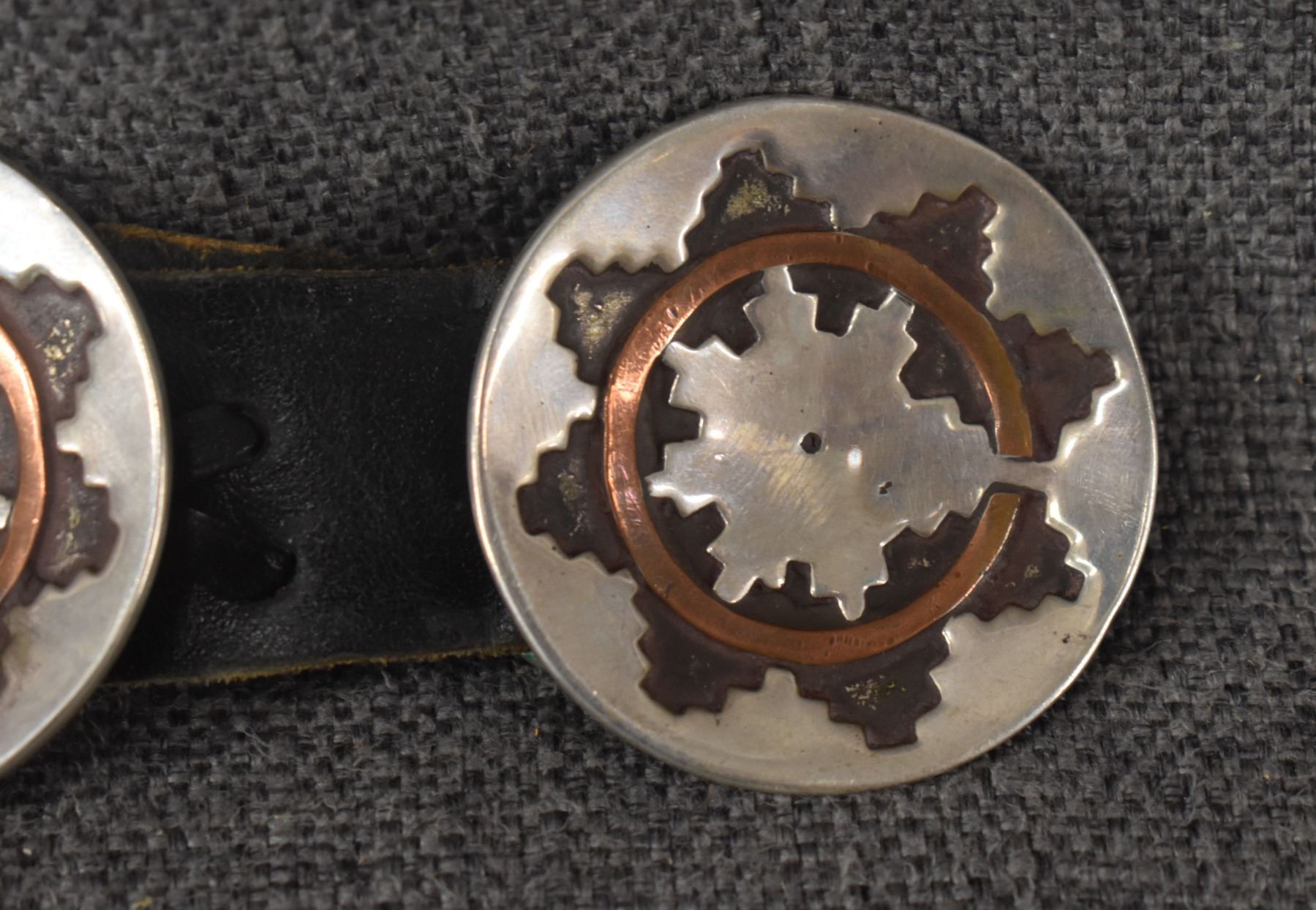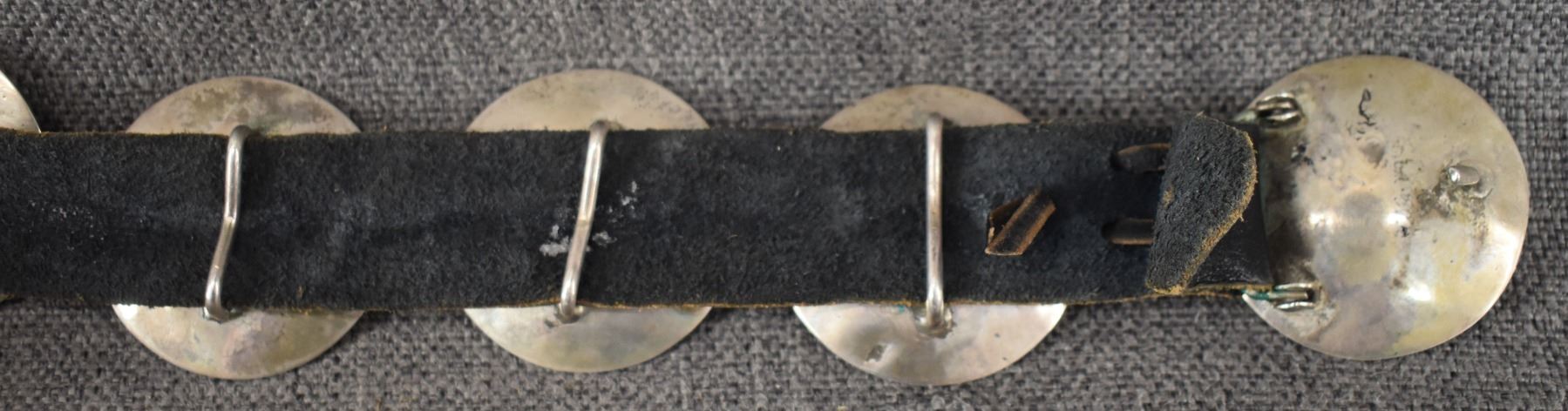 1970's Navajo. Sterling silver buckle with wedding basket design and matching conchos 2'' dia. Total weight 440 grams. Excluding 1.25'' x 40'' leather belt