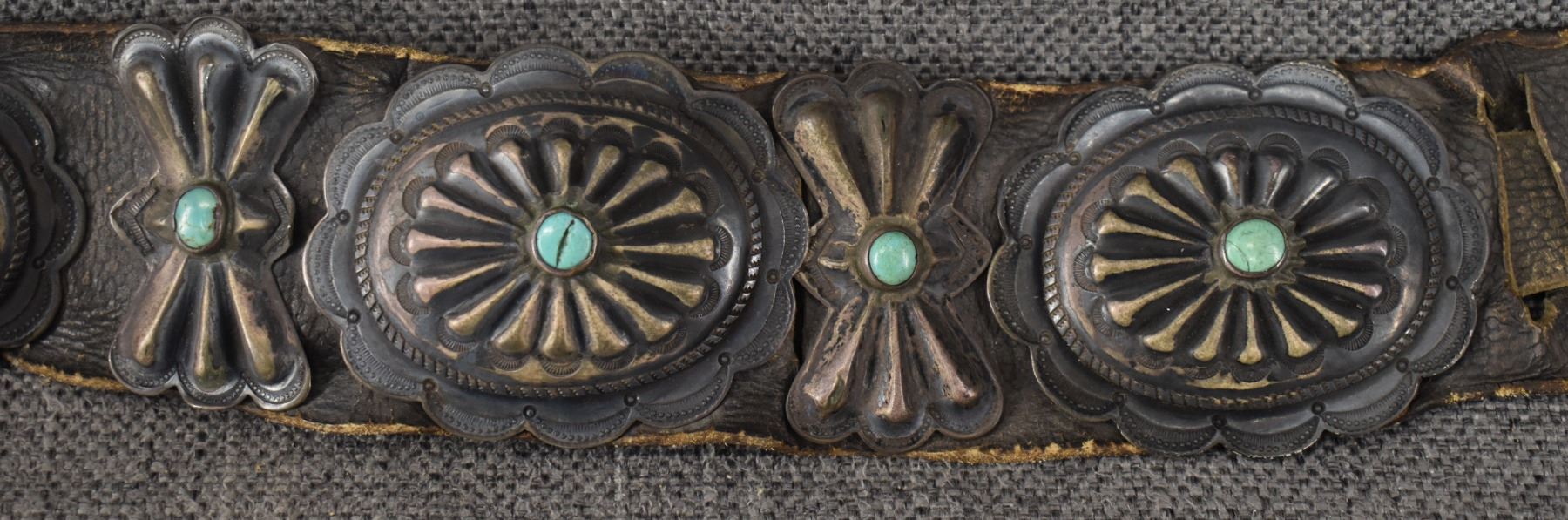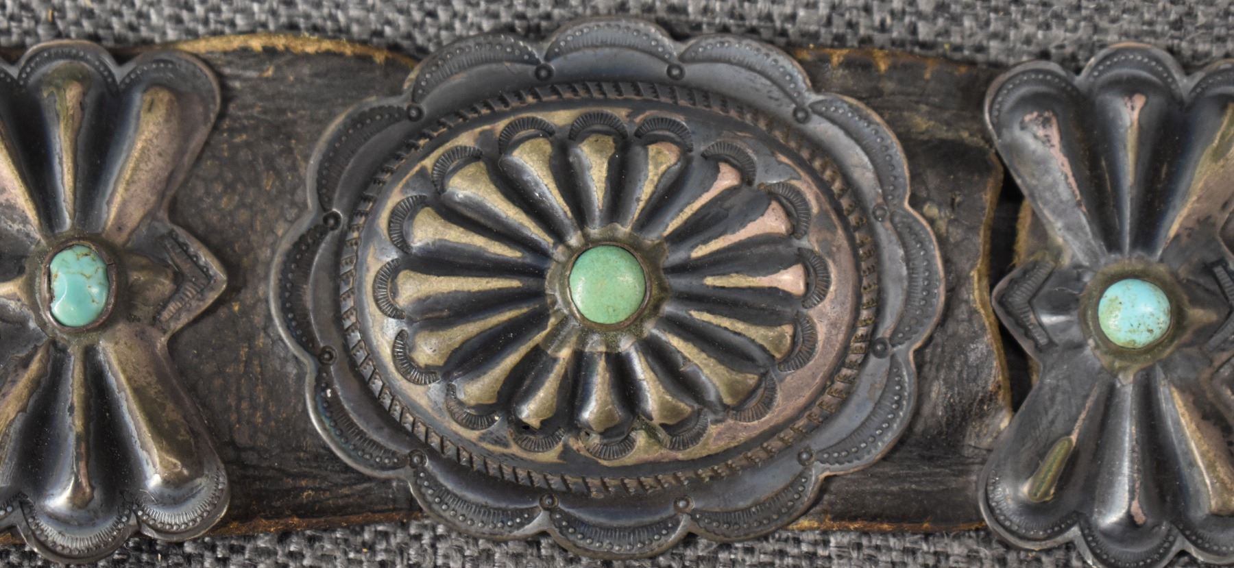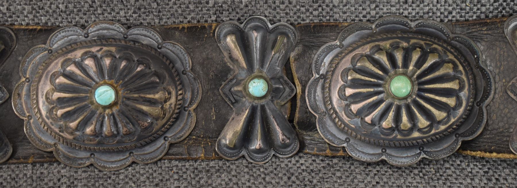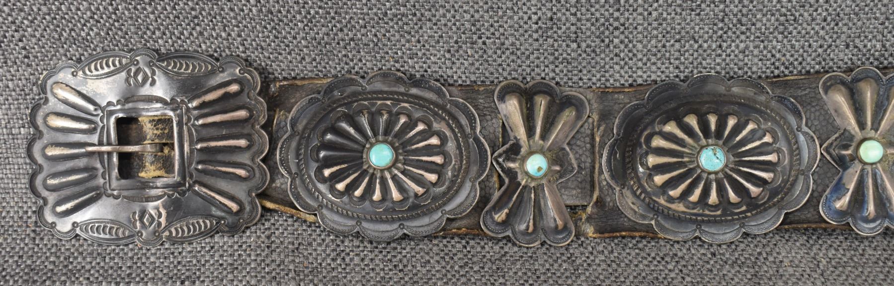 1930's Navajo. Sterling silver buckle 2.5'' x 3'' seven sterling and turquoise conchos 2'' x 2.5'' . Six butterflies 2'' x 1.25'' . Leather belt 2'' x 33''