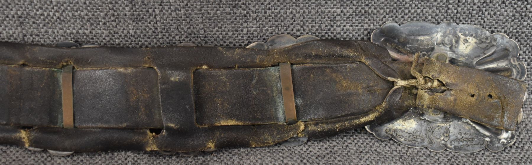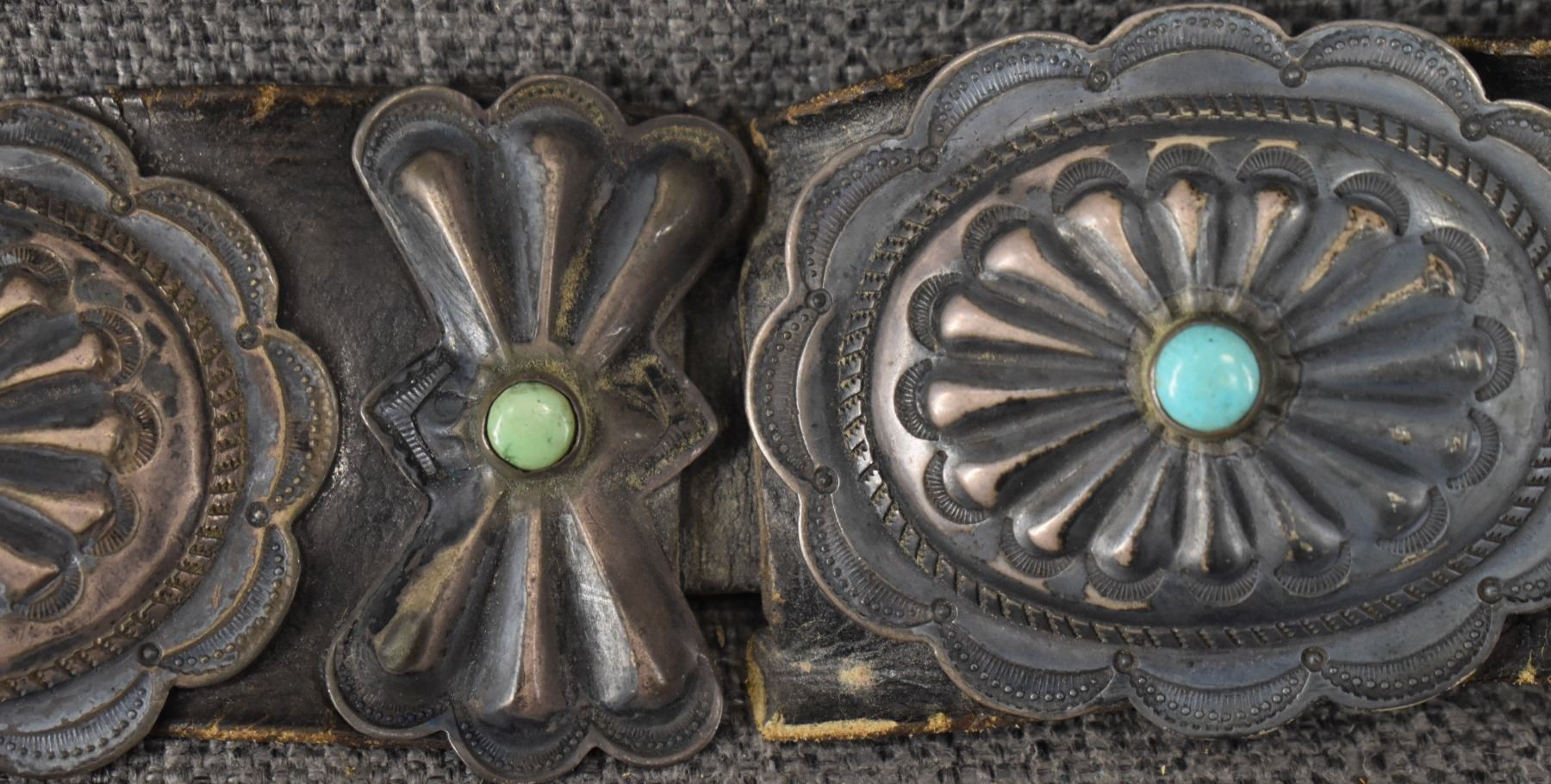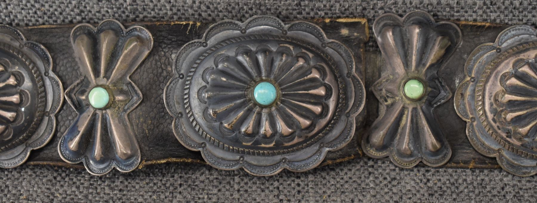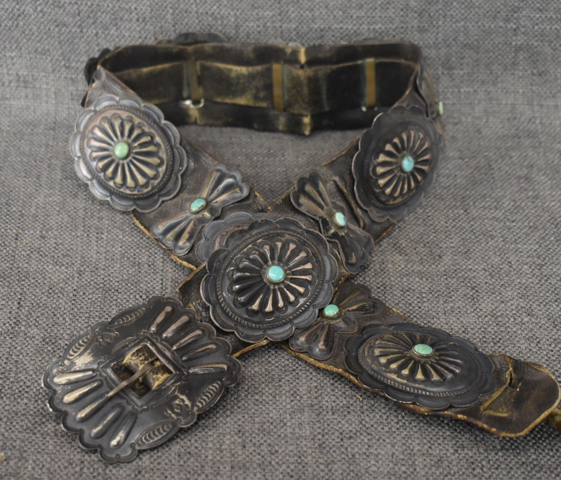 1930's Navajo. Sterling silver buckle 2.5'' x 3'' seven sterling and turquoise conchos 2'' x 2.5'' . Six butterflies 2'' x 1.25'' . Leather belt 2'' x 33''