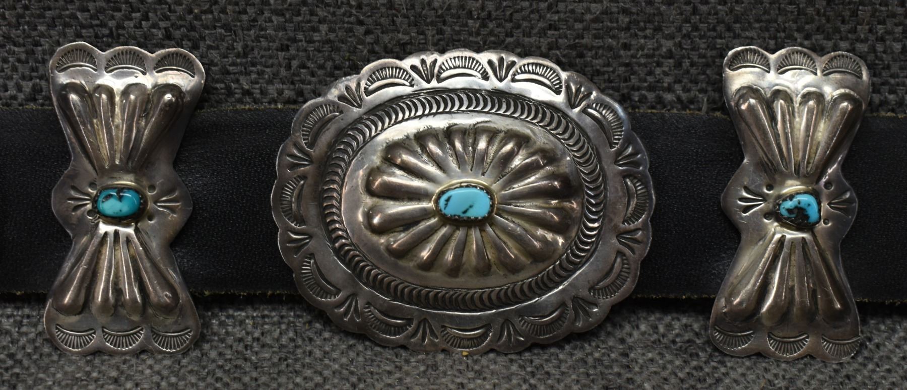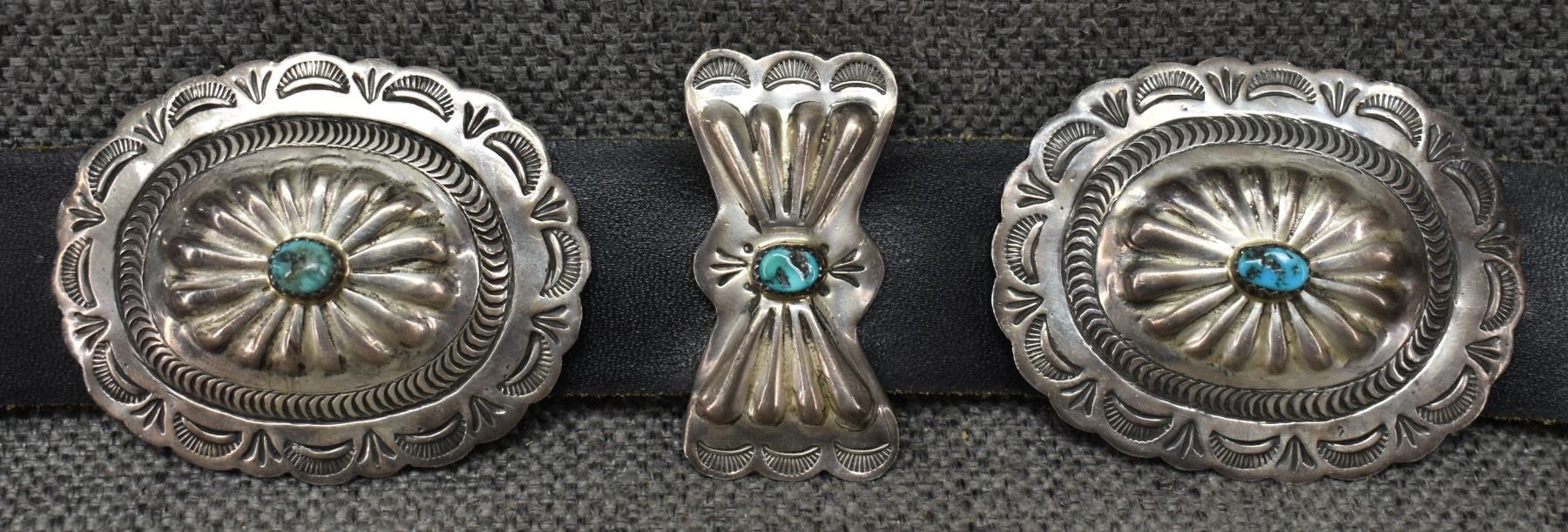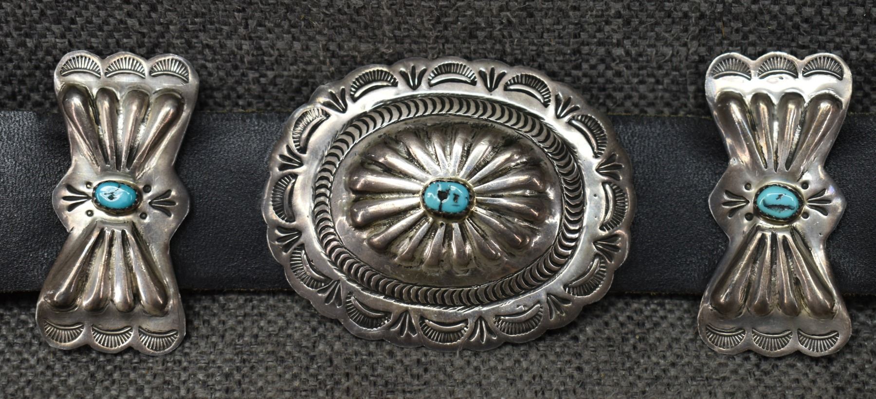 1970's Navajo. Sterling silver and turquoise buckle 2.75'' x 3.25'' eight 2'' x 1'' buttery fly's. Seven 2'' x 2.5'' conchos. Total weight excluding 1.25'' x 46'' leather belt 188 grams