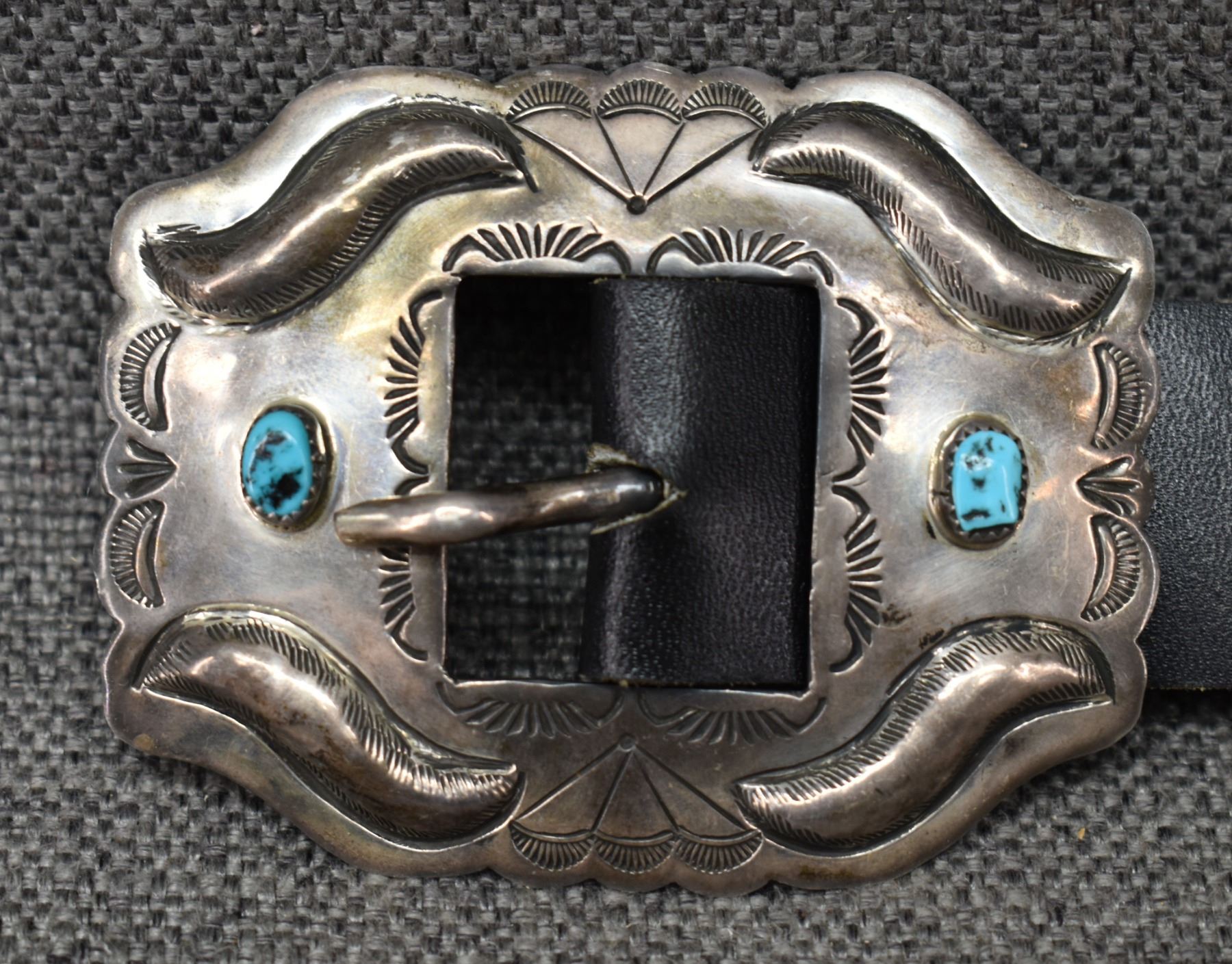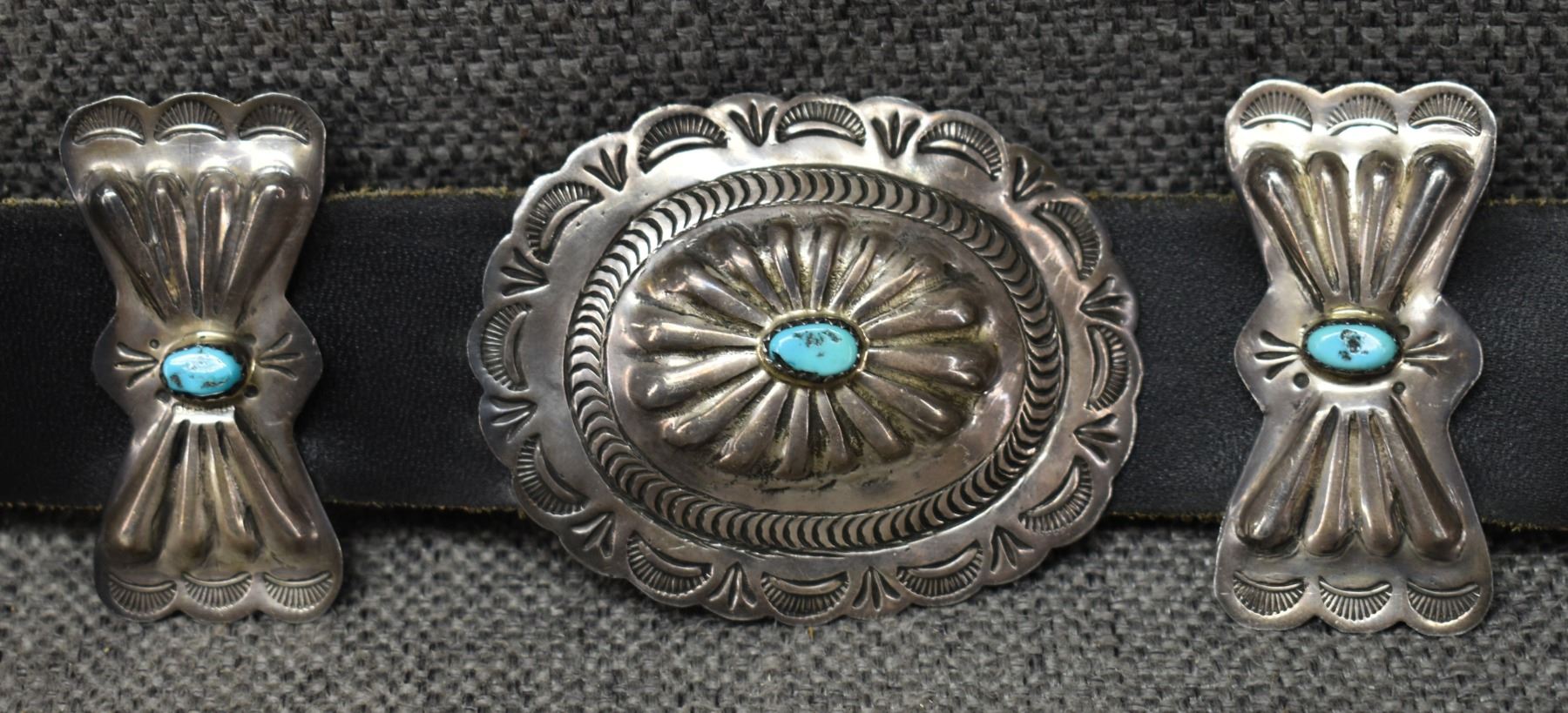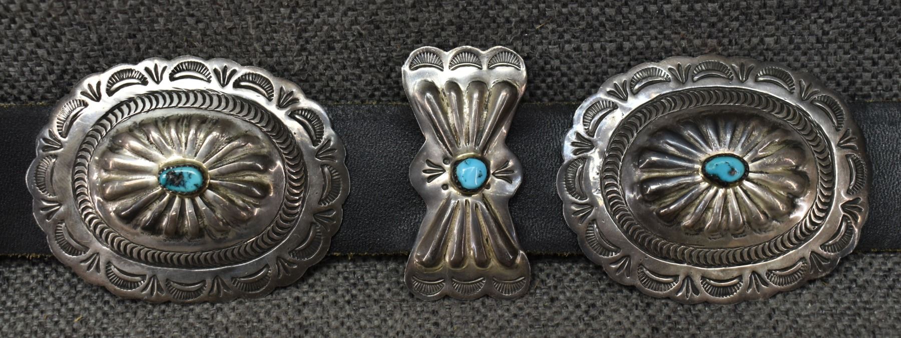 1970's Navajo. Sterling silver and turquoise buckle 2.75'' x 3.25'' eight 2'' x 1'' buttery fly's. Seven 2'' x 2.5'' conchos. Total weight excluding 1.25'' x 46'' leather belt 188 grams