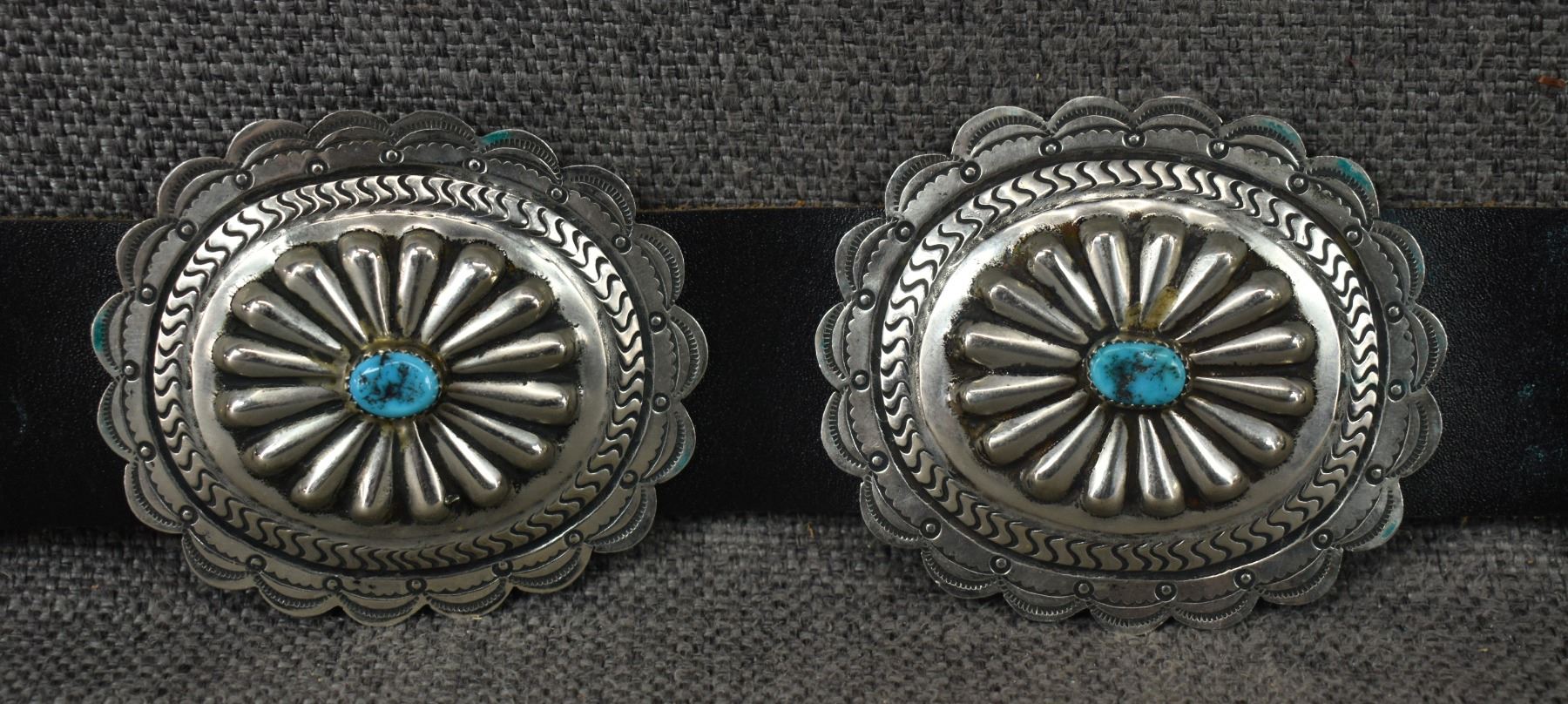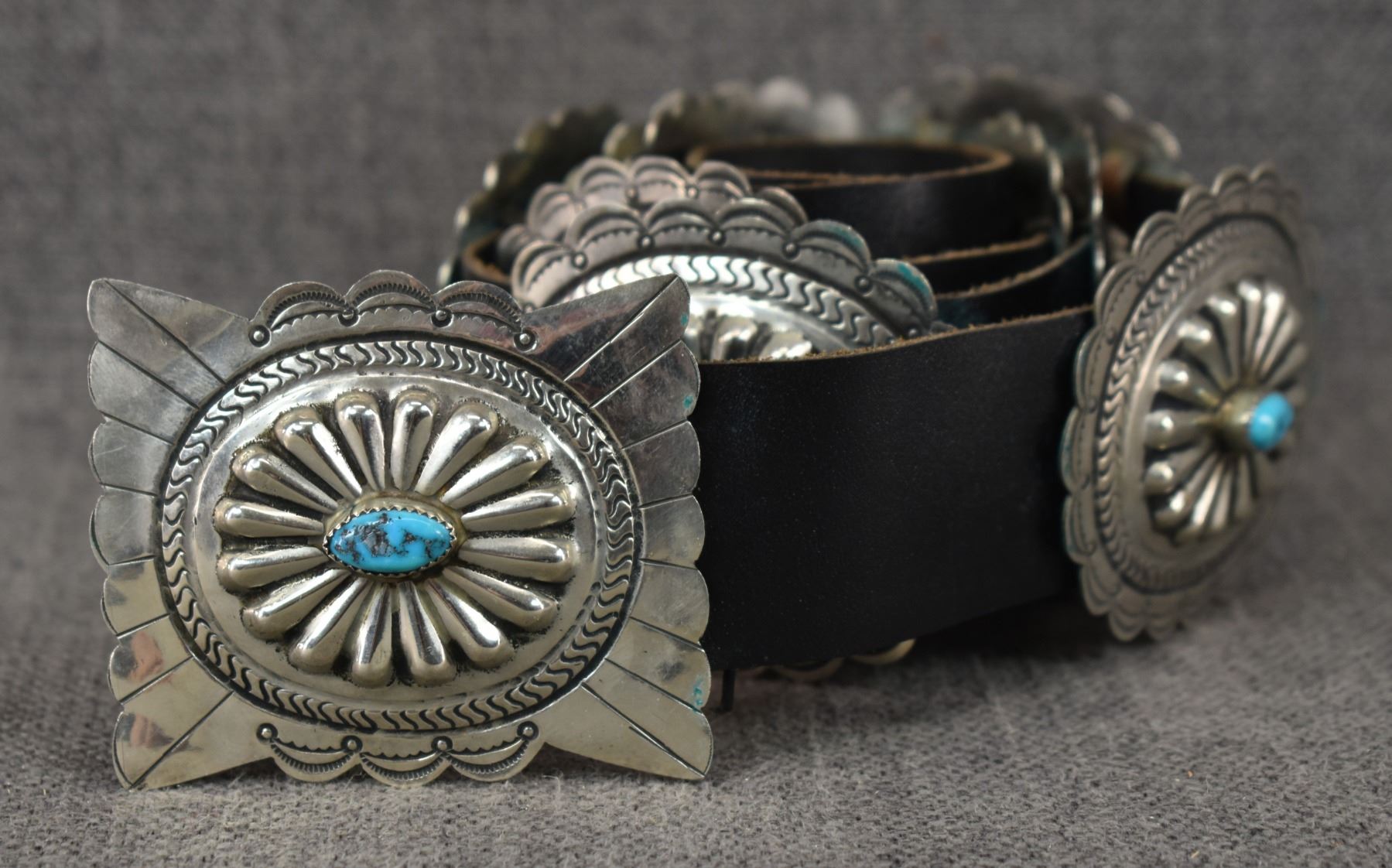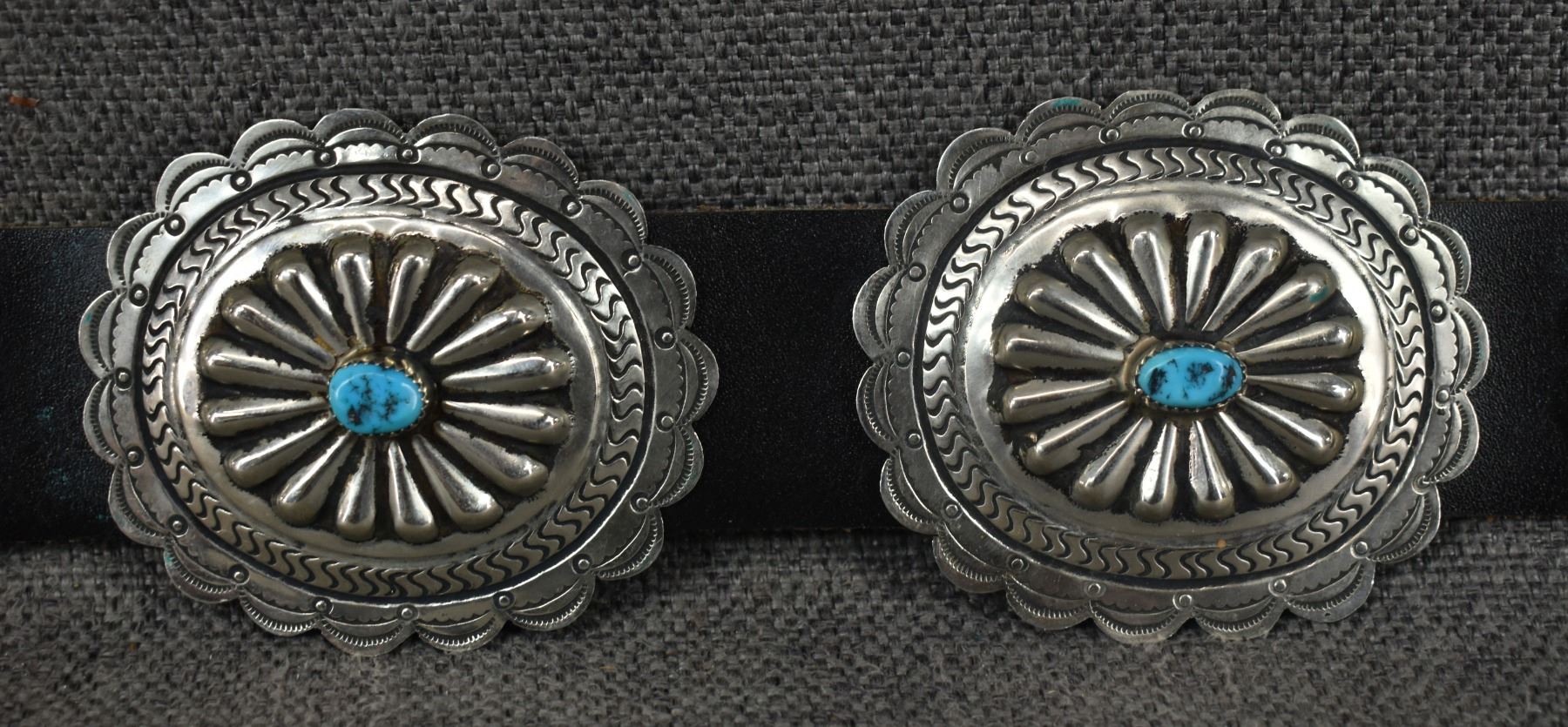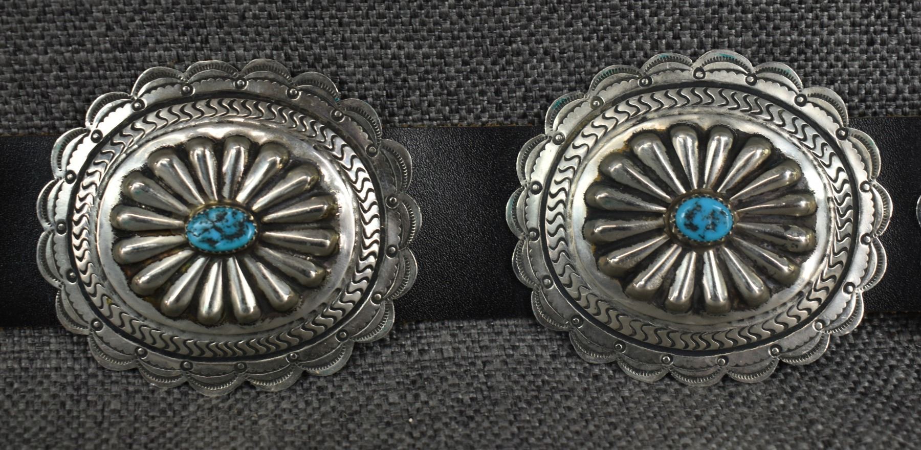 1980's Navajo. Nickle silver and turquoise buckle 3'' x 2.75'' nine matching conchos 2.5'' x 3''. Total weight 320 grams excluding 1.5''x 48'' leather belt