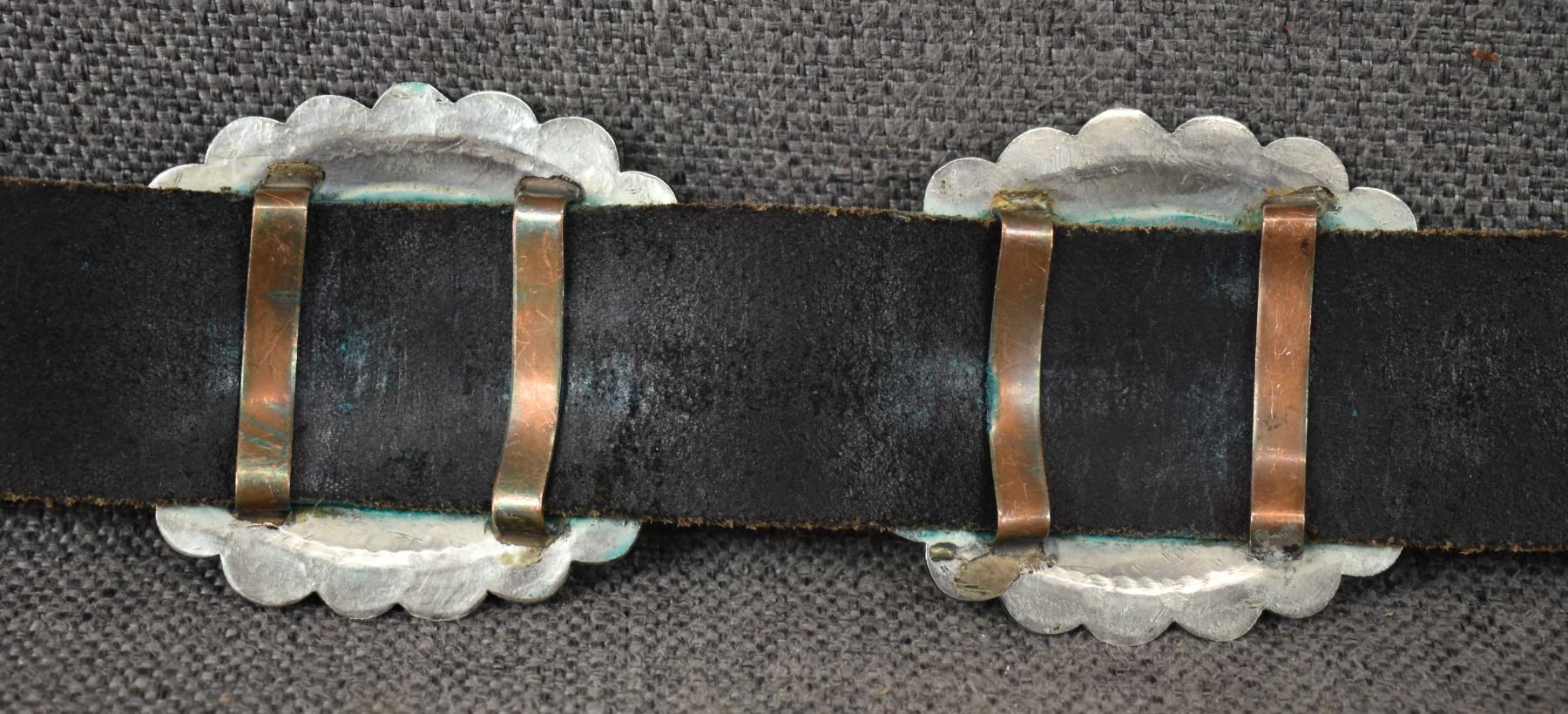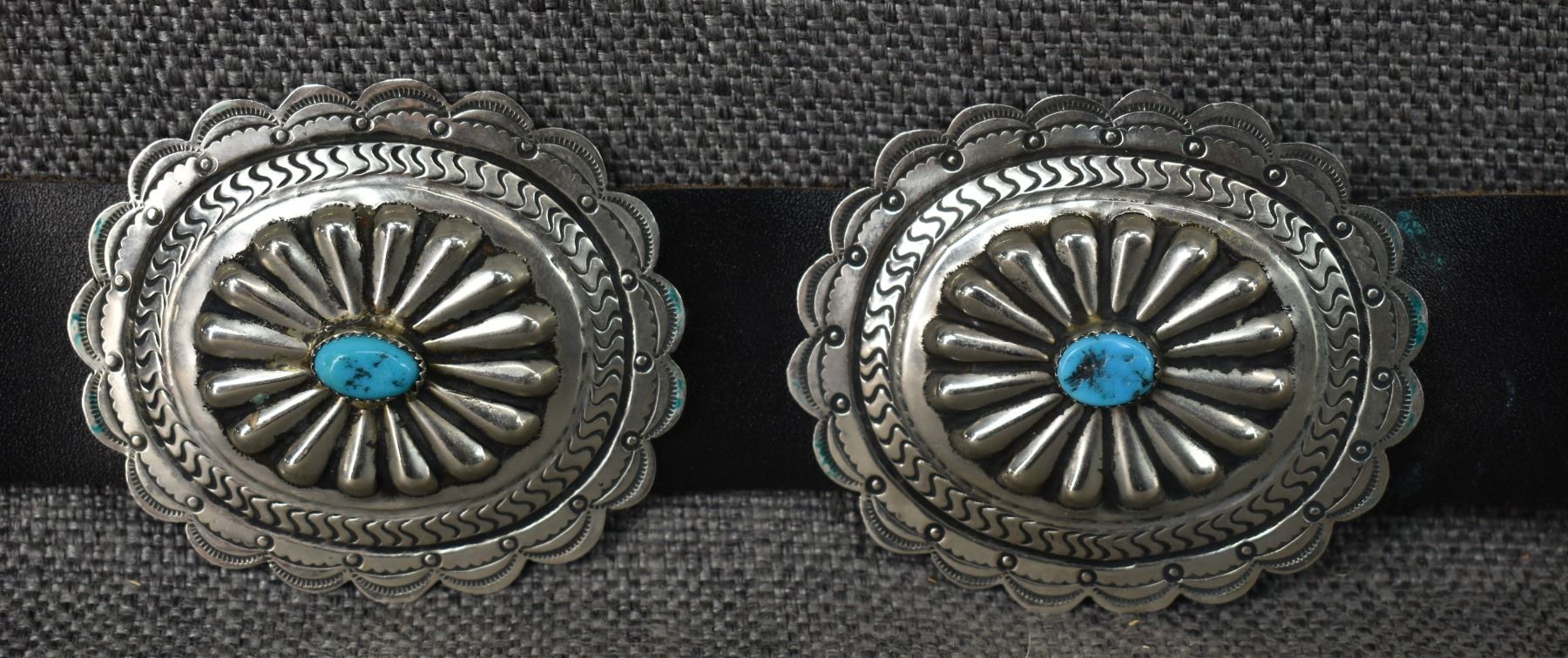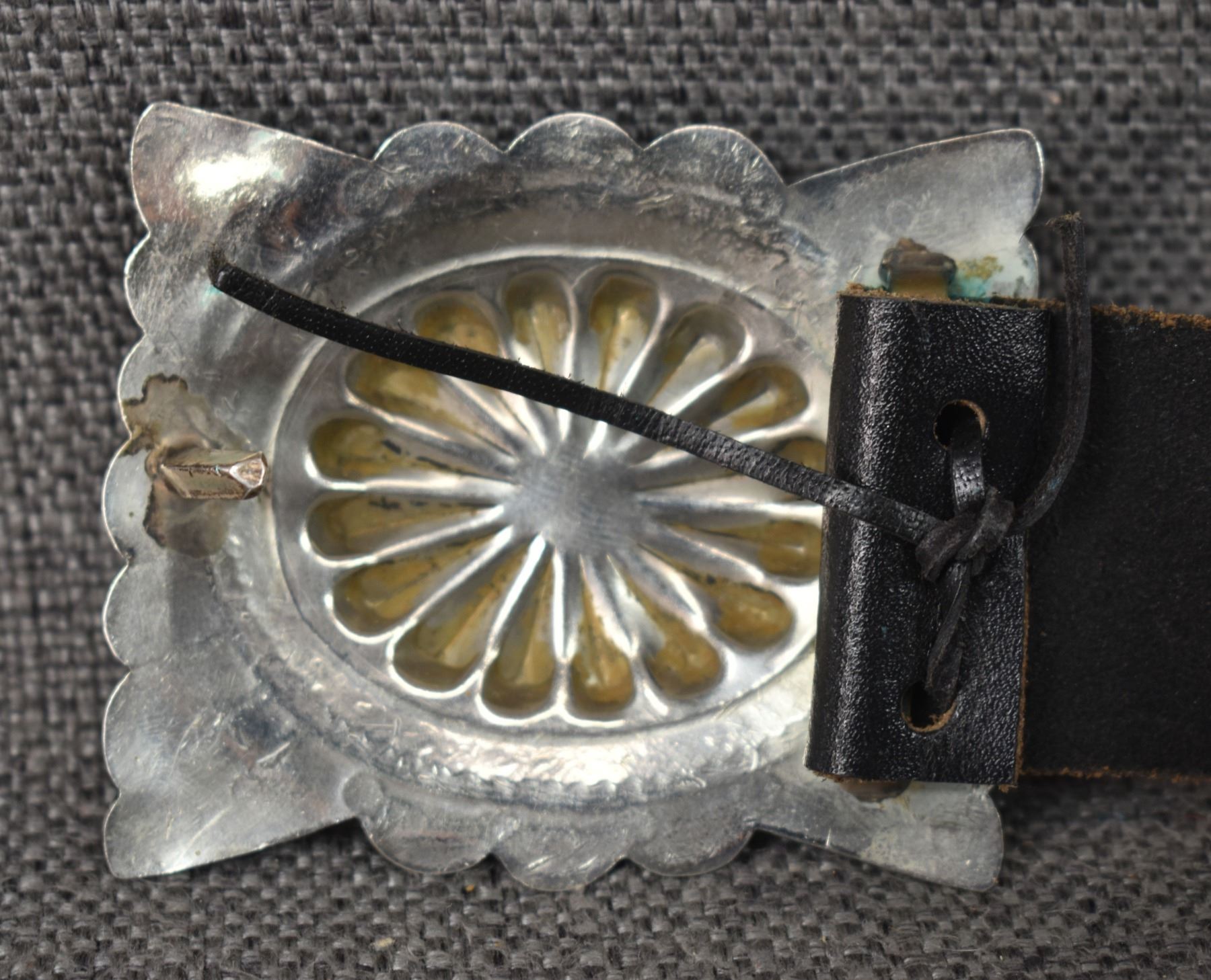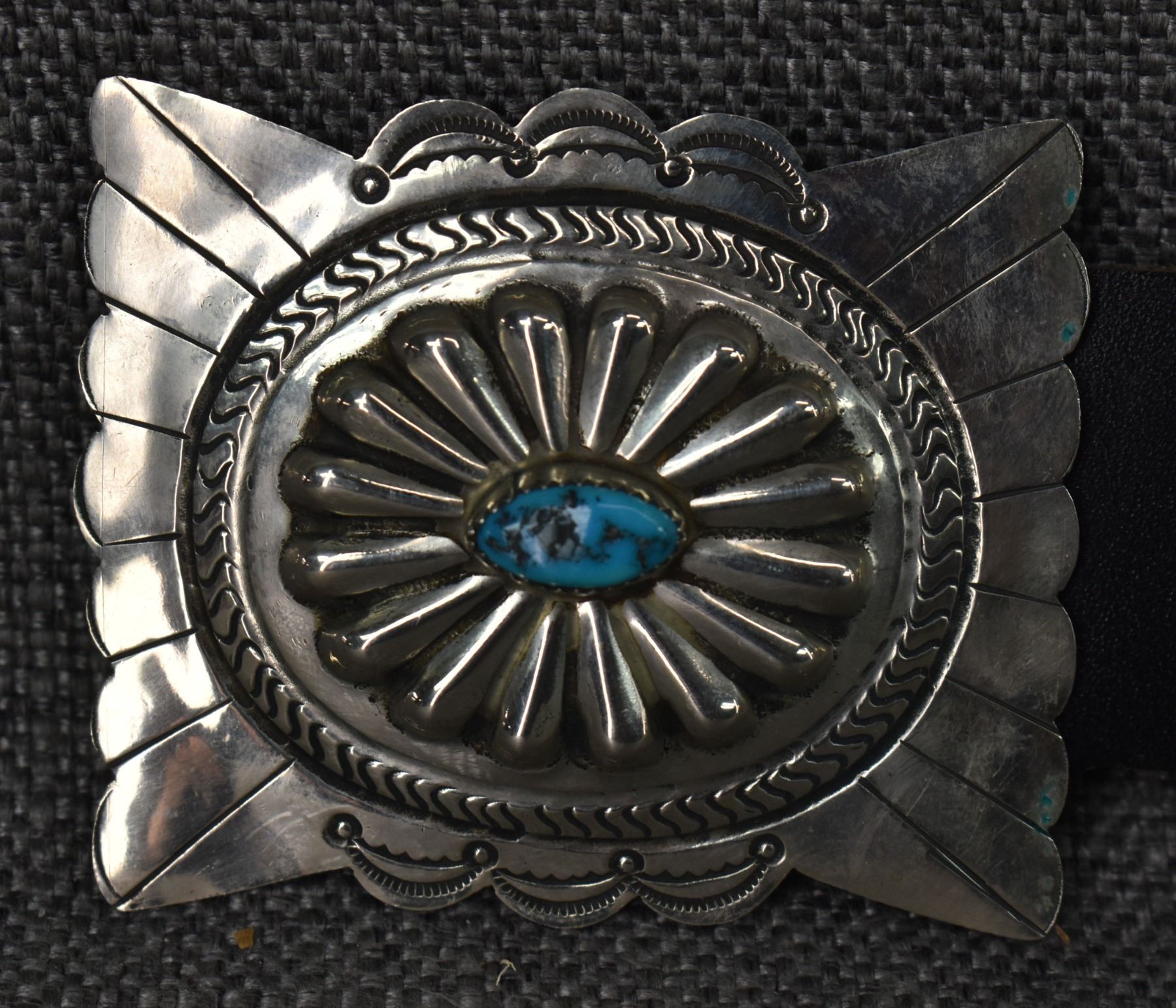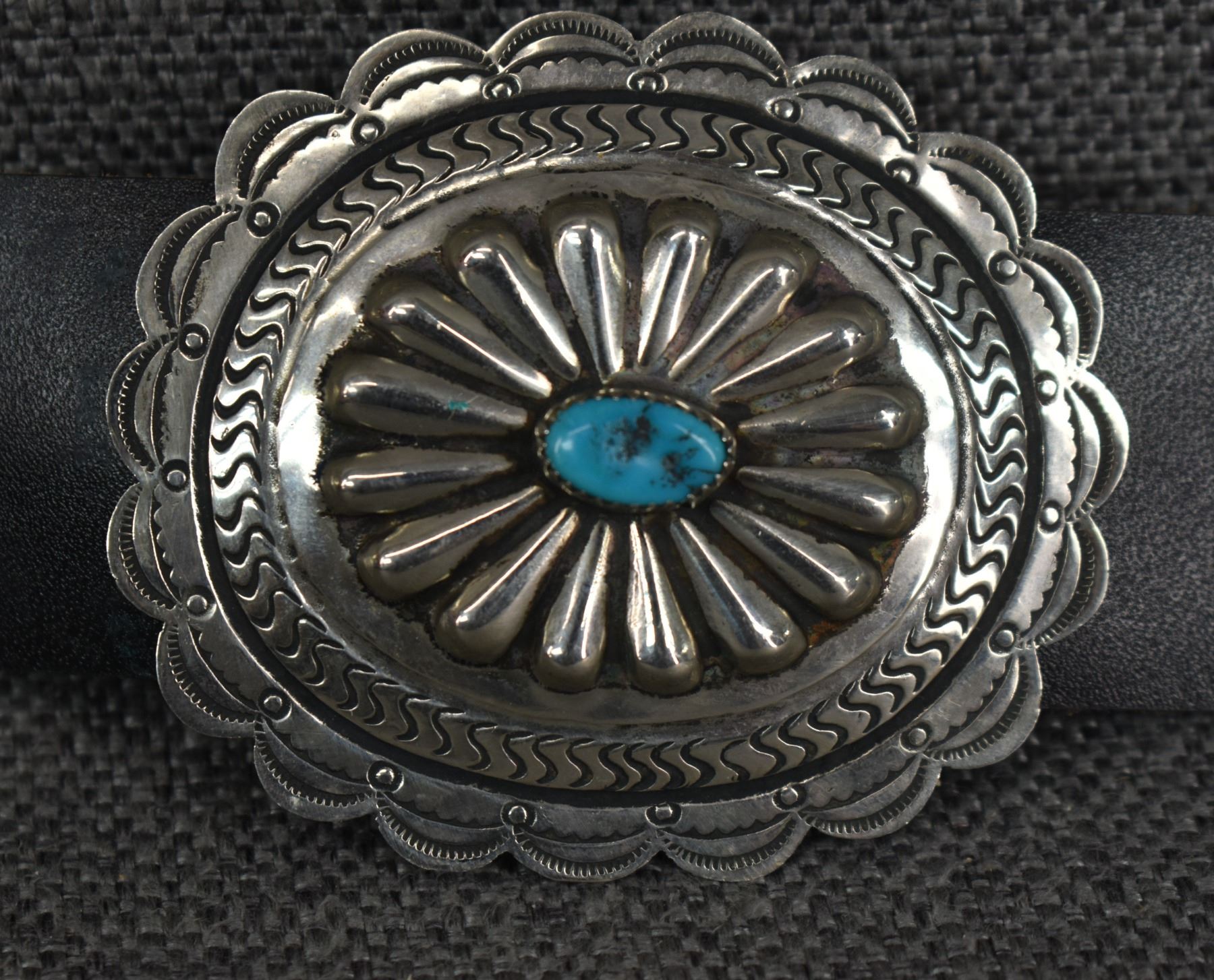 1980's Navajo. Nickle silver and turquoise buckle 3'' x 2.75'' nine matching conchos 2.5'' x 3''. Total weight 320 grams excluding 1.5''x 48'' leather belt