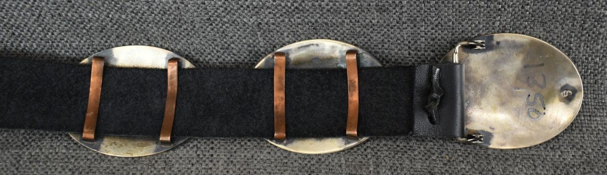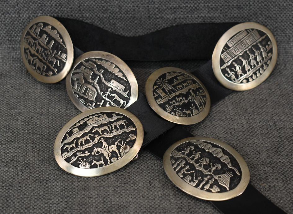 1990's Navajo, Sterling silver five conchos and buckle with various scenes from Navajo life depicting horses, dance and pueblo scenes. 2" x 2.75" fits 1.5" belt, length 51" total weight excluding belt 210 grams