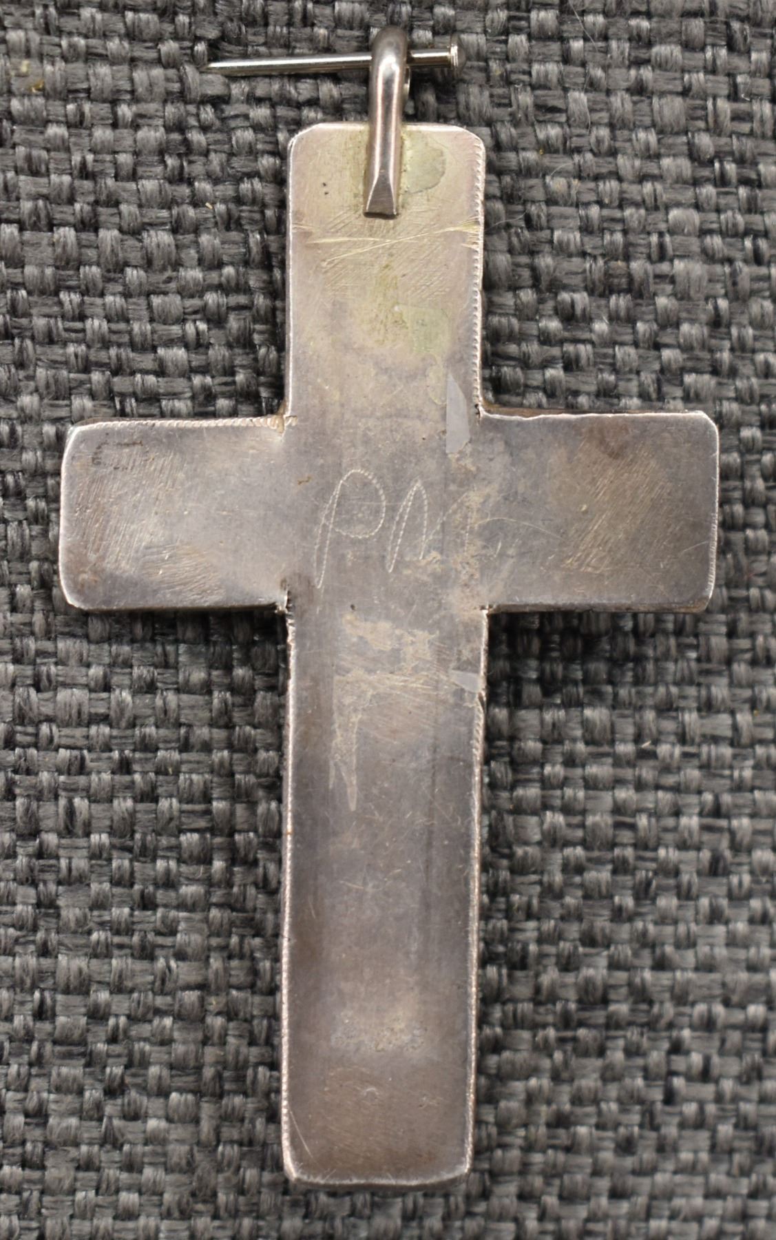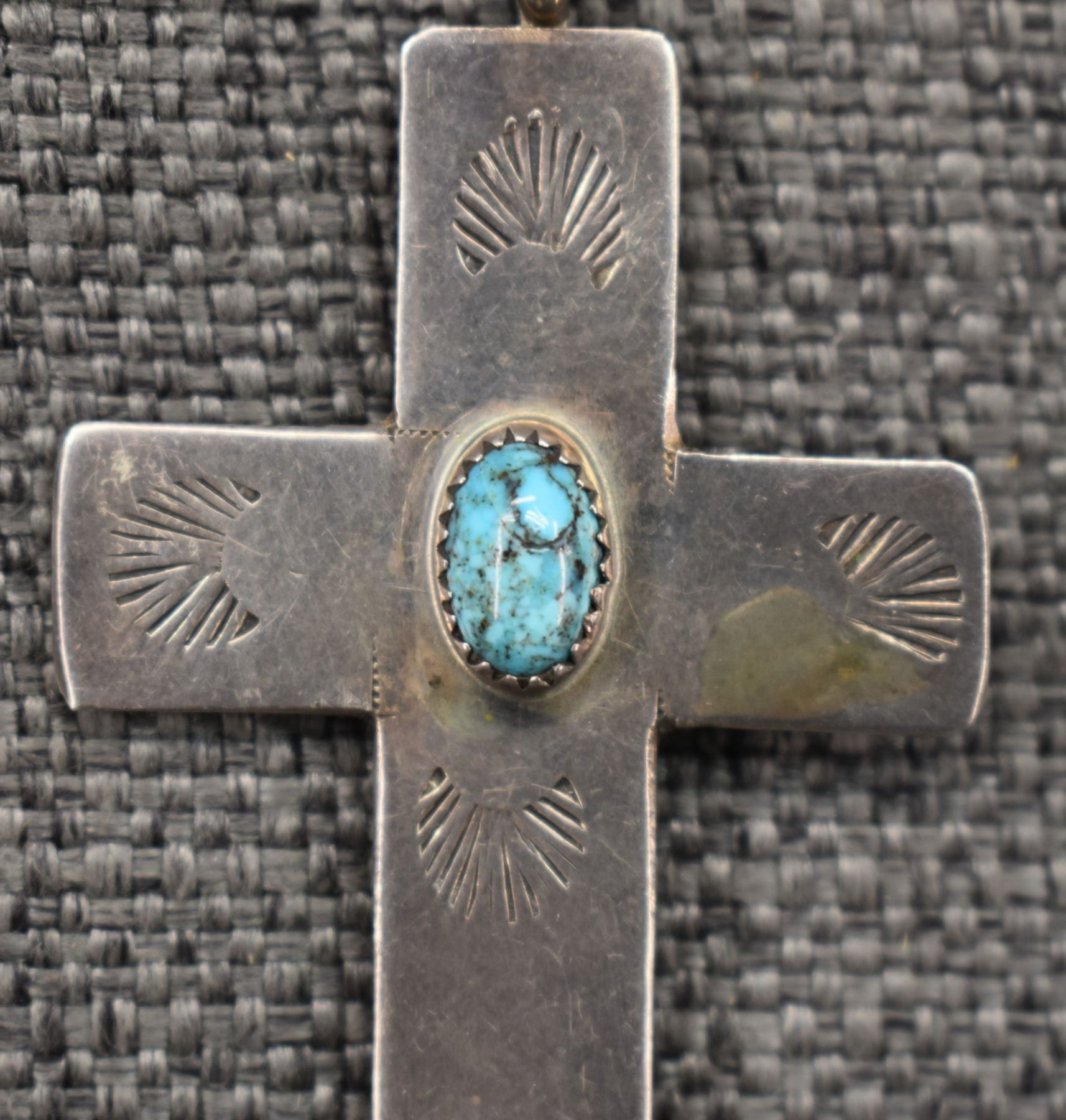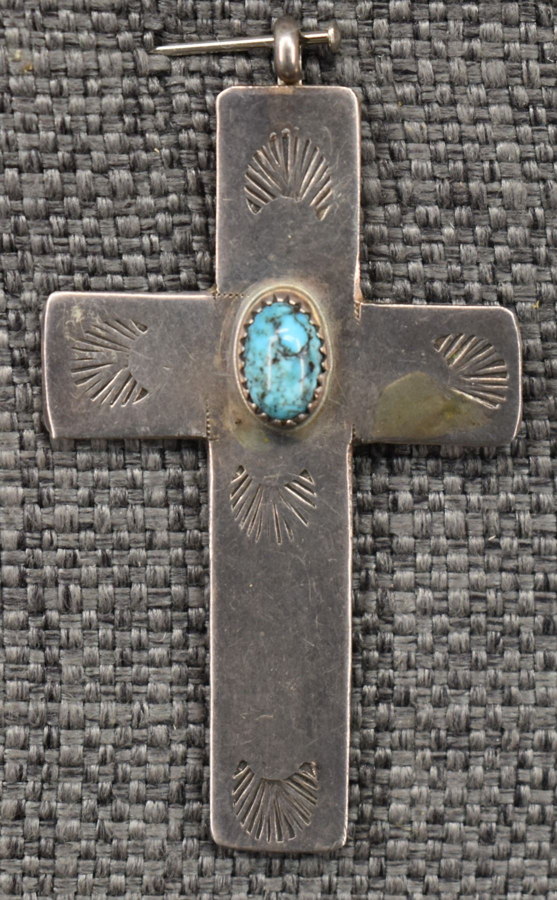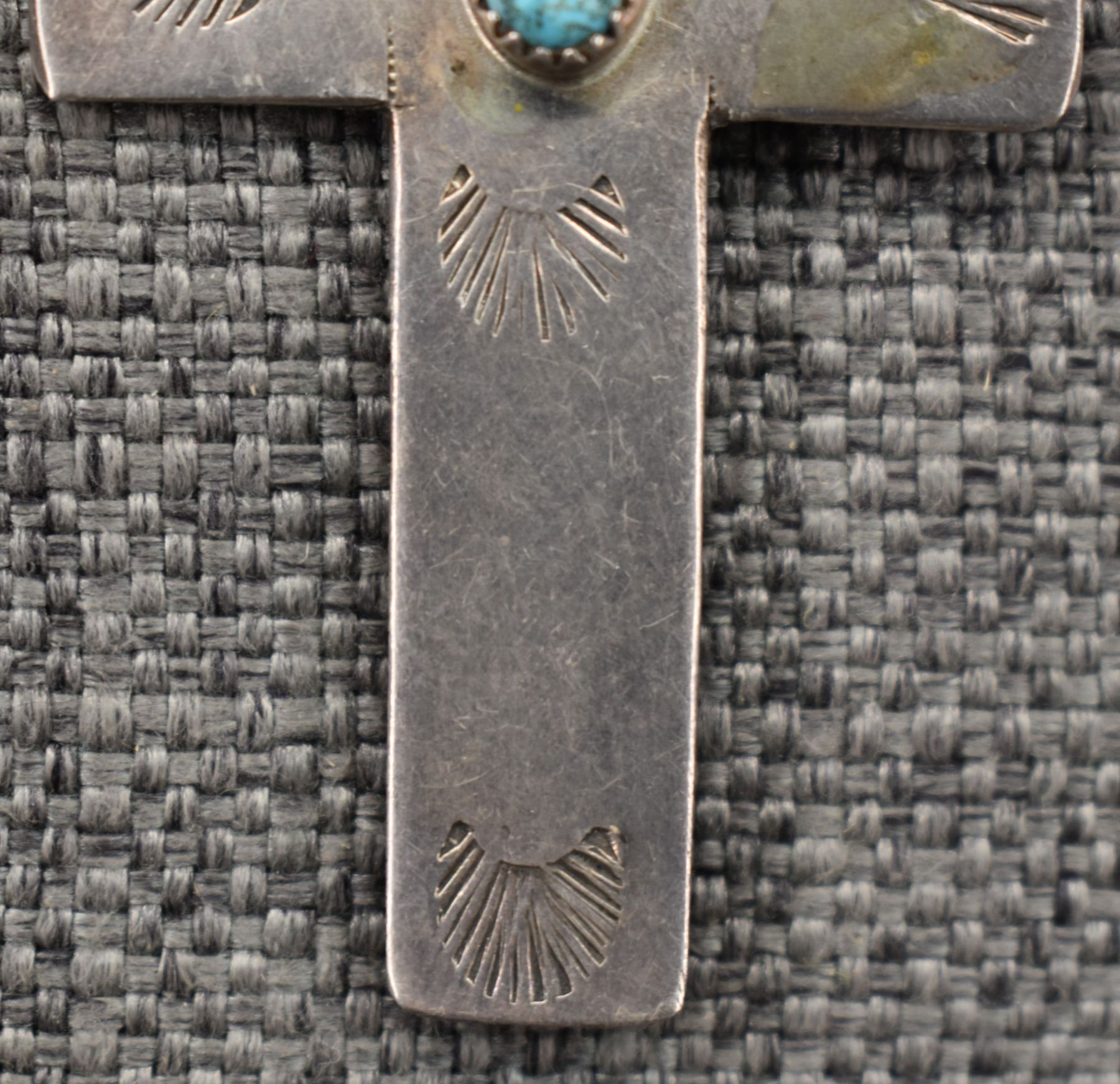 1980's Navajo, Sterling silver stamped design with turquoise stone, 2.5" x 1.5" total weight 15 grams