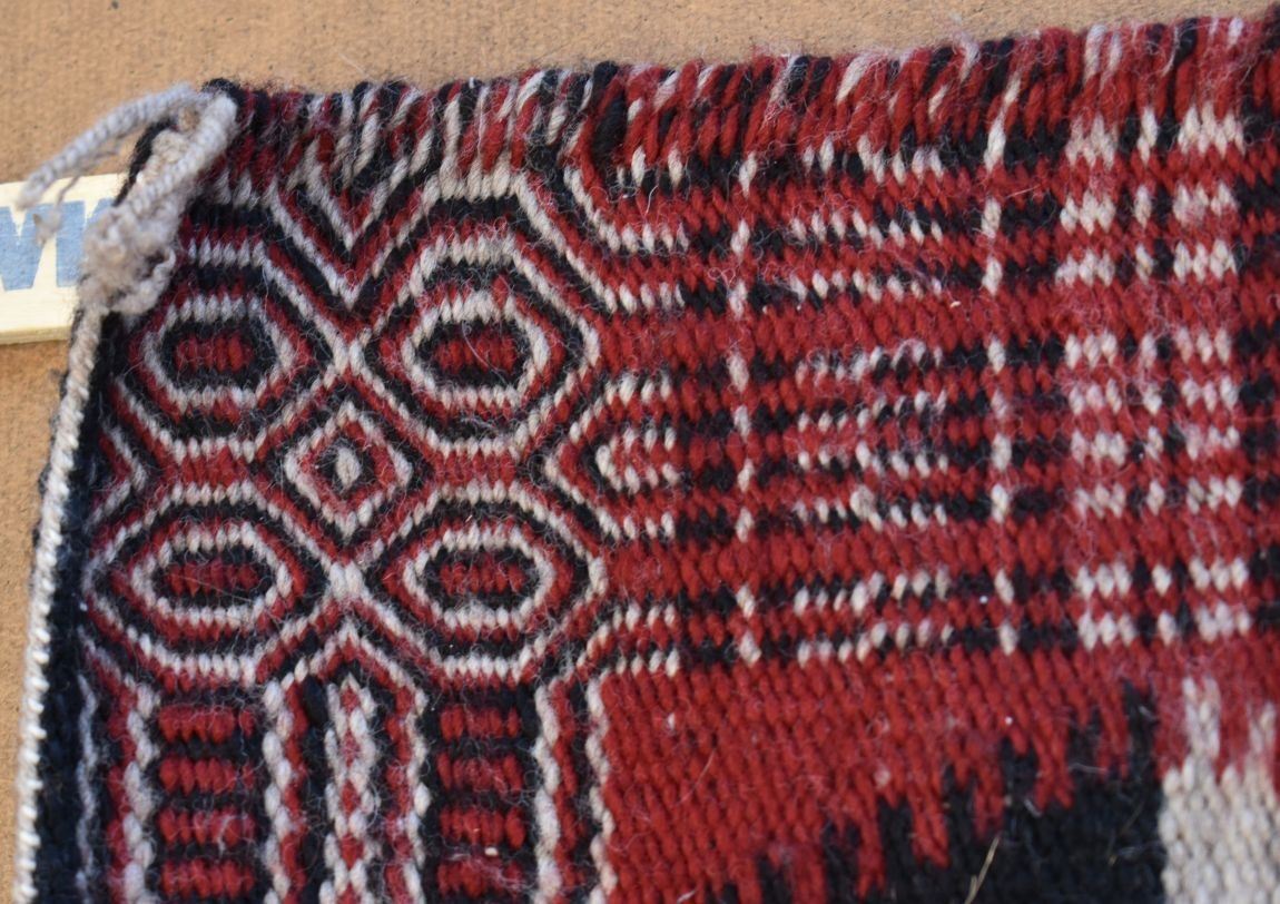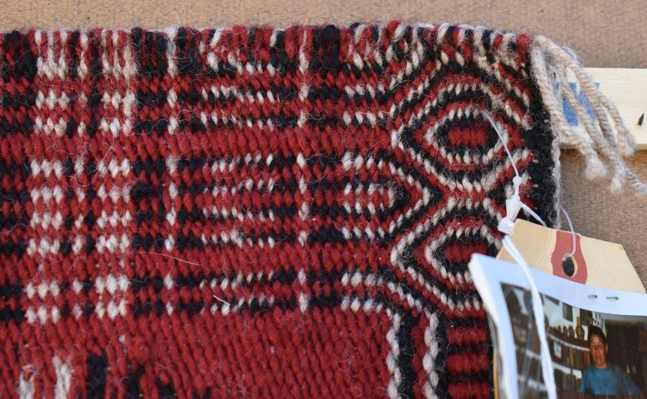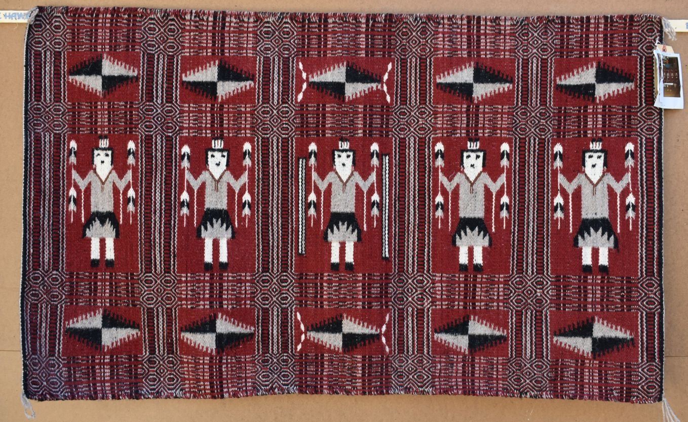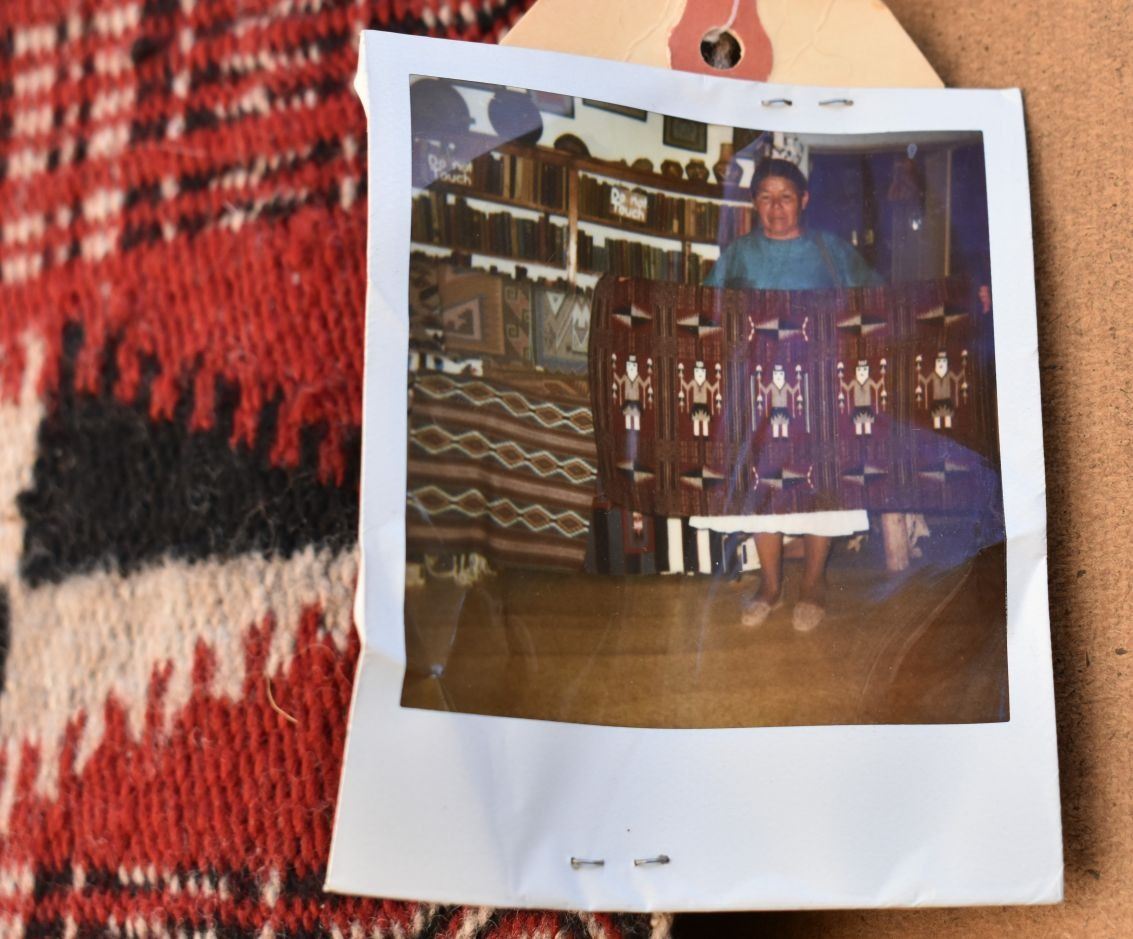 1980's Navajo, hand woven twill and Yei double sided design by Lucy Wilson, has Hubble tag and photo of weaver, 28" x 48"