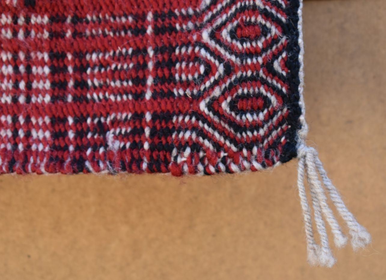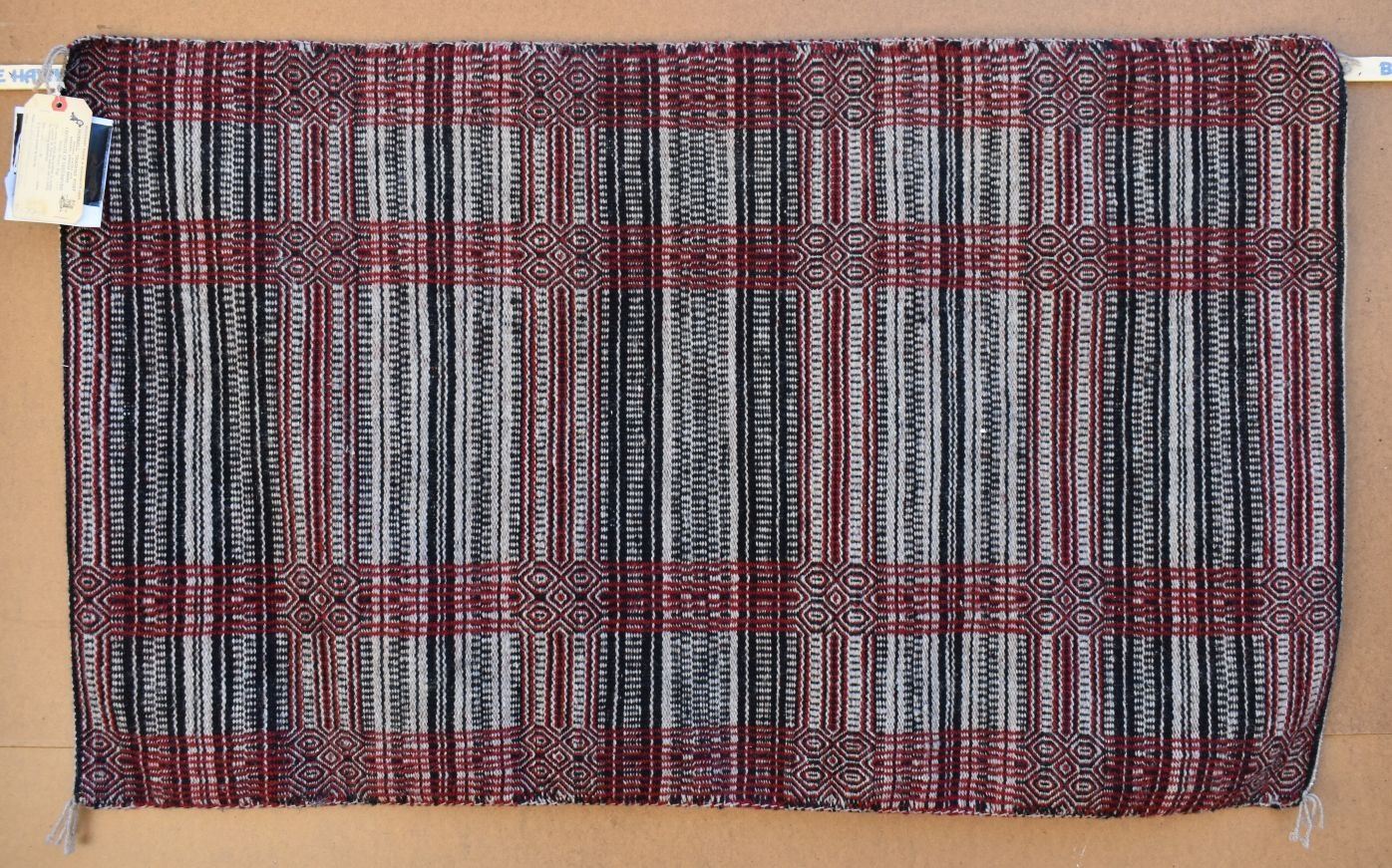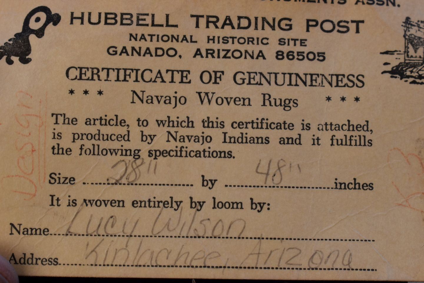 1980's Navajo, hand woven twill and Yei double sided design by Lucy Wilson, has Hubble tag and photo of weaver, 28" x 48"