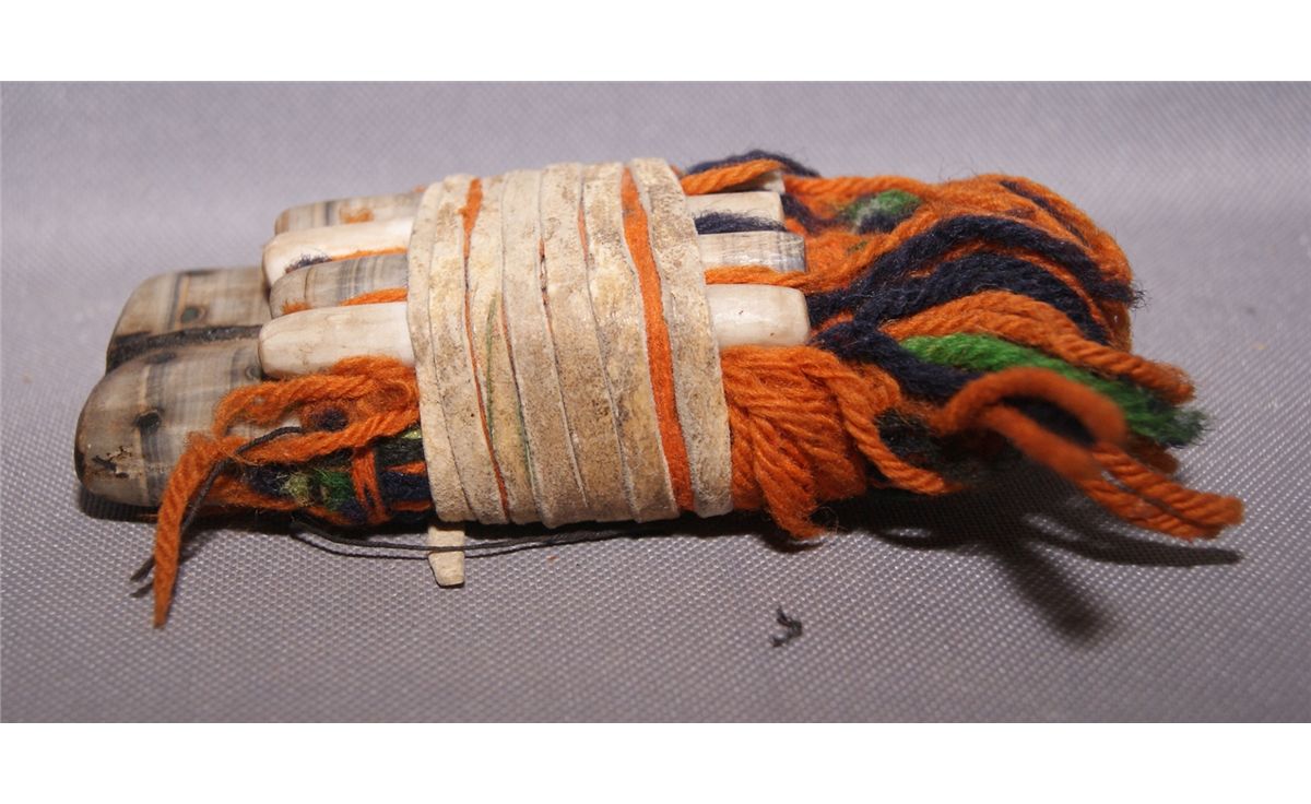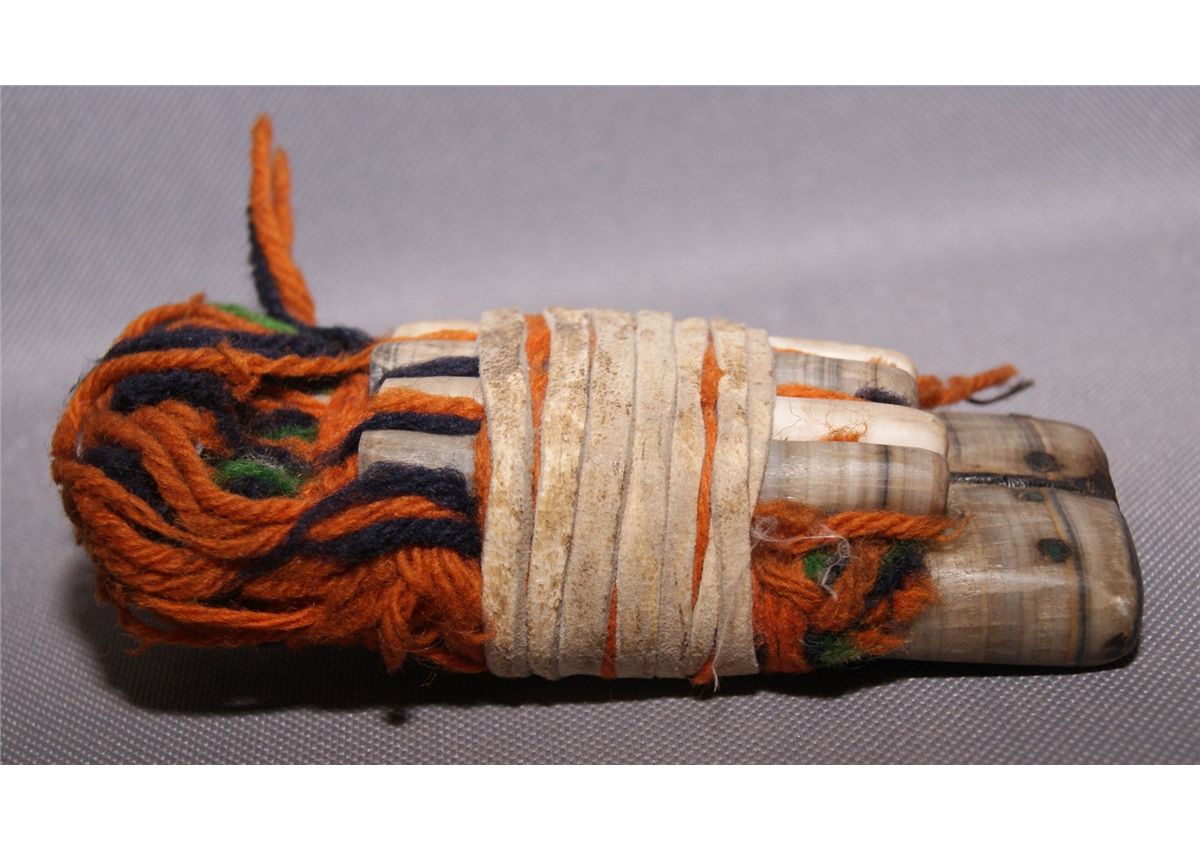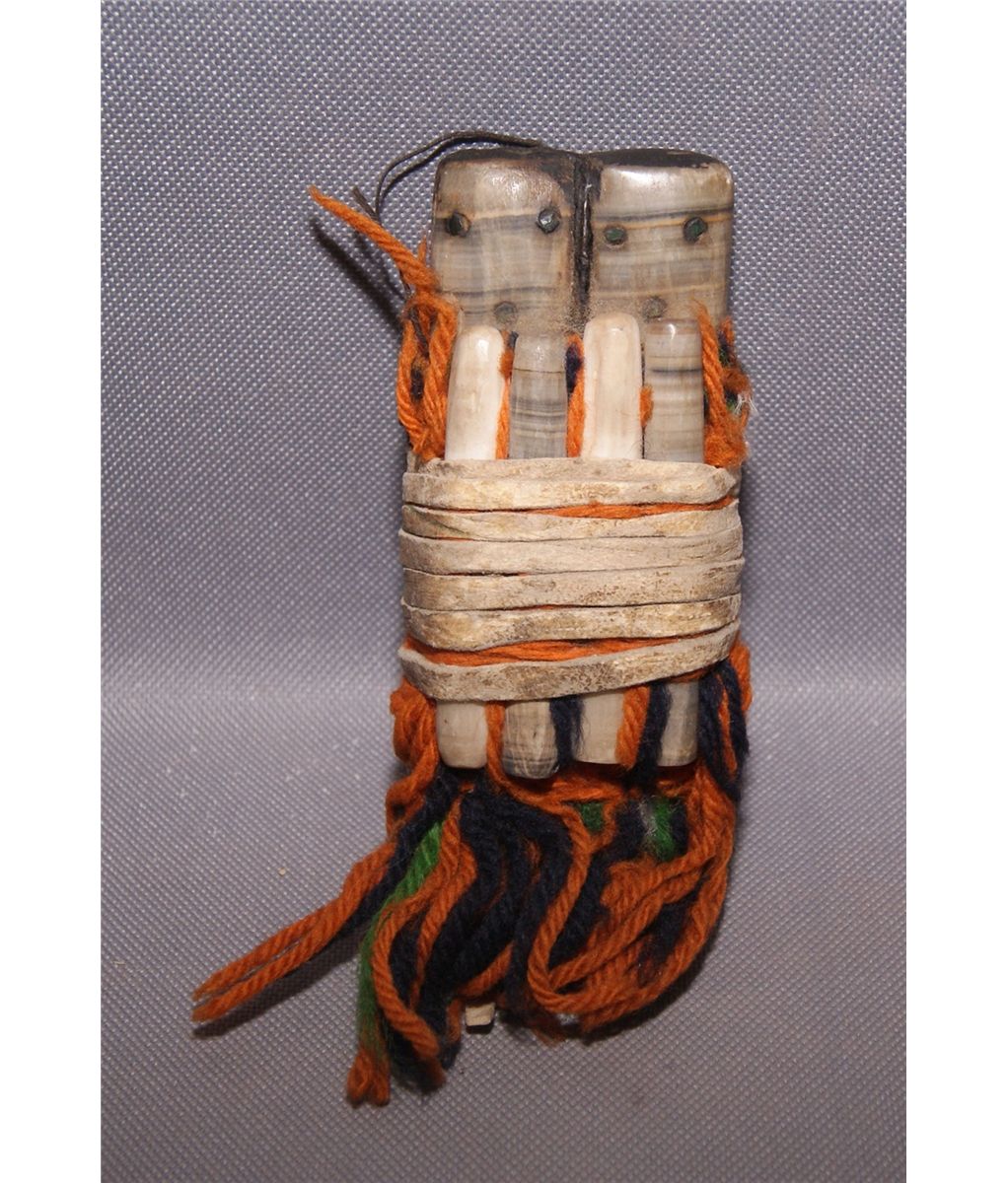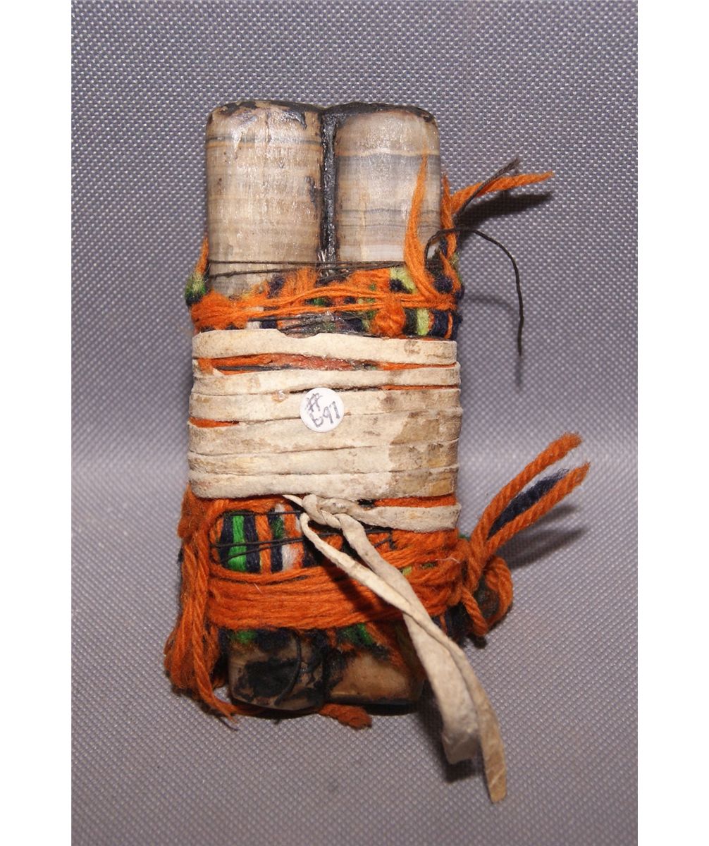 1940s 50s carved stone and Germantown yarn wrapped with leather, 4" x 2"