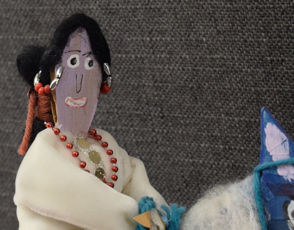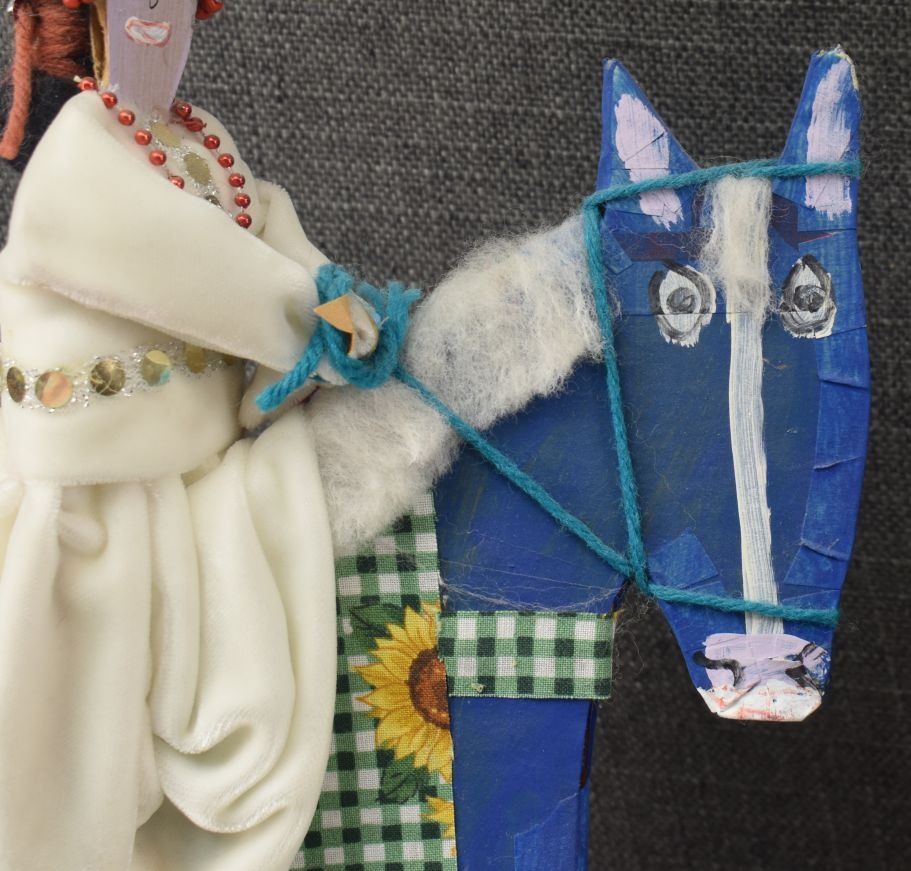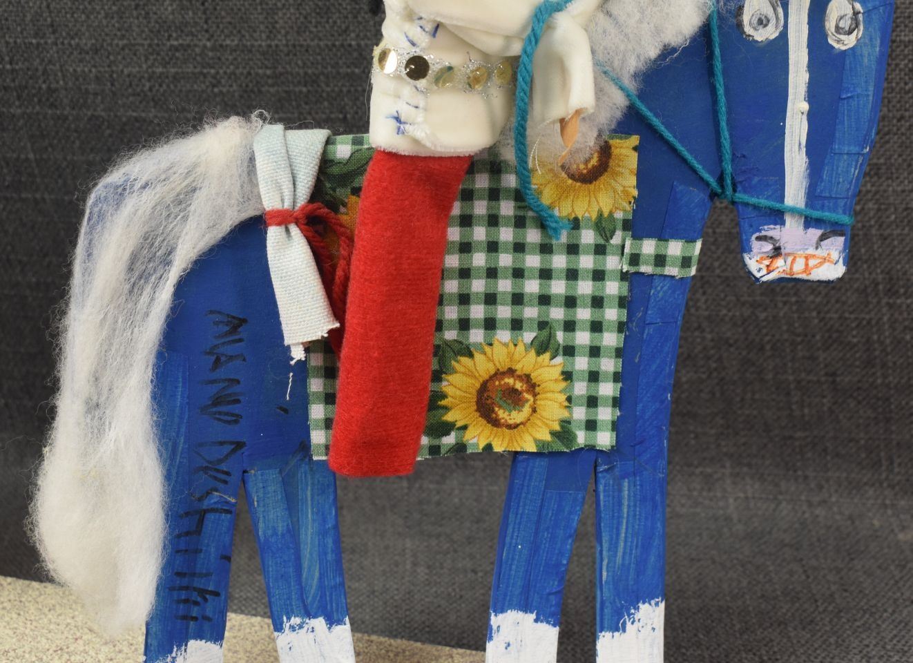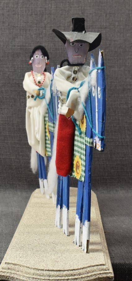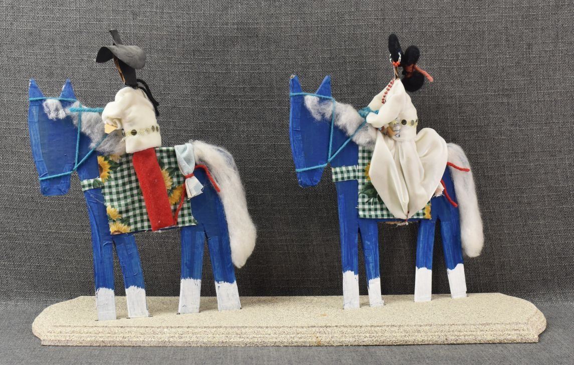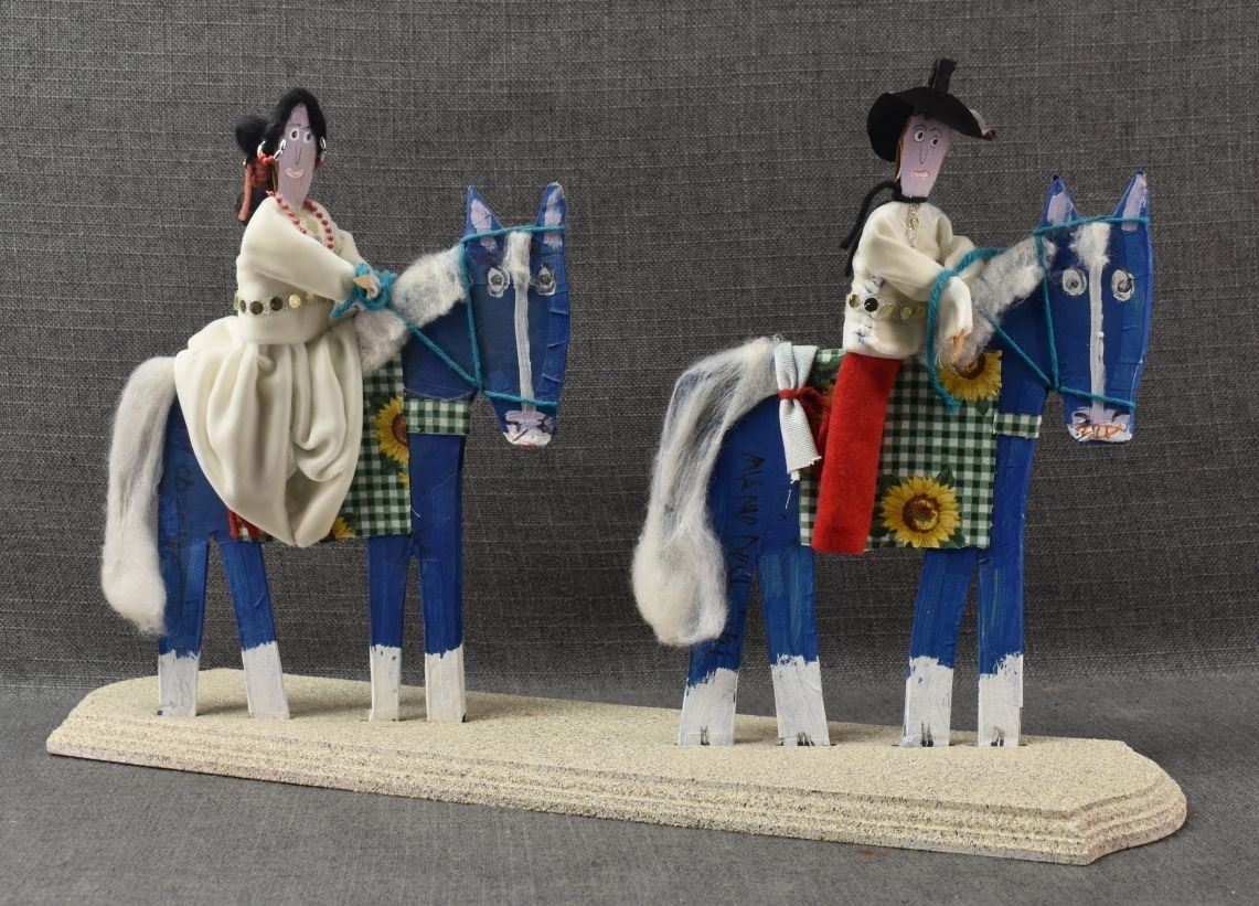 1990's Navajo, hand painted cardboard cutout with cloth clothing man and woman on horse by Mamie Deschillie 13" x 8.5" wooden stand 23" x 5.75"