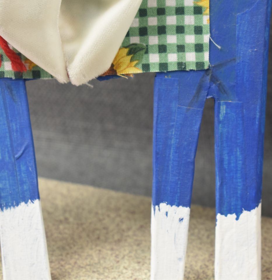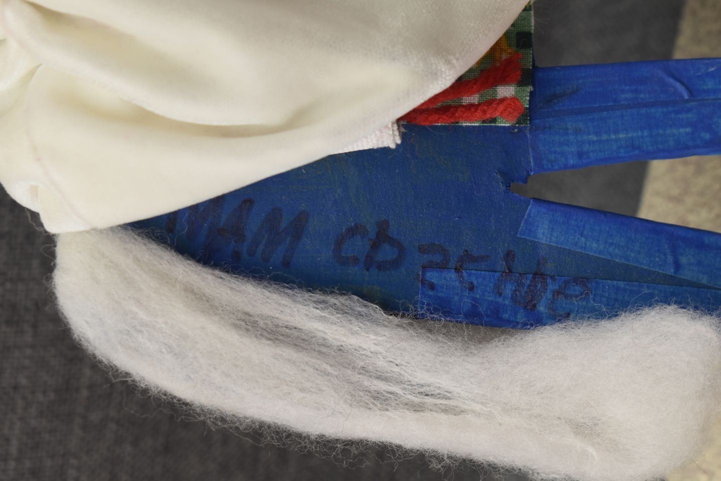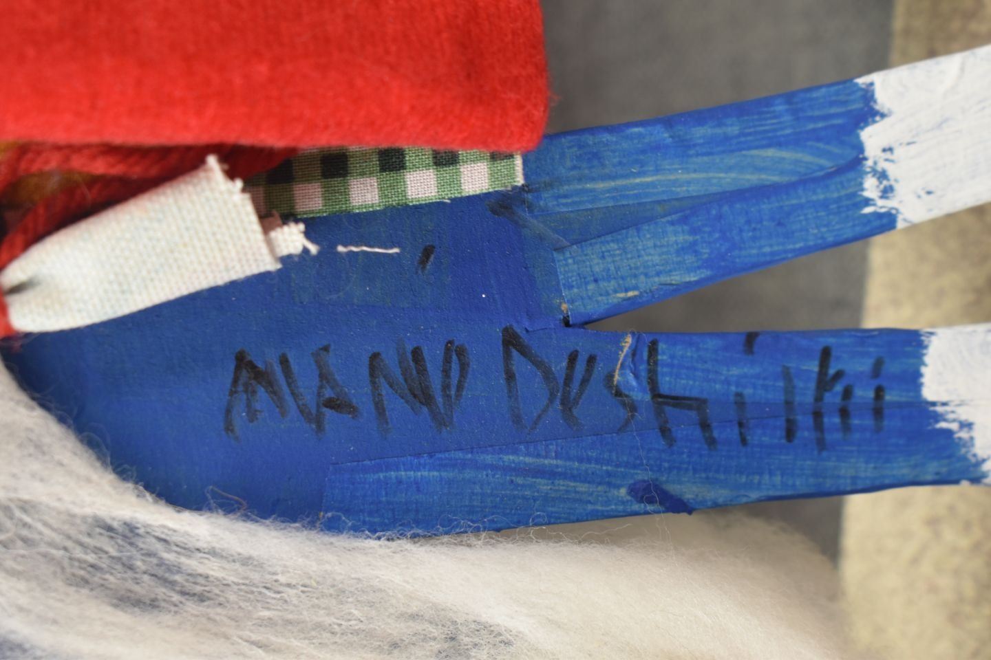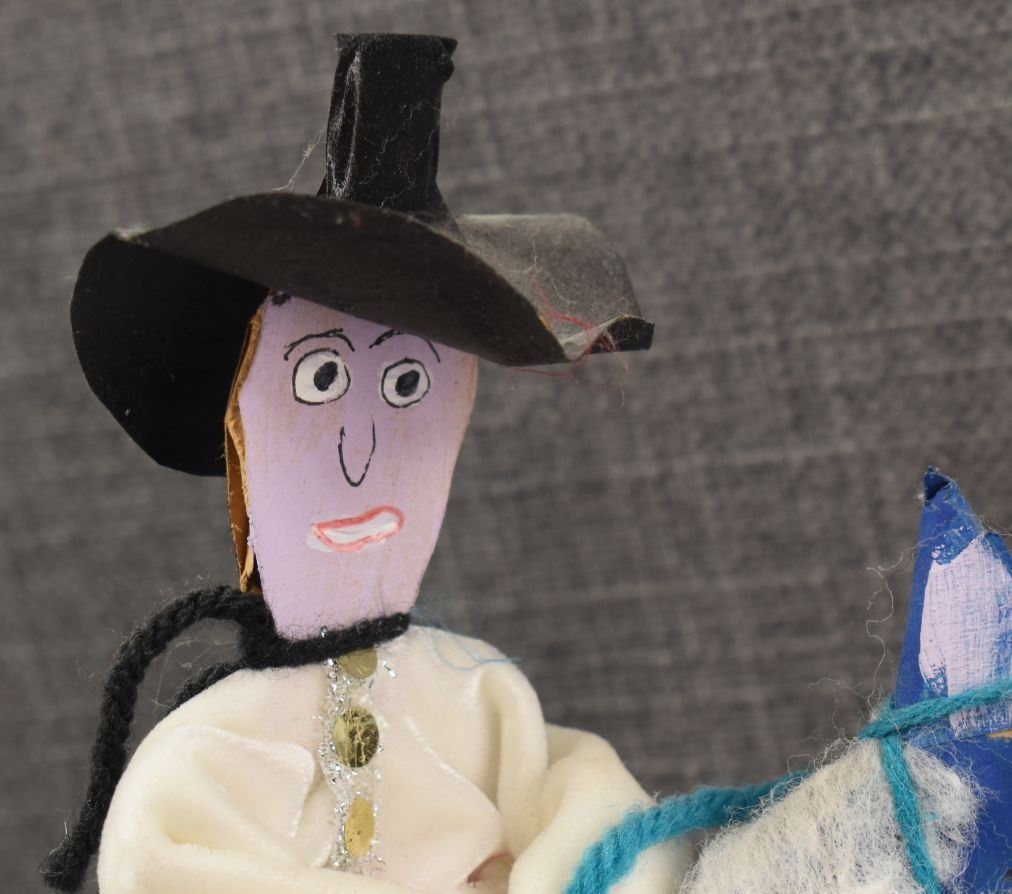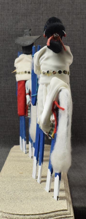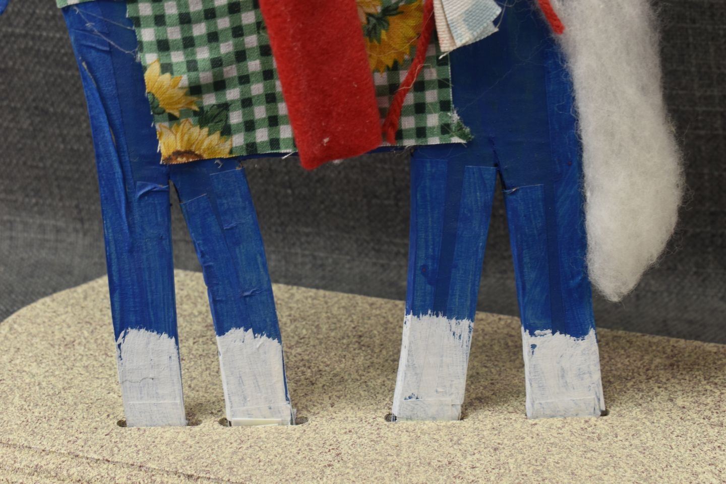 1990's Navajo, hand painted cardboard cutout with cloth clothing man and woman on horse by Mamie Deschillie 13" x 8.5" wooden stand 23" x 5.75"