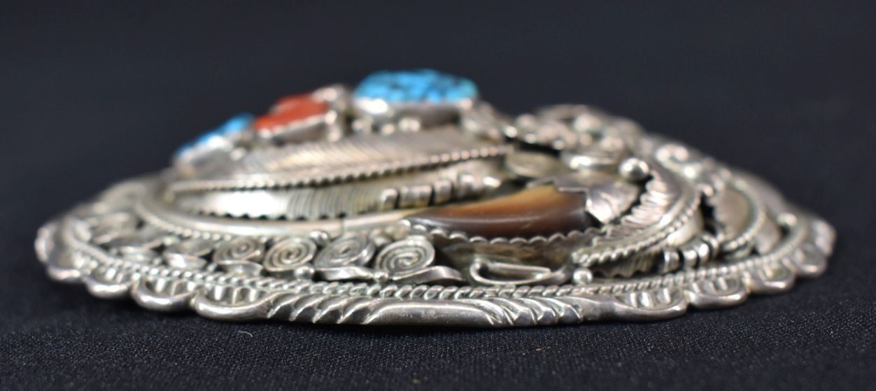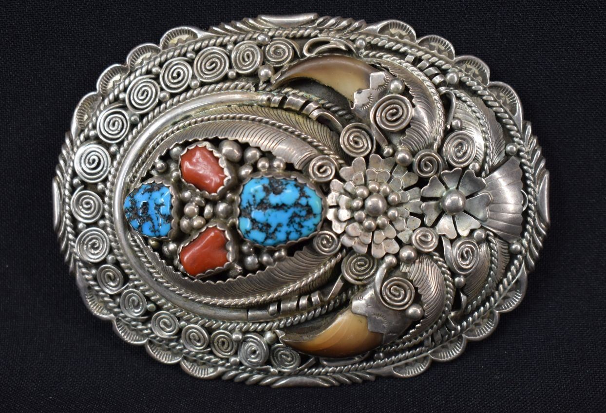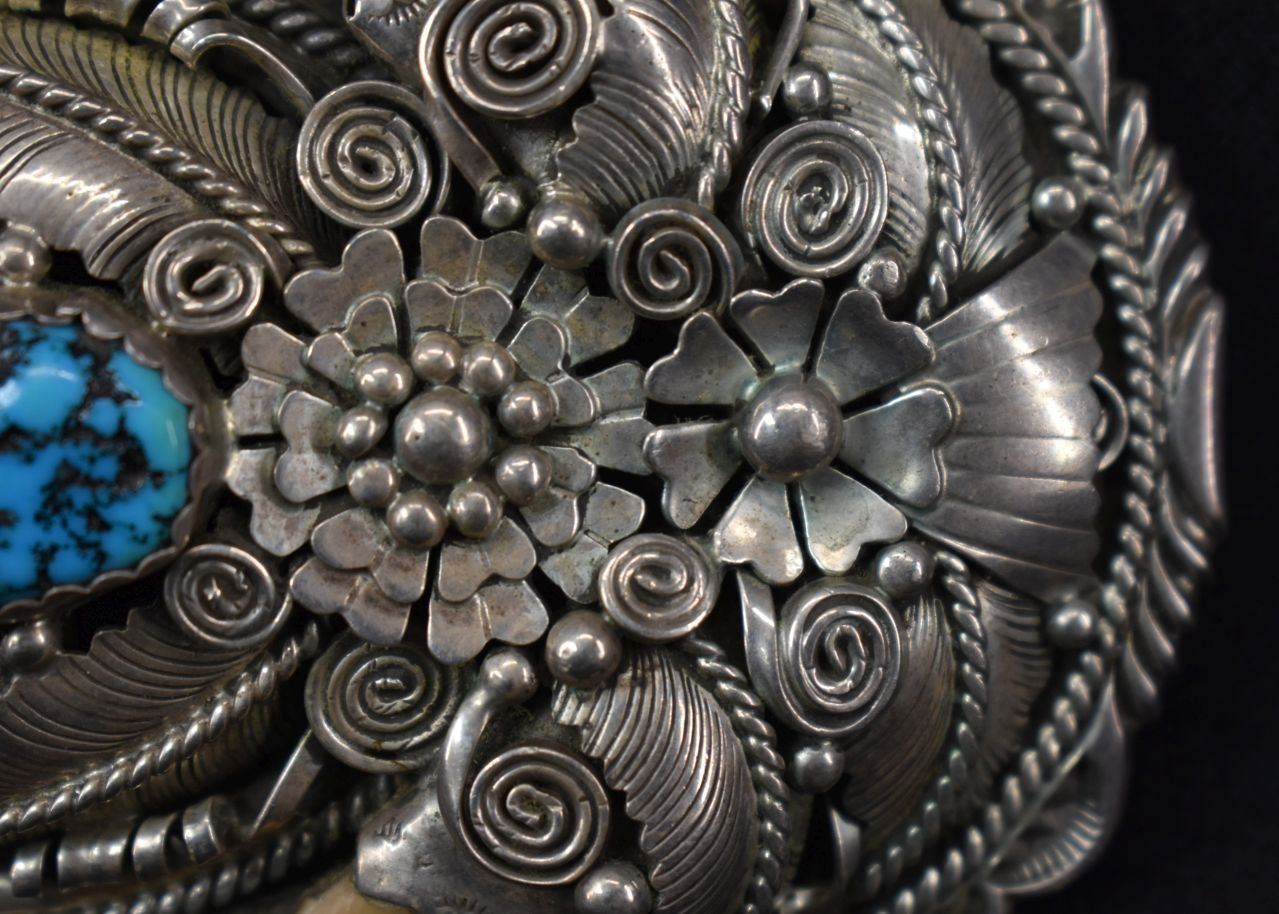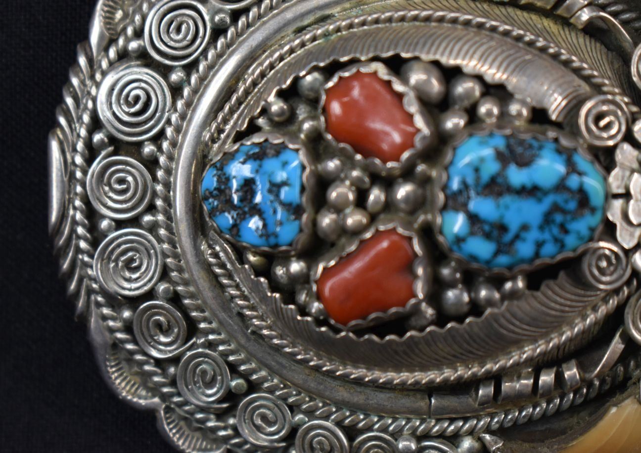 Damage that is visible in photos we do not note in description. Unless noted NO damage. All items have some amount of acceptable wear, scratches, nicks, etc. for their age. Bracelets measurements are width, inside circumference, opening. Weight on jewelry includes stones, leather from Concho belts and bolos removed when possible.
