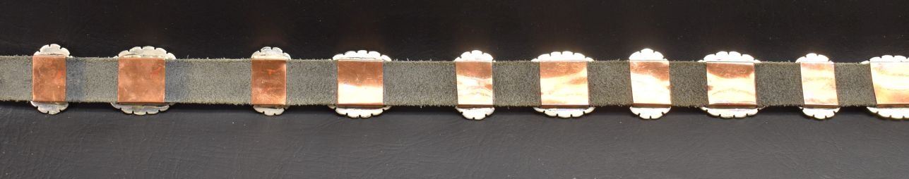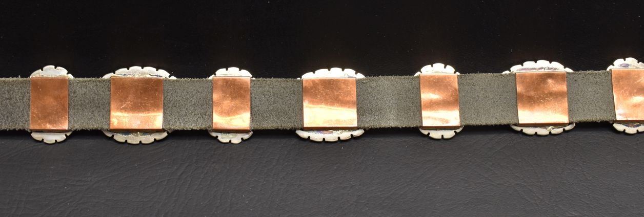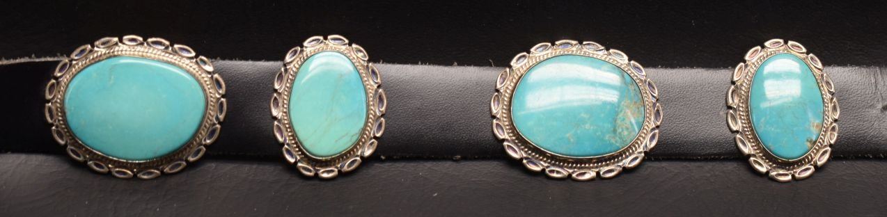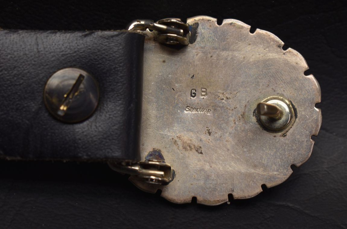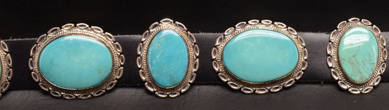 1980's Navajo Indian. Sterling silver and turquoise buckle 1.5'' x 2'' and eight Conchos. Nine Conchos 1.5'' x 1.5''. Total weight 405 grams excluding 1'' x 45'' leather belt.