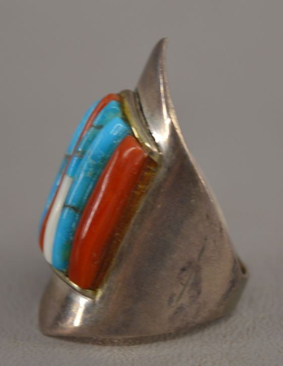 1970's Navajo Indian. Sterling silver turquoise coral and shell necklace 18'' long. Bracelet 1.25'' x 5'' x 1''. Ring size 7and earrings .75'' x 1.5''. Total weight 208 grams