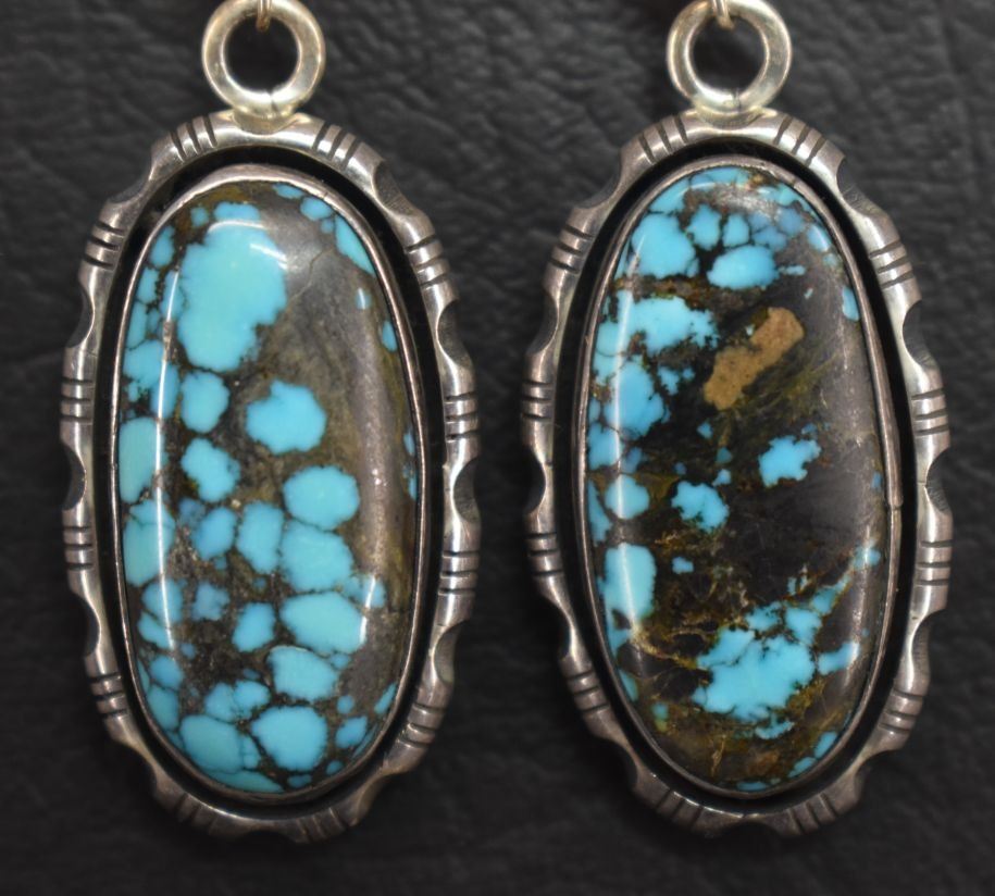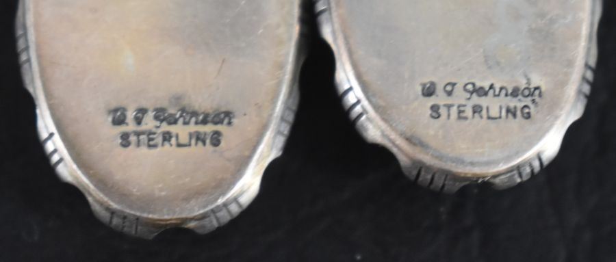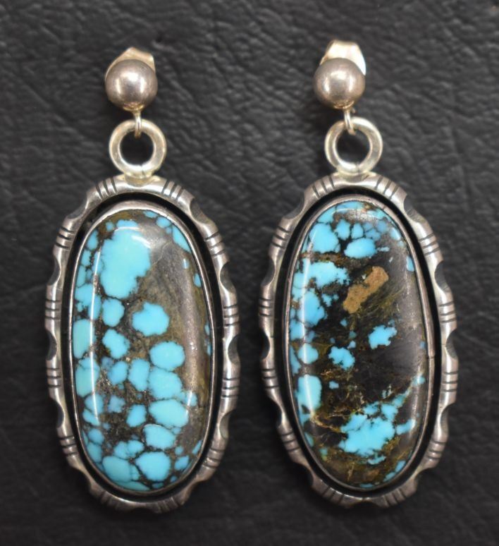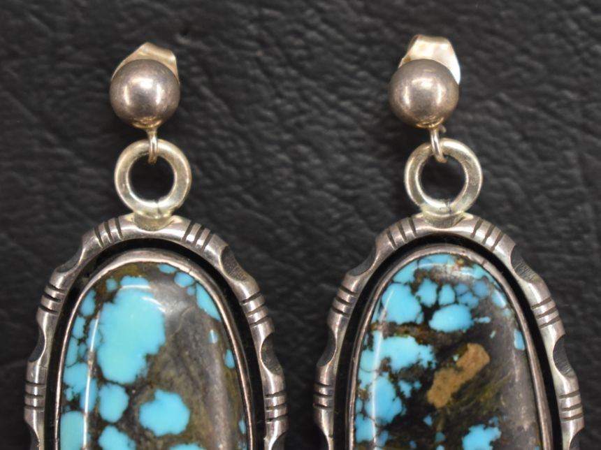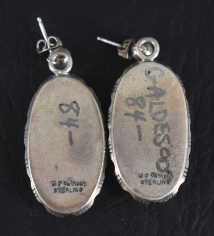 1980's Navajo Indian. Sterling silver and turquoise earrings, marked Johnson, 1.75'' long. Total weight 18 grams