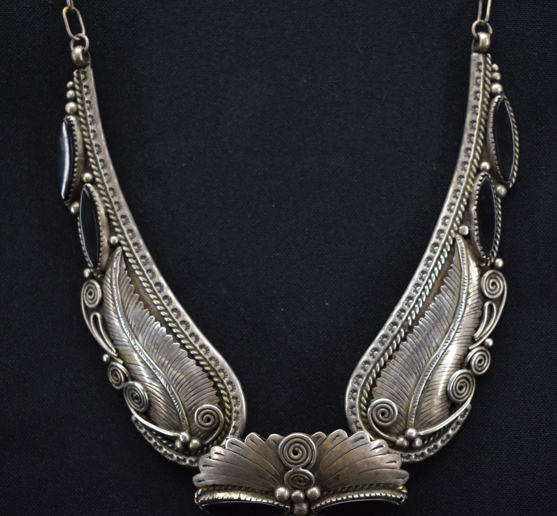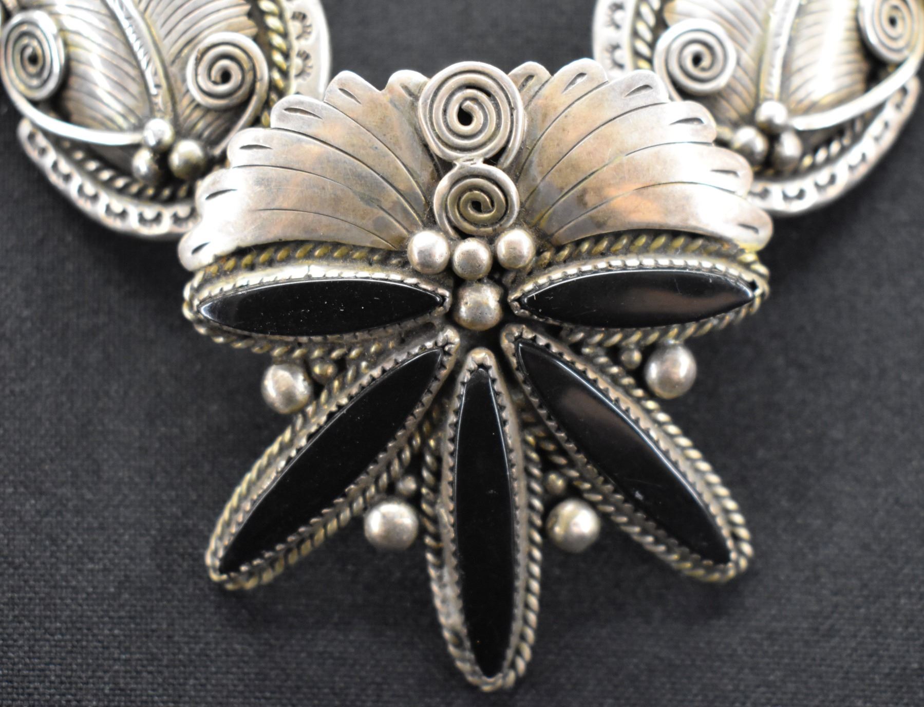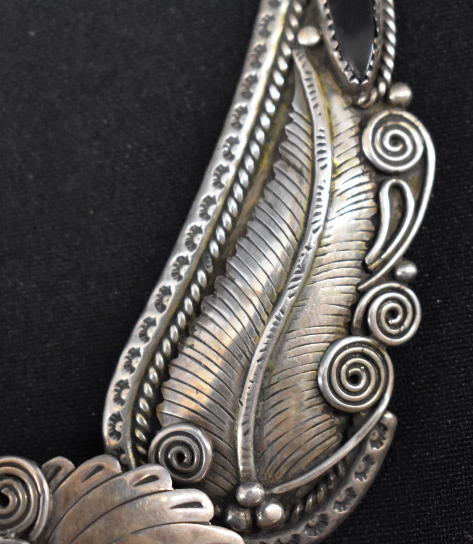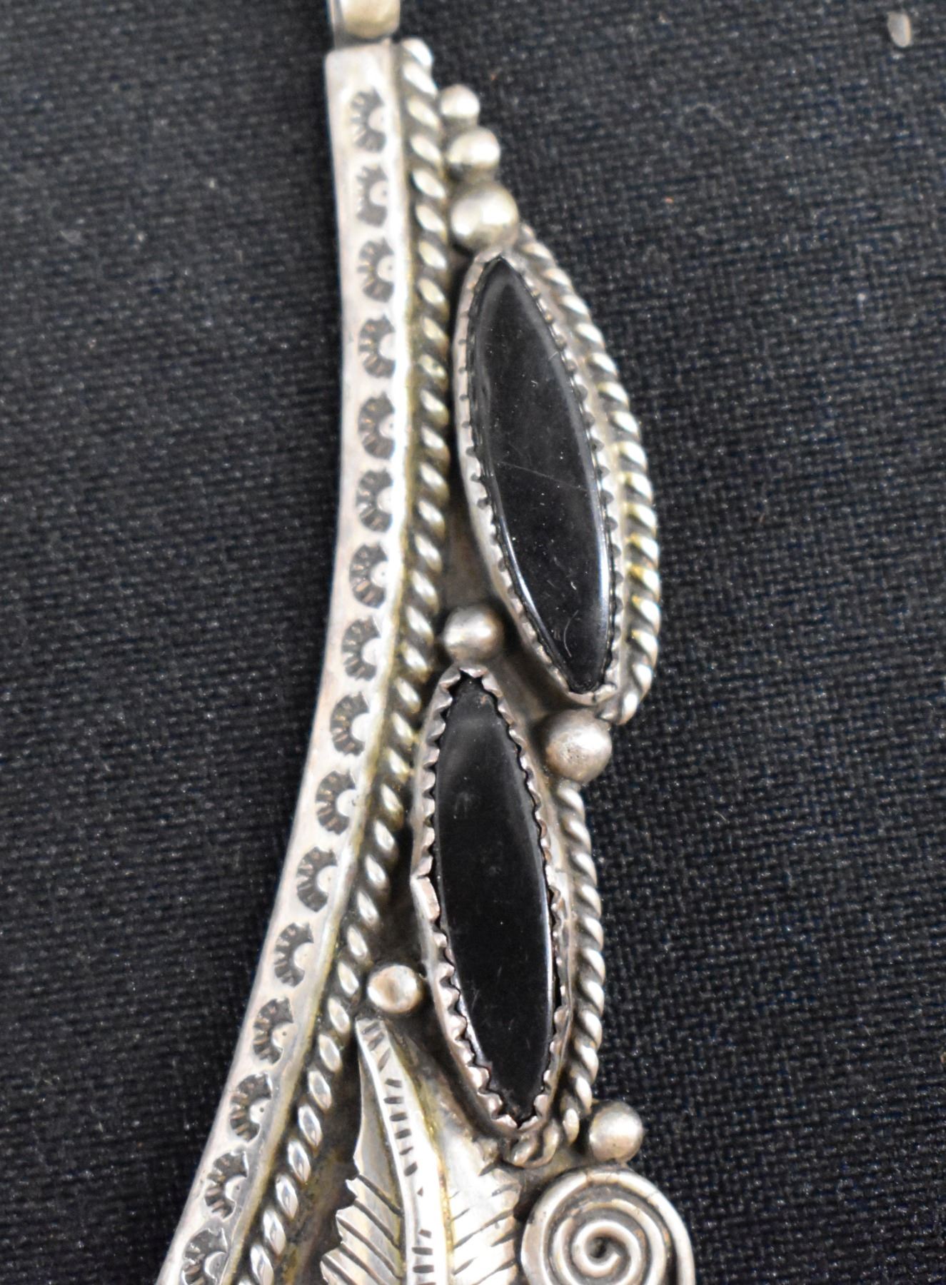 1970's Navajo Indian, sterling silver and jet necklace 20'' long. pendant 2'' x 2''. Total weight 82 grams