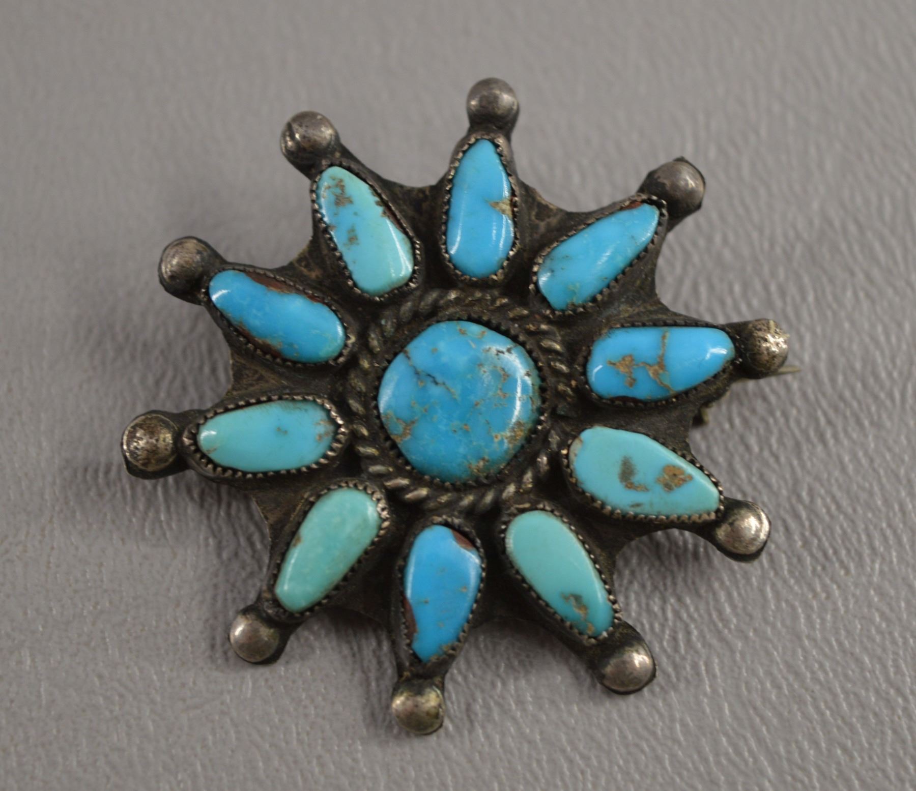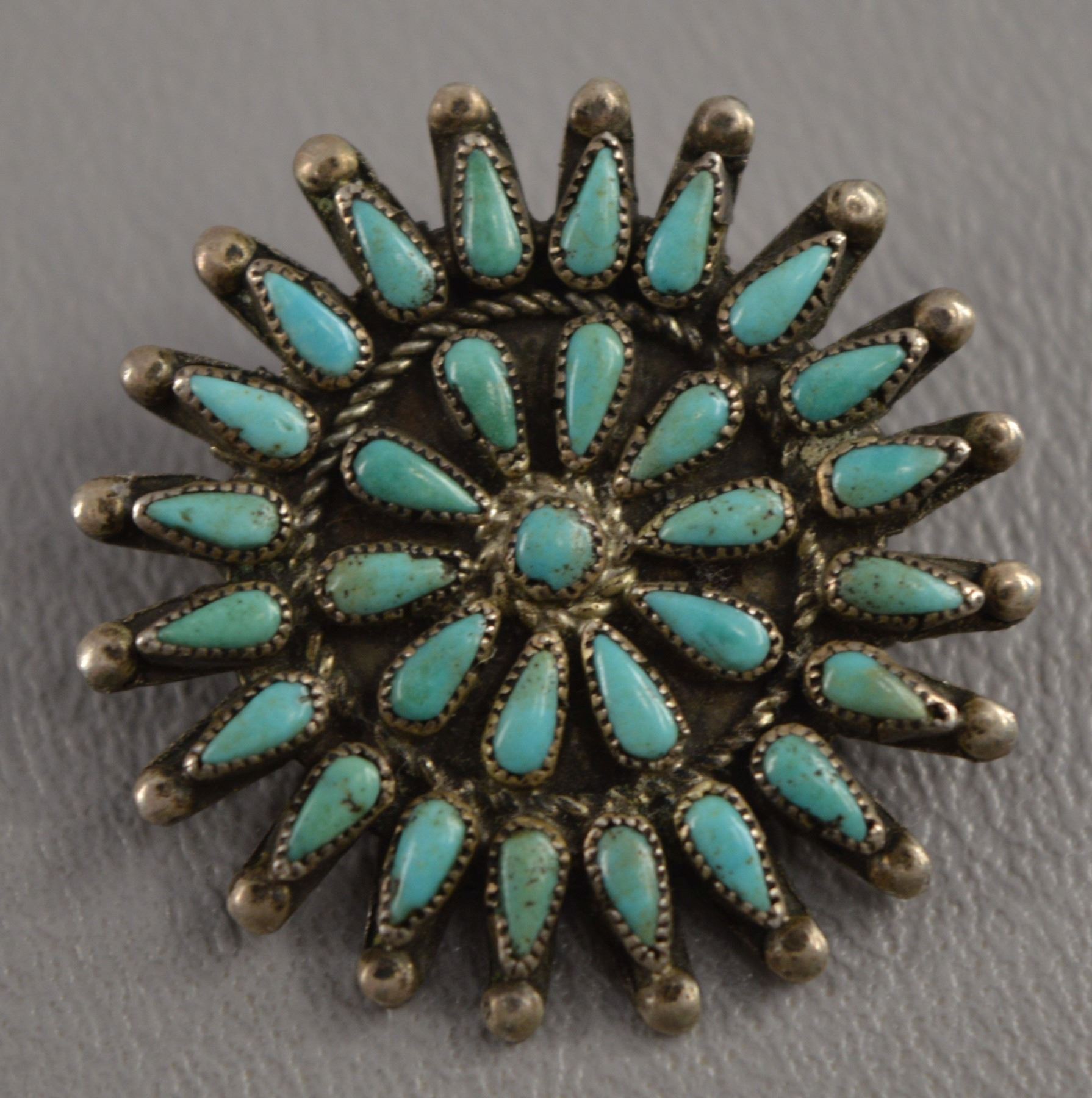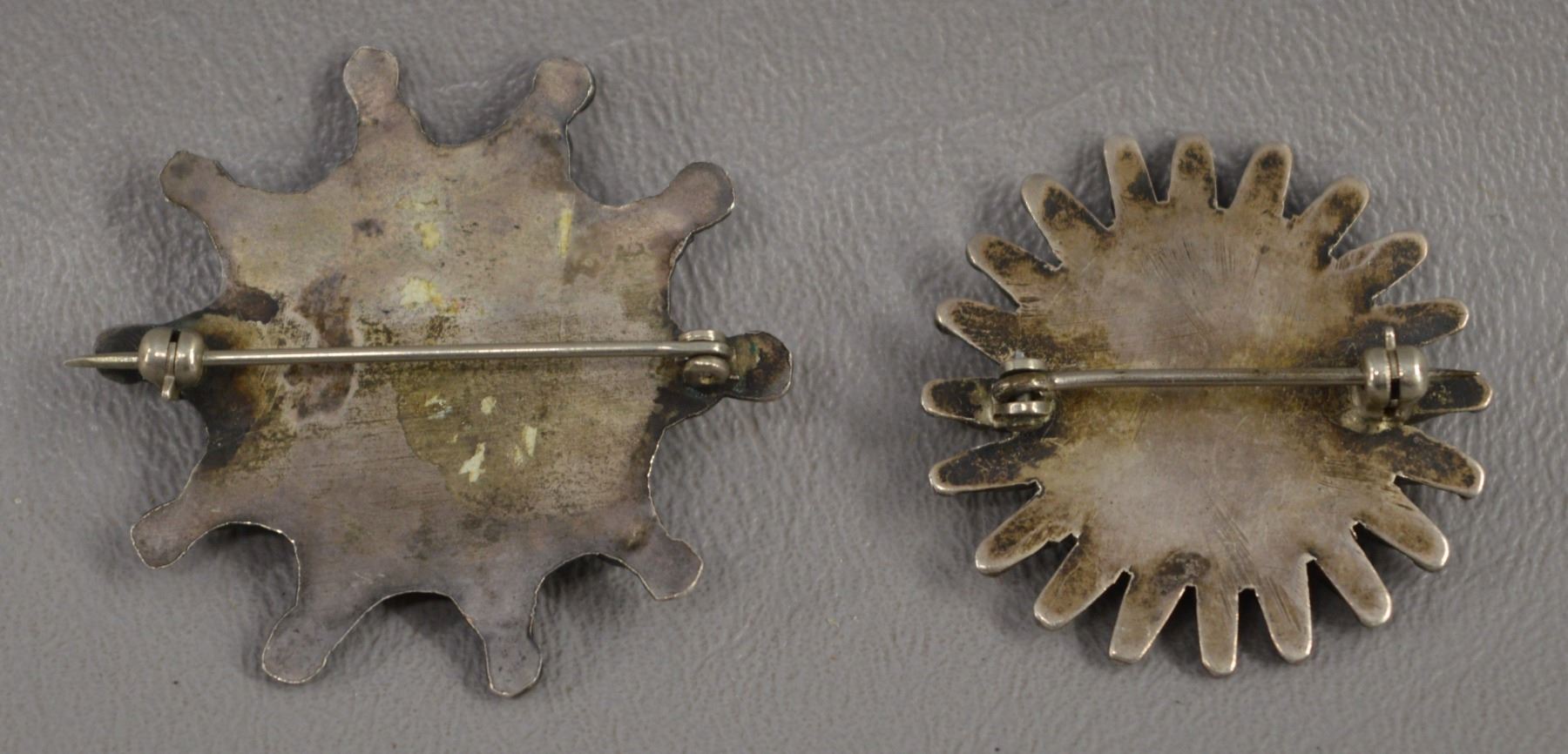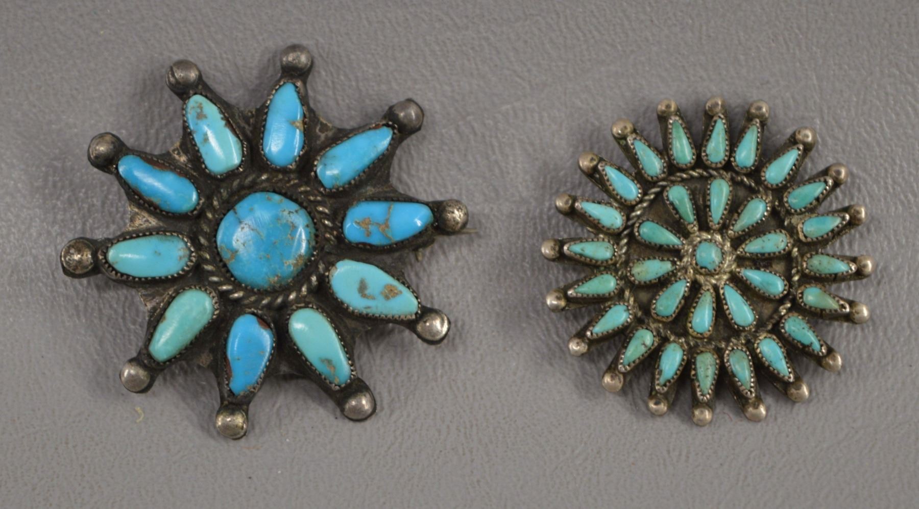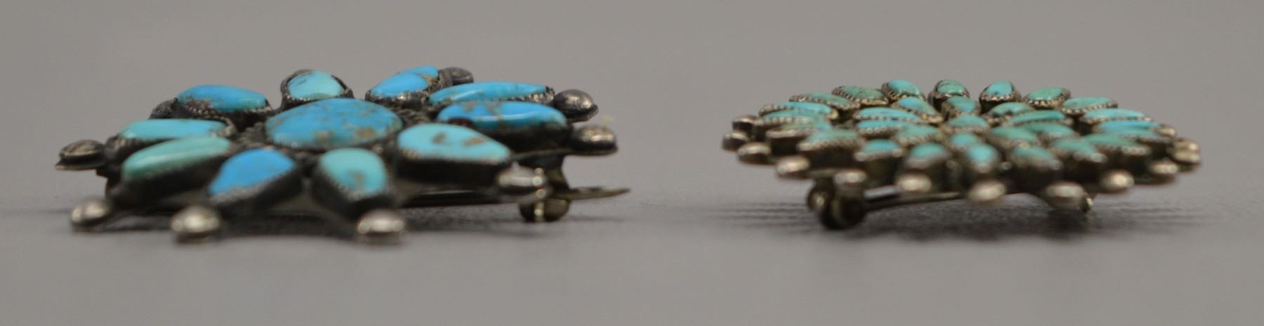 1970's Navajo Indian. Sterling silver and turquoise pins 1.5'' and 1.25'' dia. Total weight 14 grams