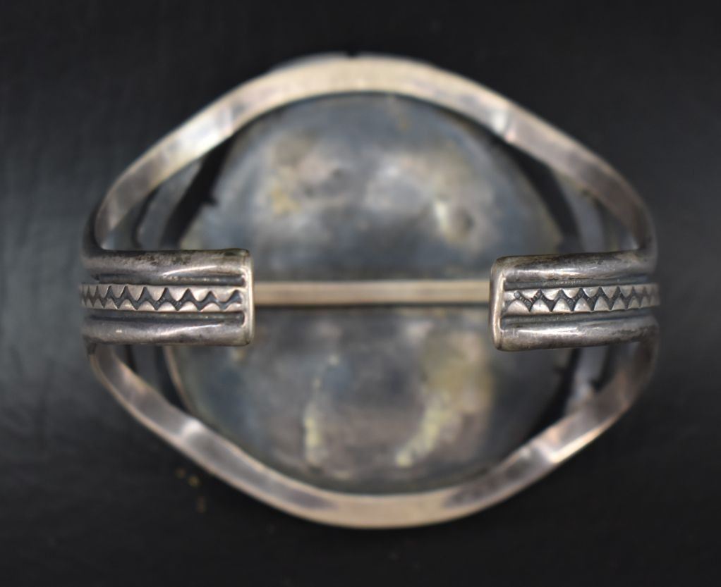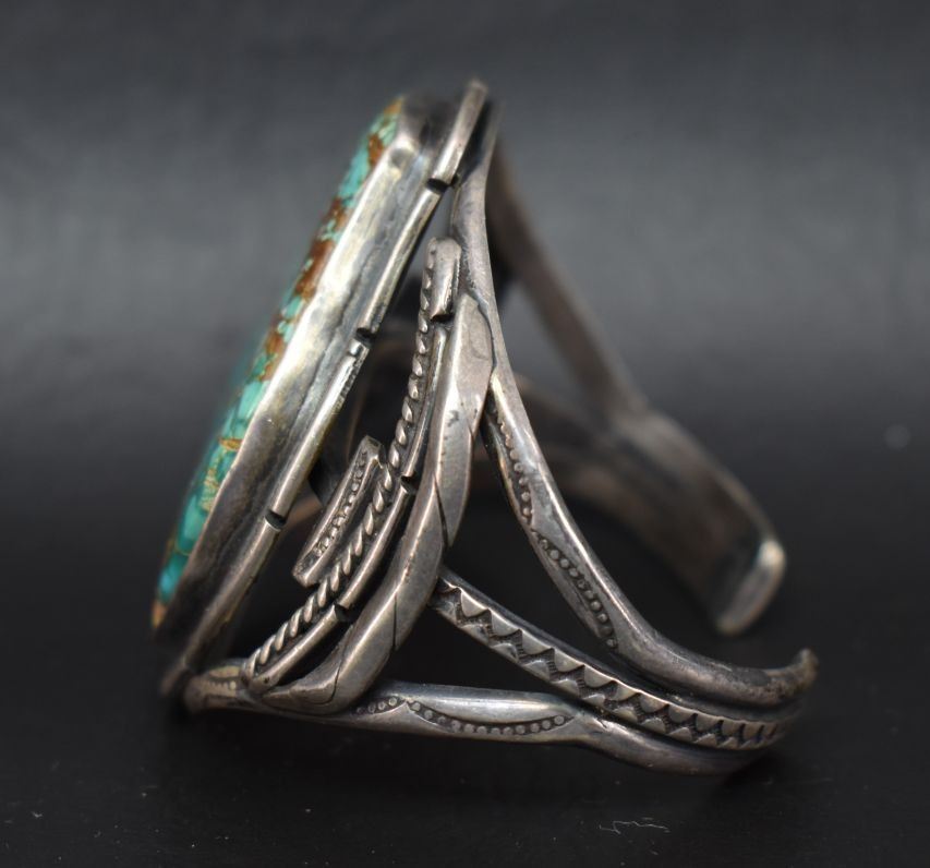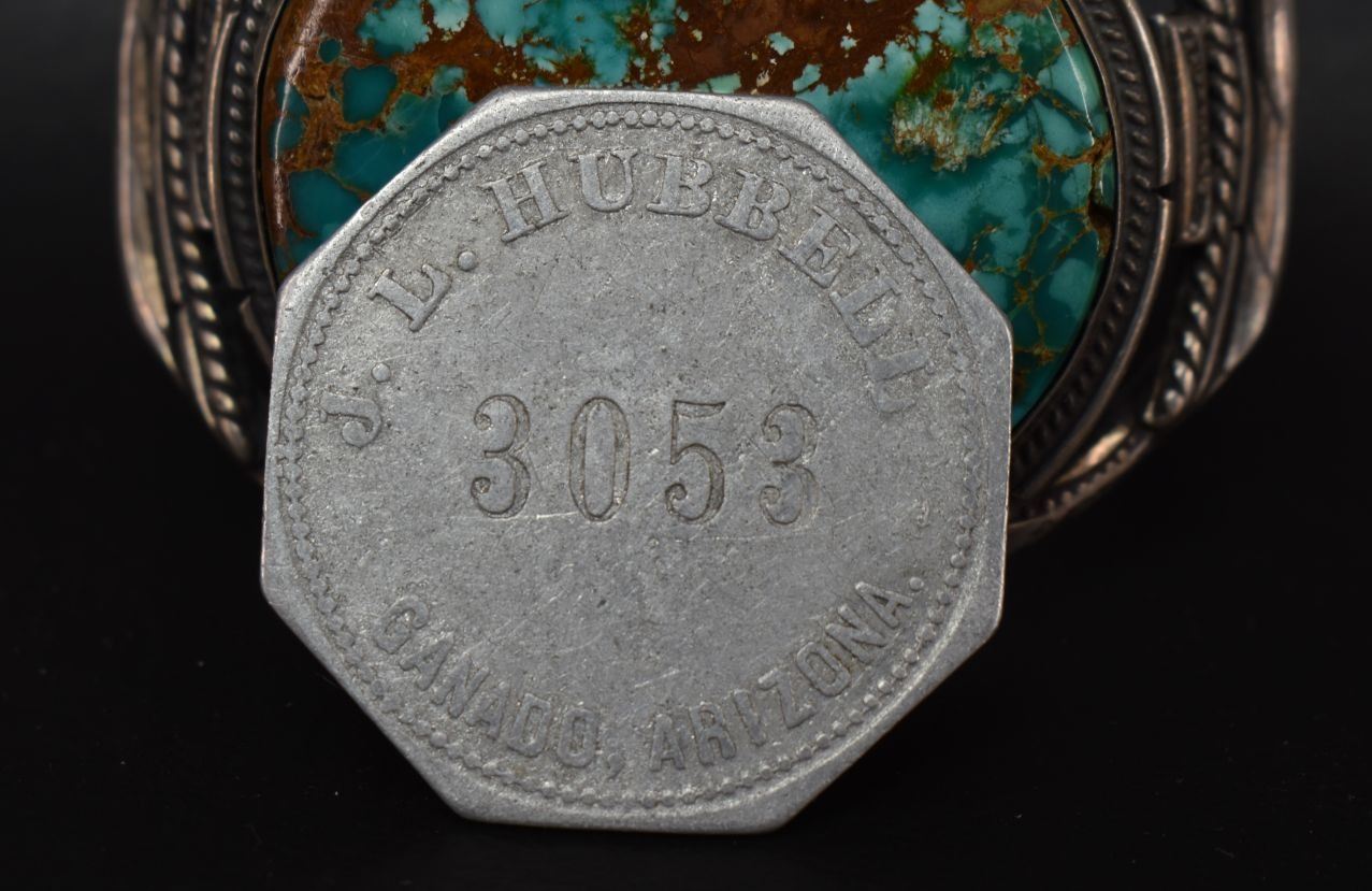 1950-60's Navajo Indian sterling silver with hand stamped design and large turquoise stone 2.25" x 5.75" x 1" total weight 90 grams includes J.L. Hubbell Trading post Token