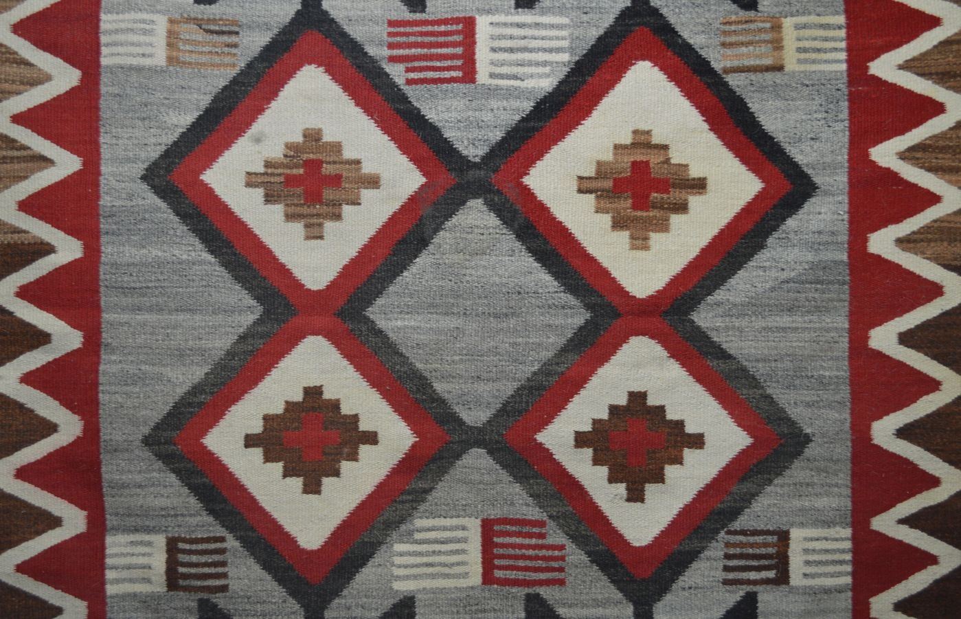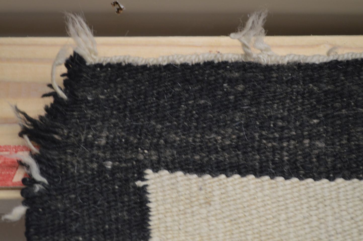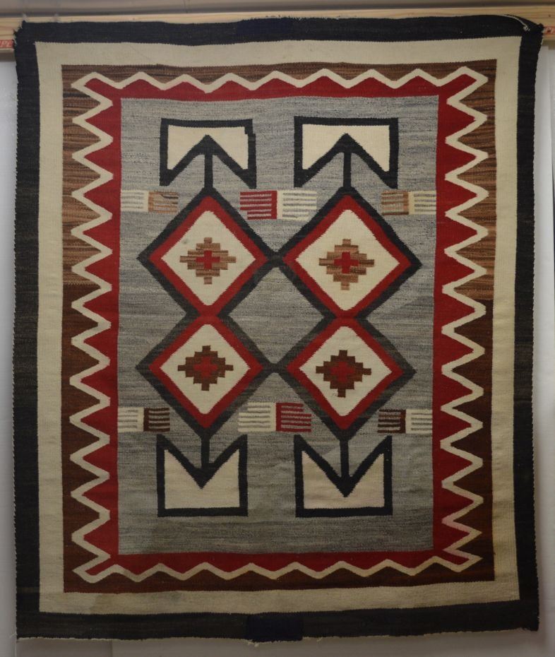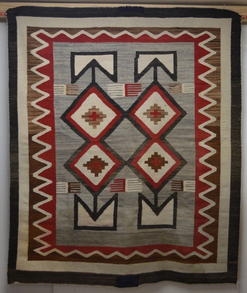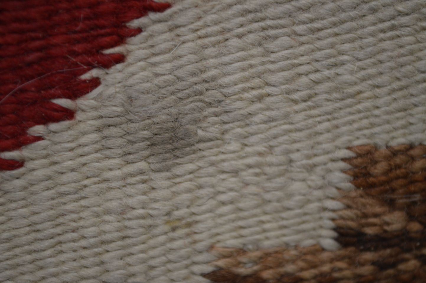 1930's Navajo Indian. Hand woven geometric design has bleed, stains and damaged ends. 54'' x 60''