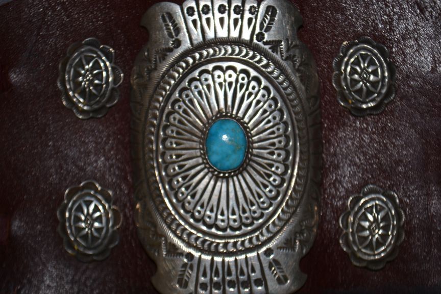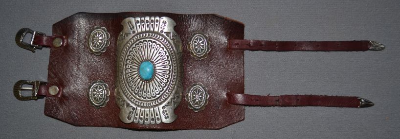 contemporary sterling silver stamped design single turquoise stone has sterling silver buckles and tips 4" x 7"