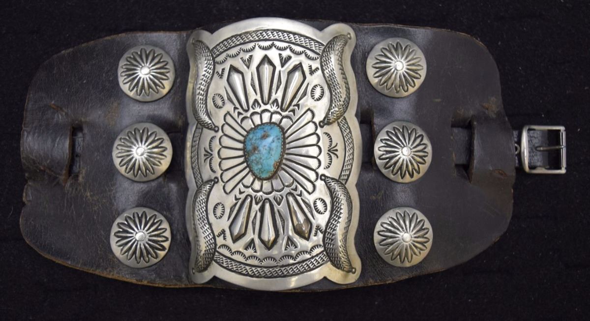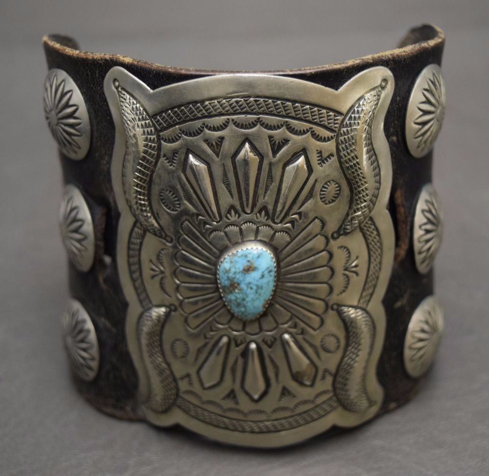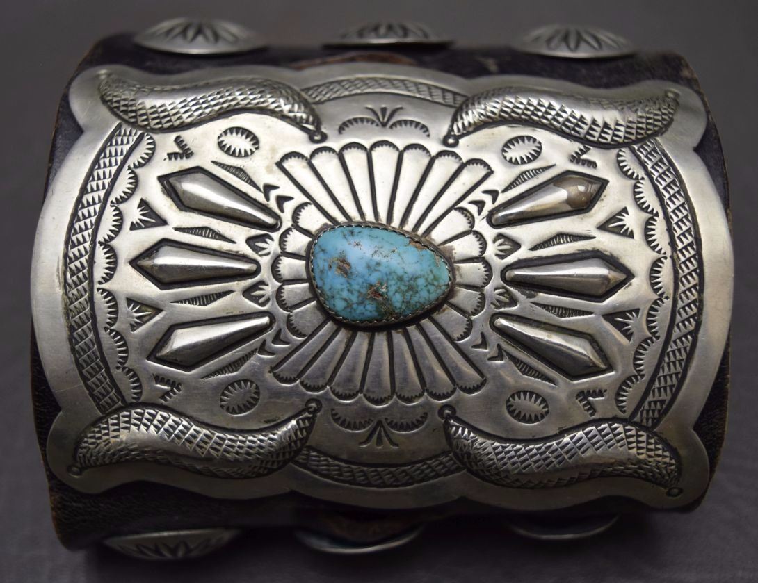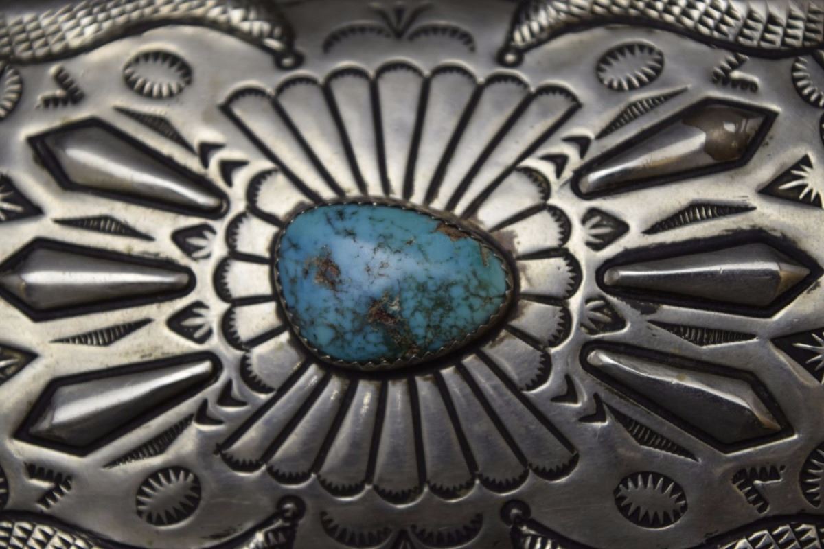 1970's silver plate stamped design with single turquoise stone 4'' x 8'' over all total weight 119 grams