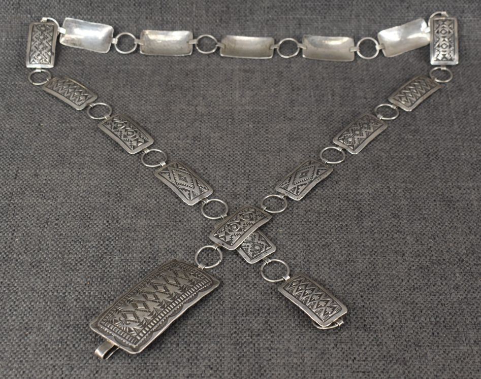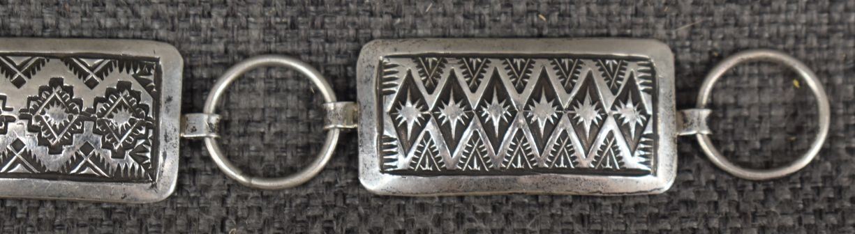 1990's Navajo. Sterling silver buckle 1.5'' x 3'' and sixteen conchos .75'' x 1.5'' total weight 173 grams 41'' long