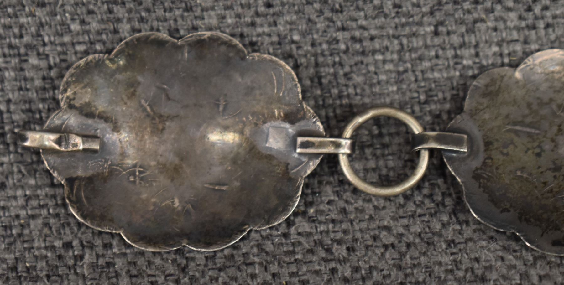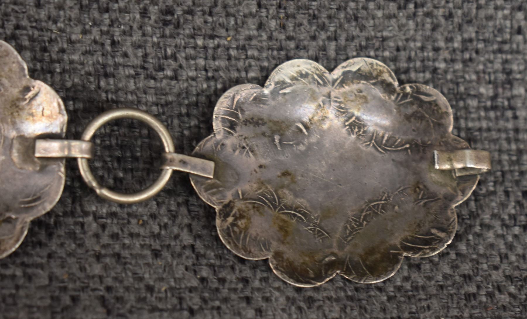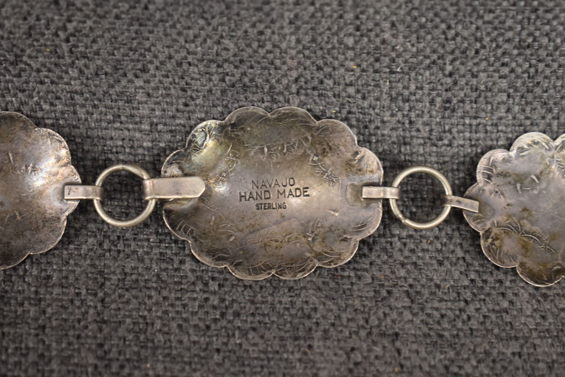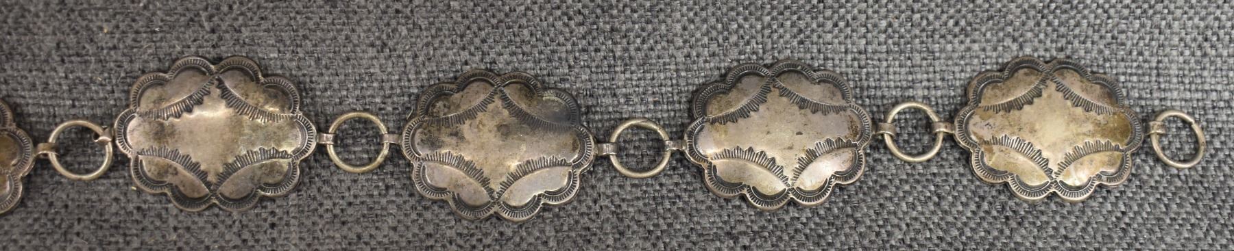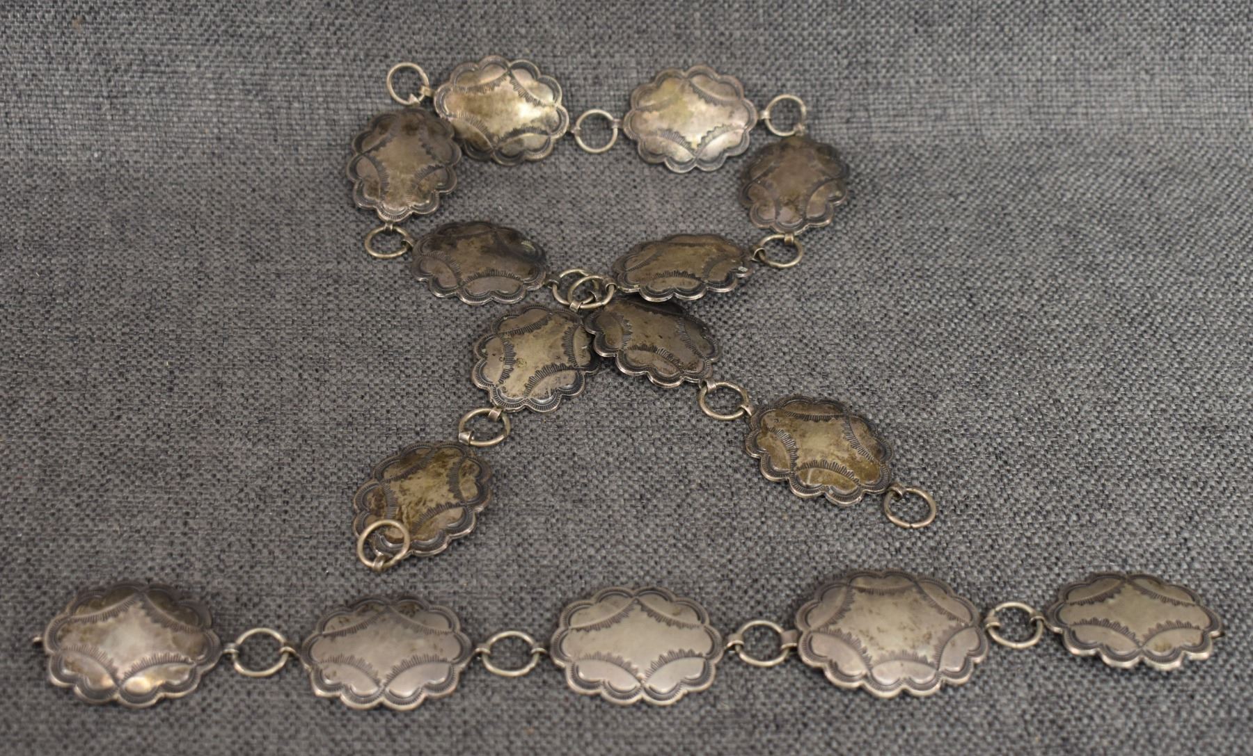 1960's Navajo. Fifteen Sterling silver conchos 1.5'' x 1.75'' . Belt length 34'' . Total weight 145 grams