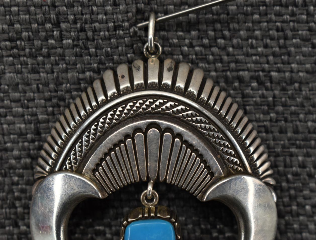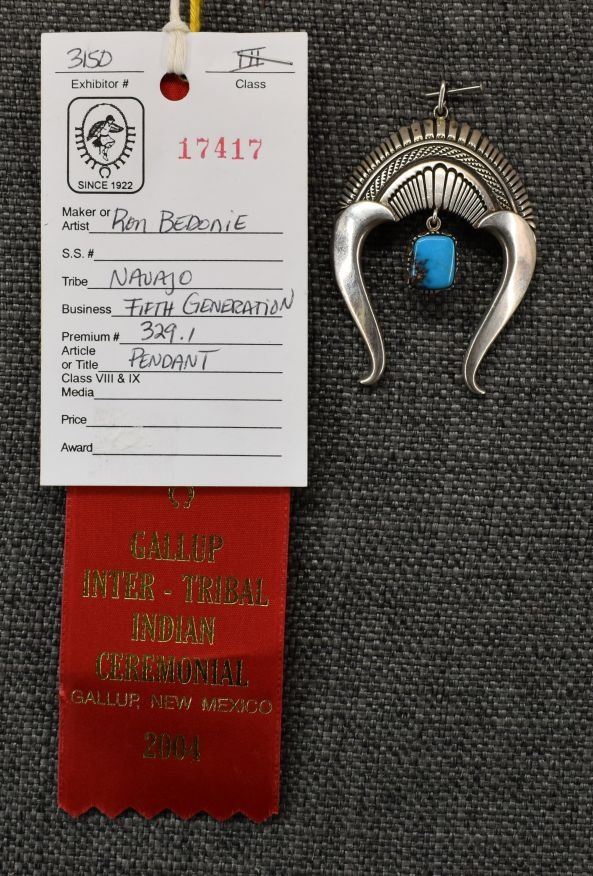 2004 Navajo, sterling silver hand stamped design with turquoise stone by Ron Bedonie 2.75" x 1.75" total weight 26 grams. Includes second place ribbon from Gallup Intertribal Indian Ceremonial