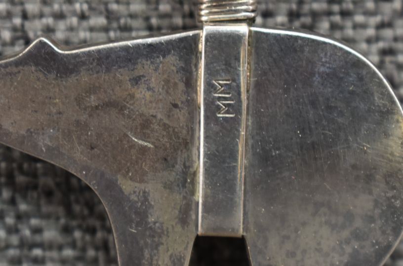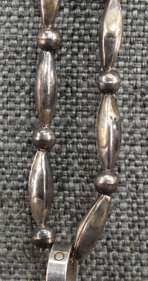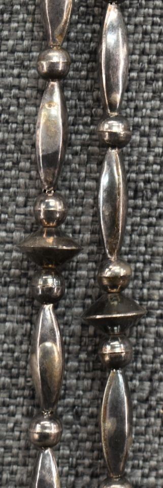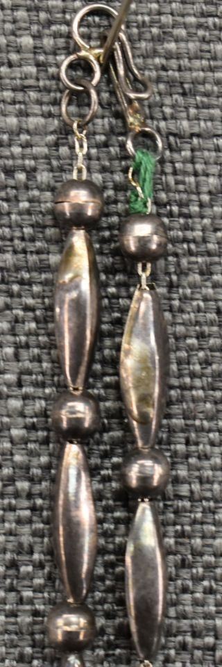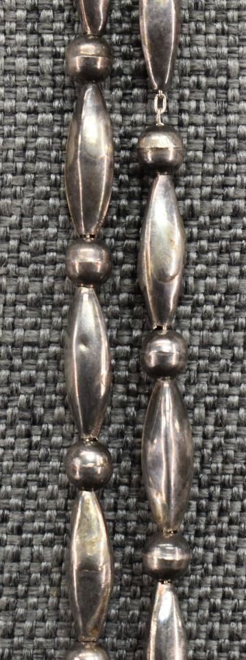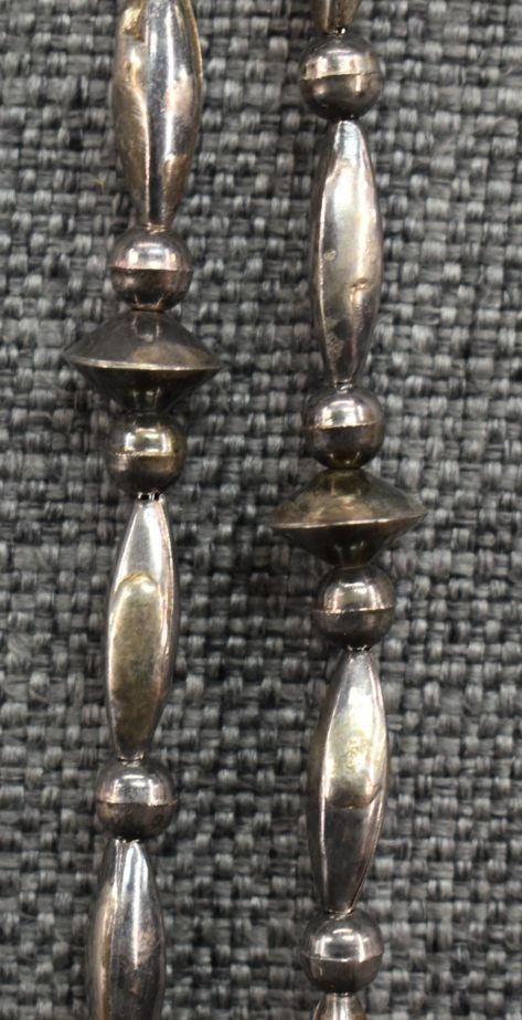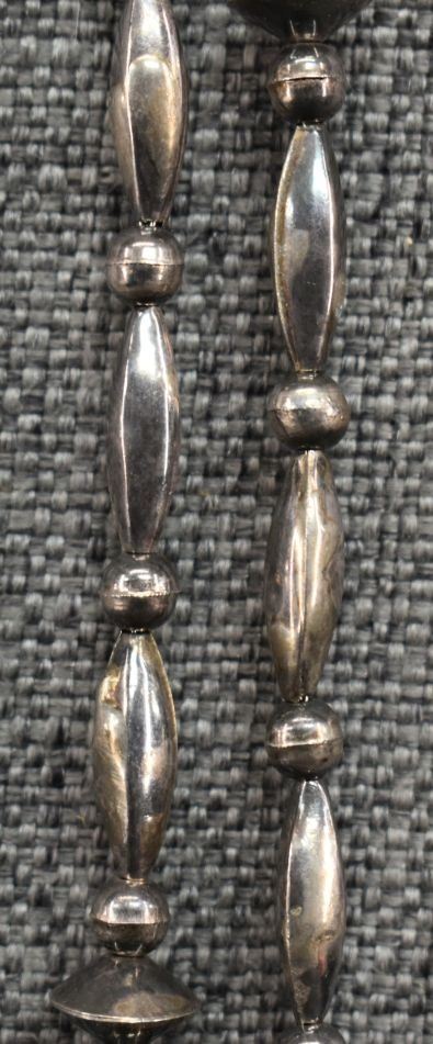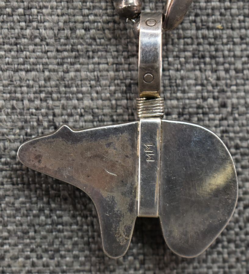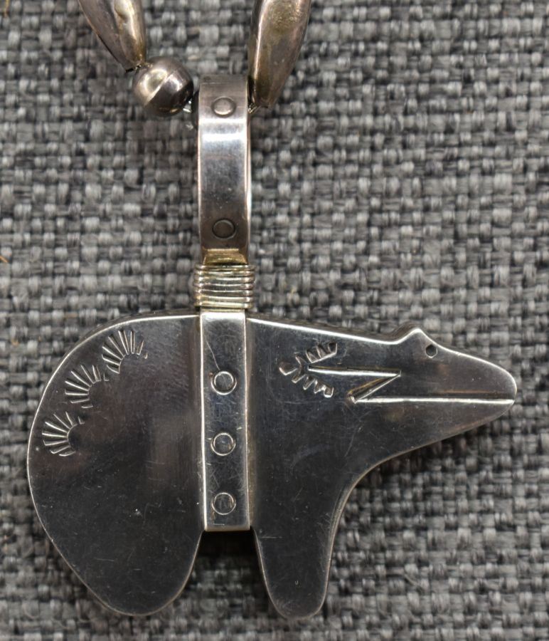 1970's Navajo sterling silver bead necklace 26'' long bear pendant. Signed MM. 2'' x 2'' total weight 48 grams
